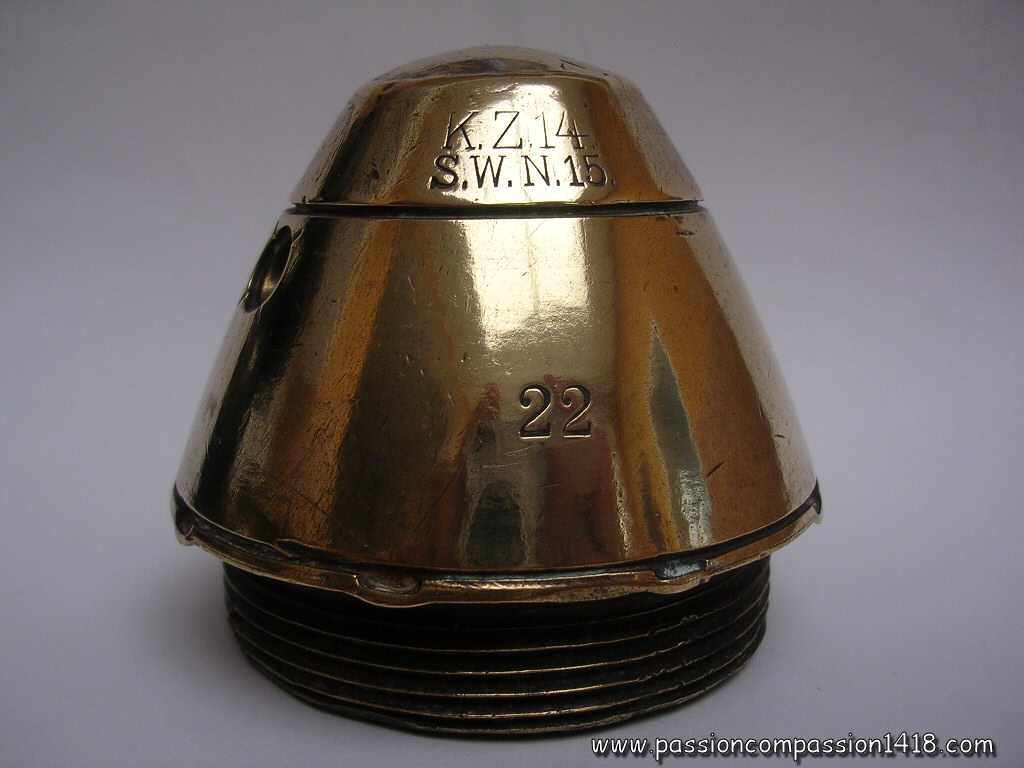 KZ 14 fuze. made in brass, markings 'HZ 14 0 - SWN 15 - 381' |