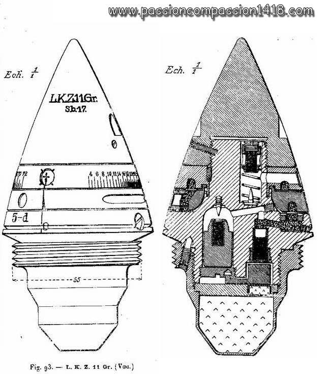 The sophisticated 'KZ 11' fuze for the German universal shell, appeared in 1911, introduced both a new two components arming system (mobile primer pellet and percussion system safety by stem and gunpowder pellet), and a new percussion graze action system (axial mobile graze pellet and static percussin pin, safety spring and safety stem blocking) that will be used by numerous German fuzes.