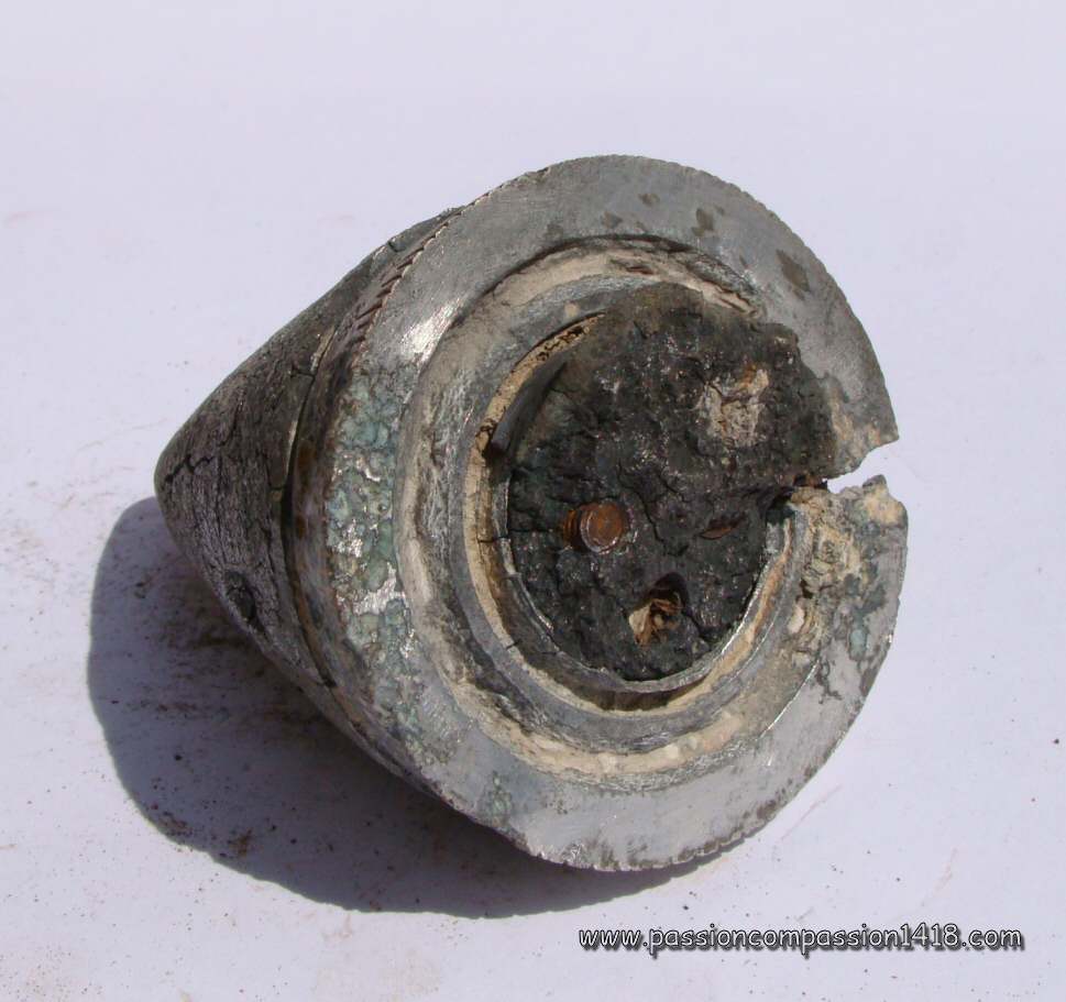 Fuze ZsumWM. The upper parts, in aluminium alloy, are highly corroded. The 'fest' screw on the tail seems to be a variant. No markings visible |