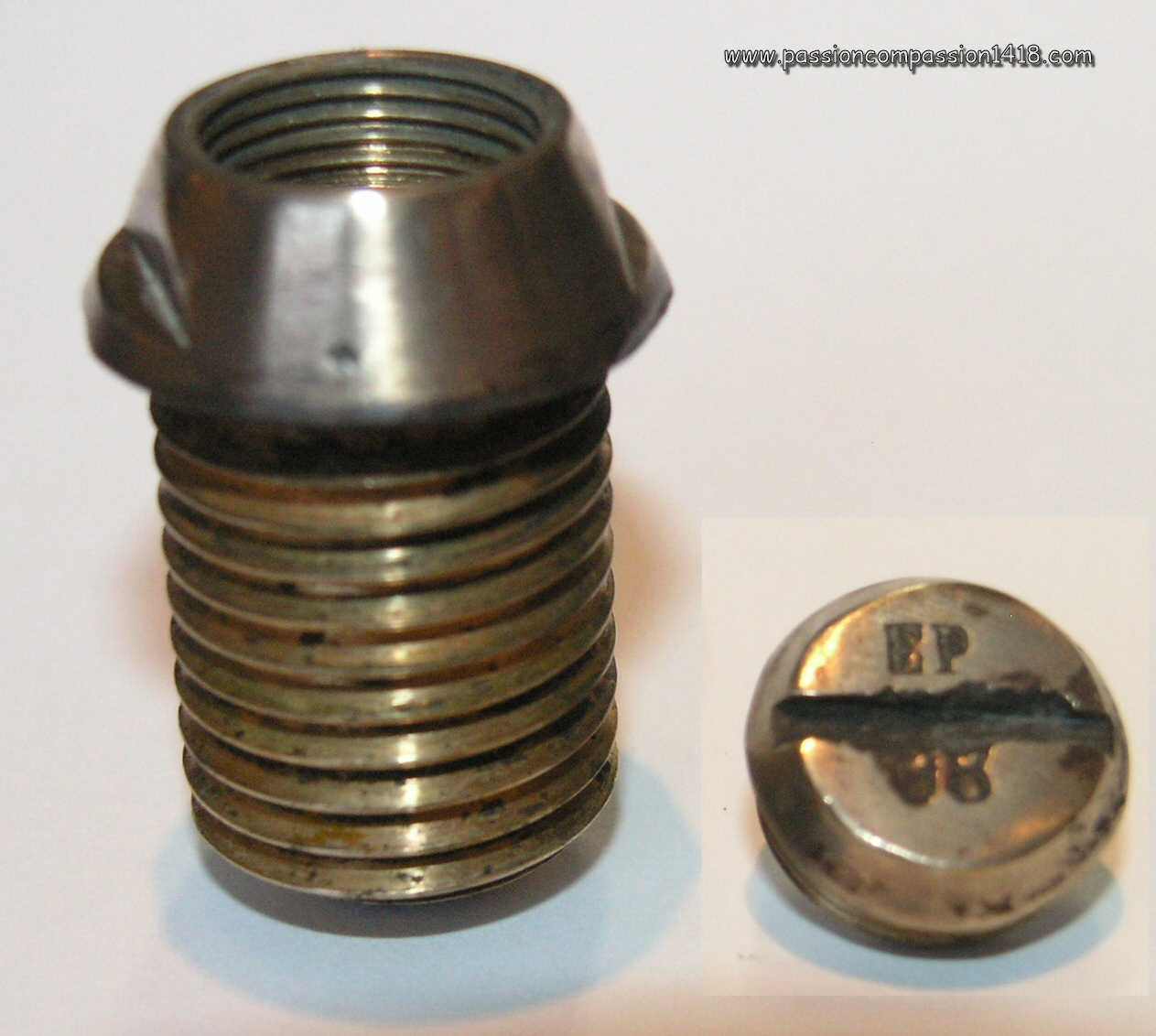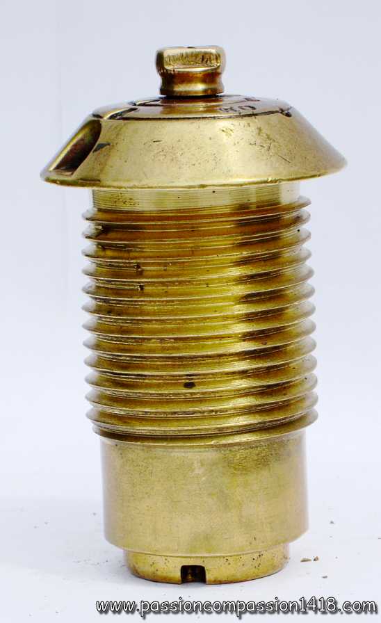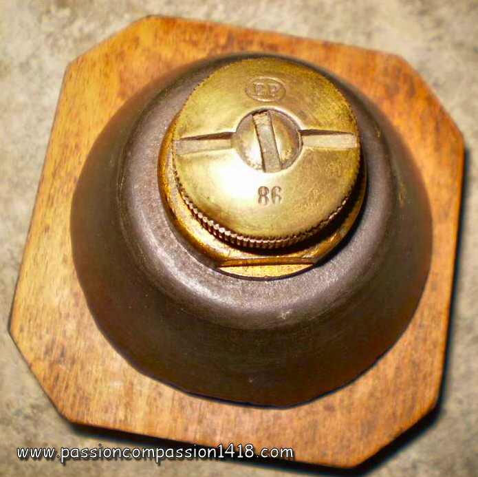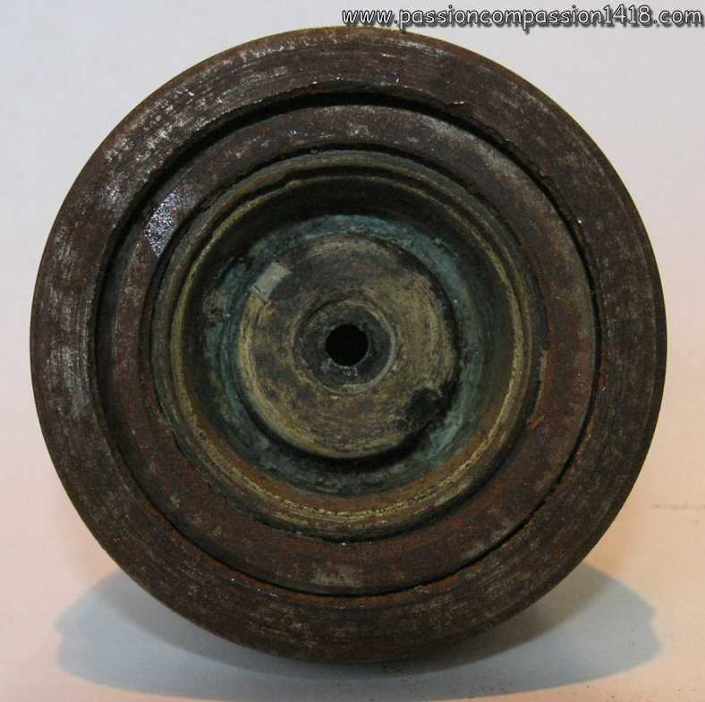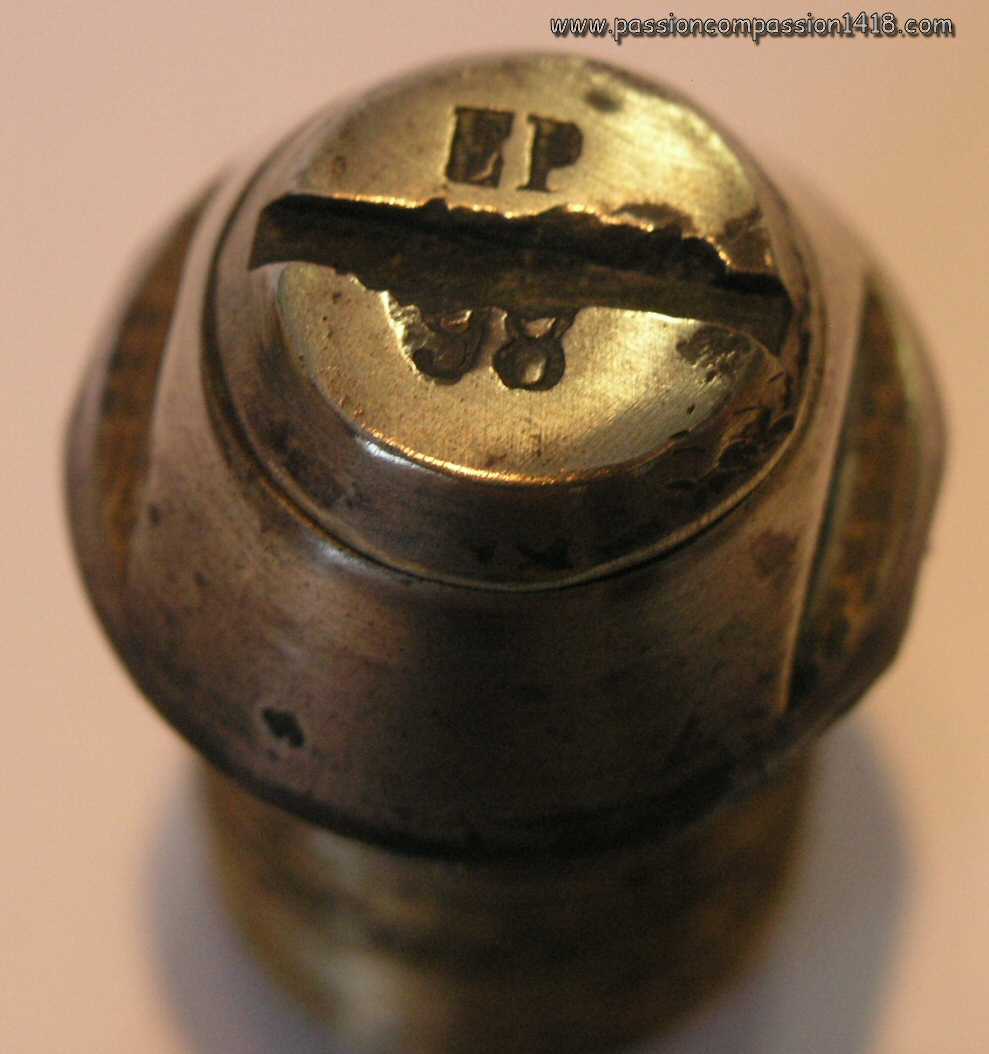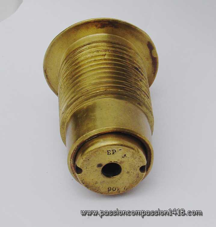 | Percussion fuze for field artillery, top view. Markings 'EP' for 'Ecole de Pyrotechnique', and '93' for the manufacturing yaer 1893. Pictures courtesy J-L Ponche | ||