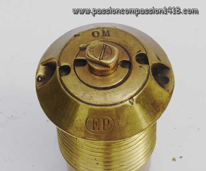 | Belgian percussion fuze for fortress guns. Characteristic shape, bought in a flee market in Ypres. | Belgian percussion fuze for fortress guns. Upper view - markings 'EP - OM - 97'. | |