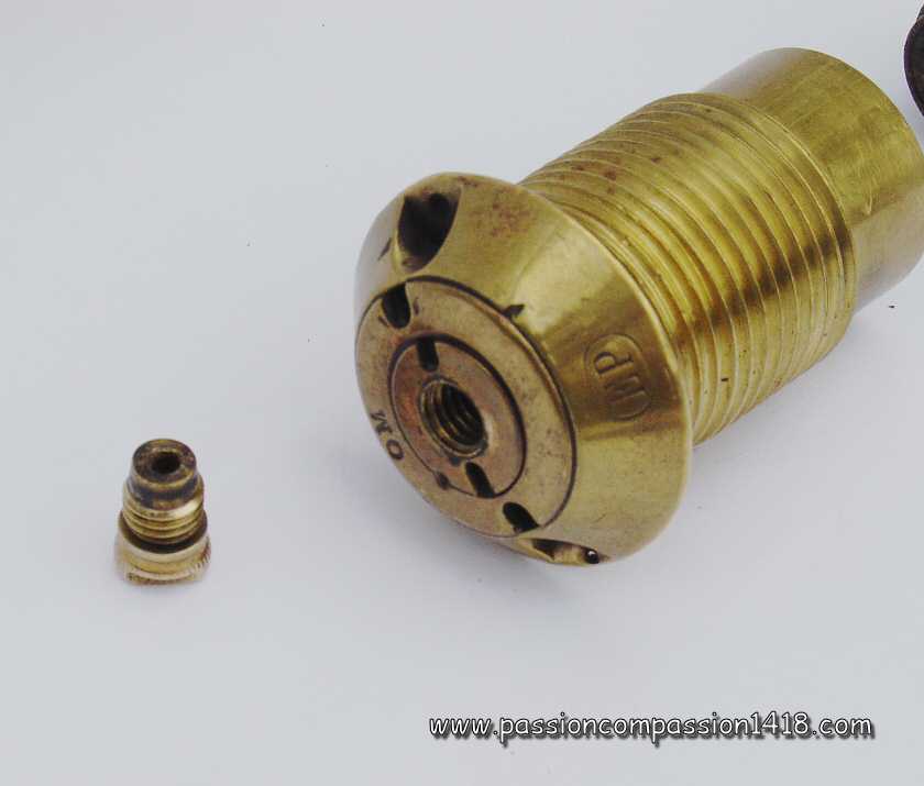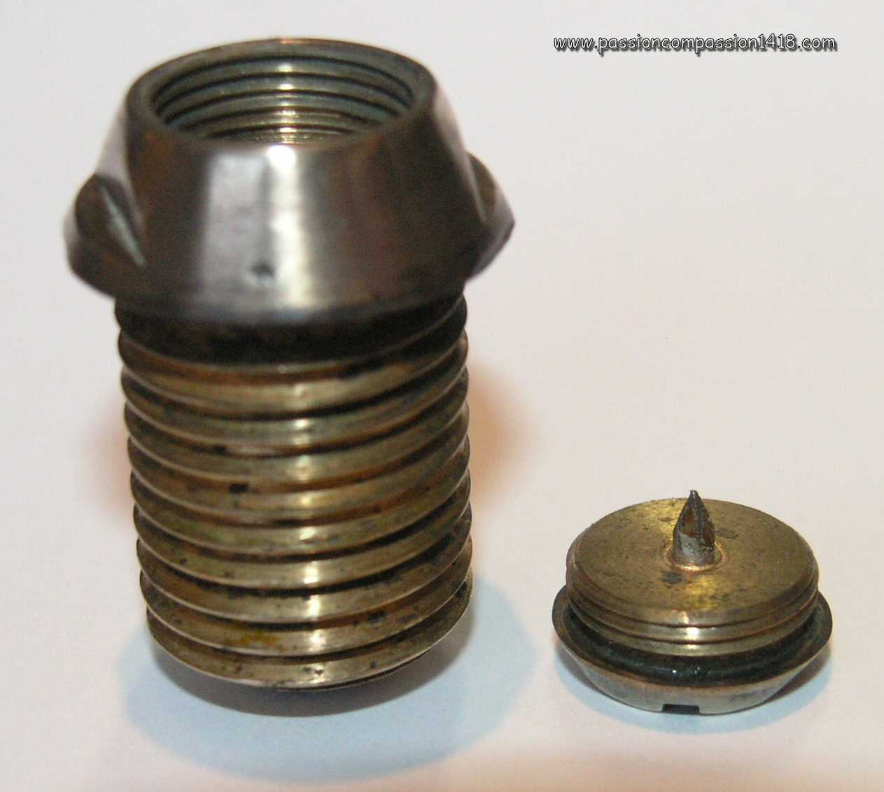 | Percussion fuze for 57mm gun. Dismantled head showing the percussion pin. Pictures courtesy Luc Malchair | Percussion fuze for 57mm gun. Lateral view. Pictures courtesy Luc Malchair | |