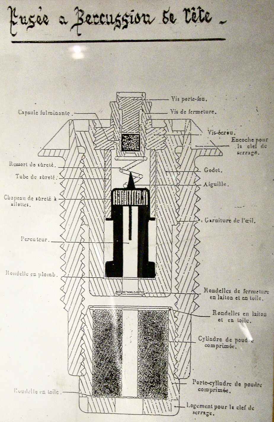 | Percussion fuze for field artillery, top inside view, cap removed (the percussion mechanism is not present). Pictures courtesy J-L Ponche | Percussion fuze for field artillery. Wartime scheme | |