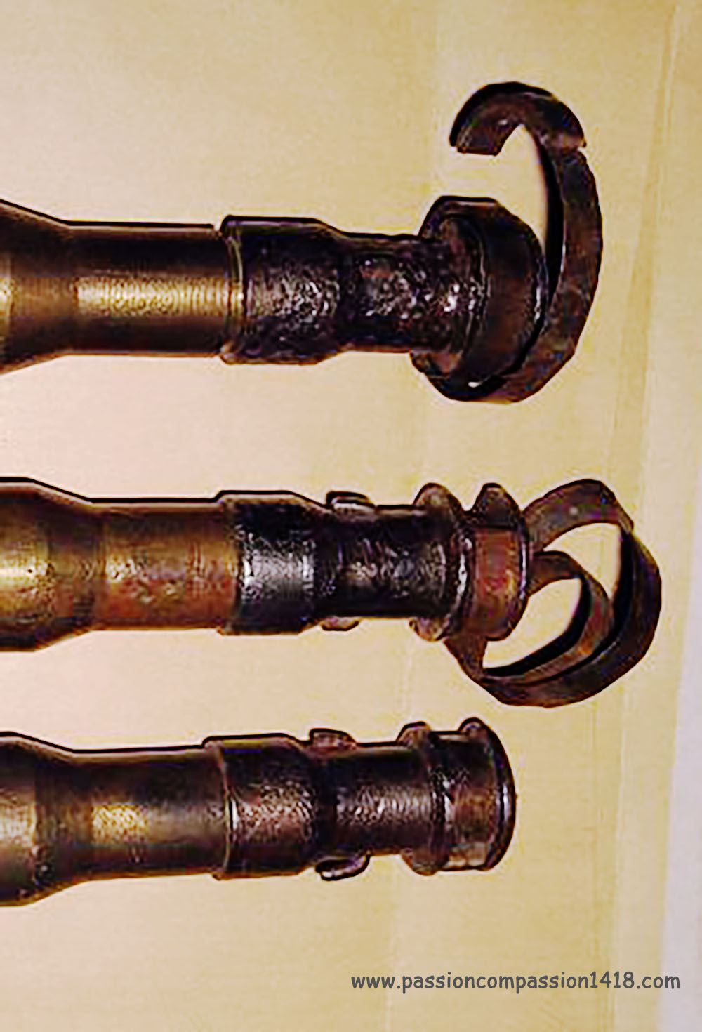 In these devices, the combustion of compressed gunpowder grains ignited at shot departure was needed to allow the action of springs opening metallic jaws that were blocking the movements of the main percussion system at rest.