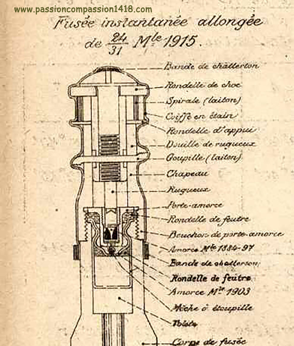 Percussion fuzes were designed to trigger the burst of the shell when hitting the ground, an obstacle or the aimed target. Originally dedicated to siege guns and projectiles, they became more and more used during the war with all guns including the fieldguns, with the progressive replacement of the classical shrapnell shell for anti-personnal missions by HE shells, inspired by the trench war experience.