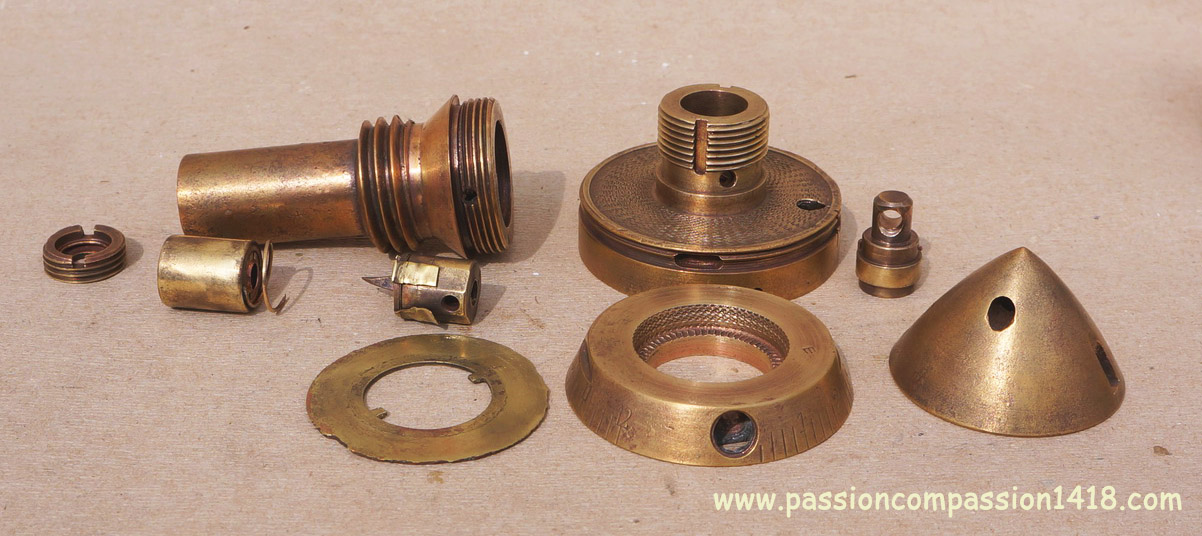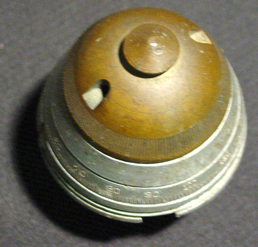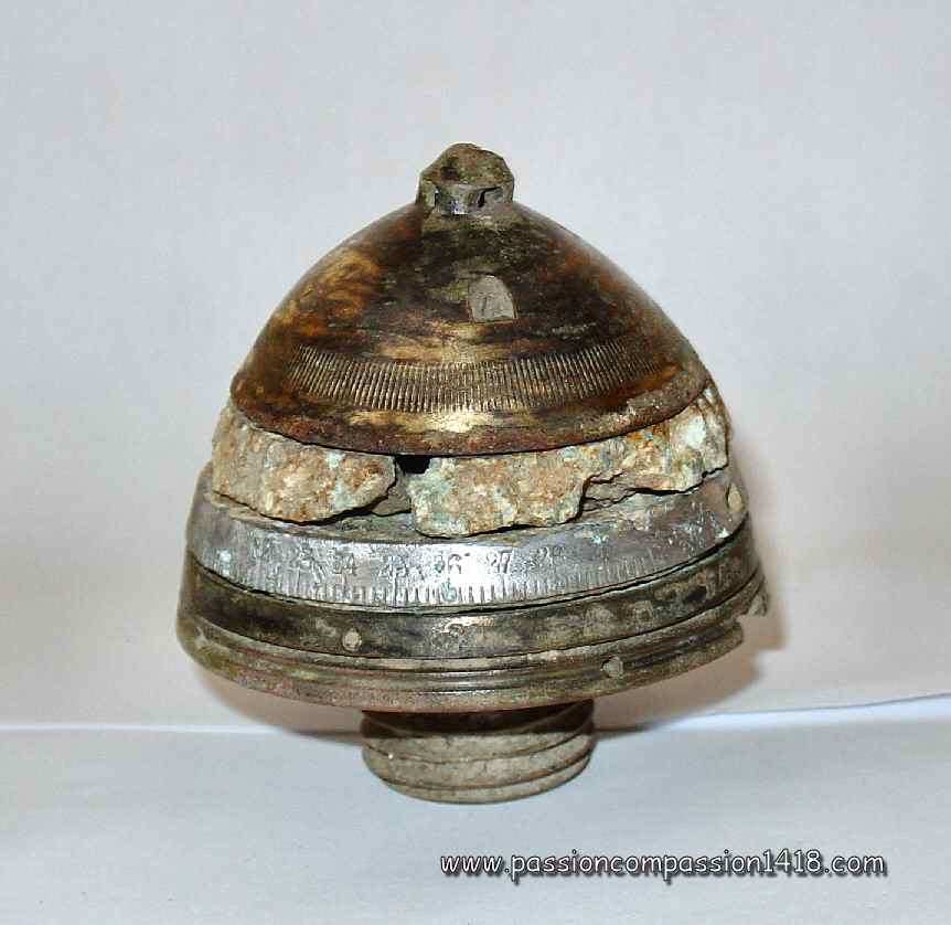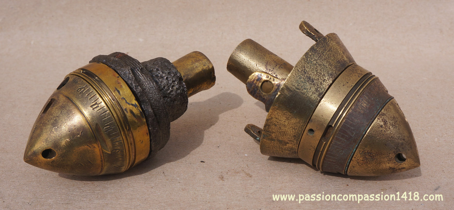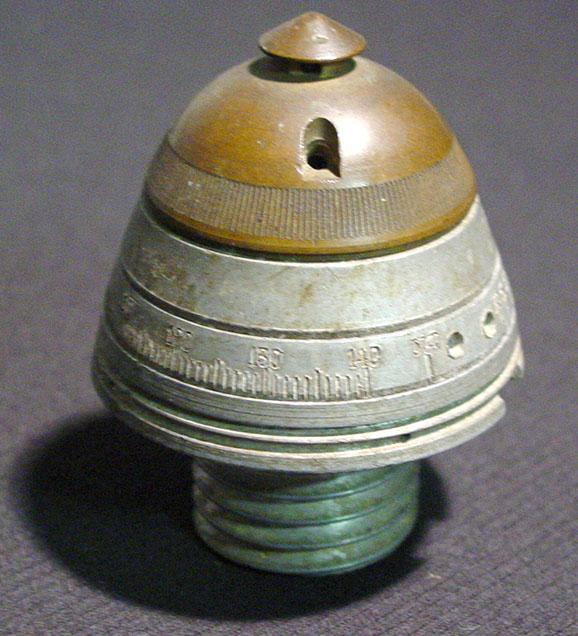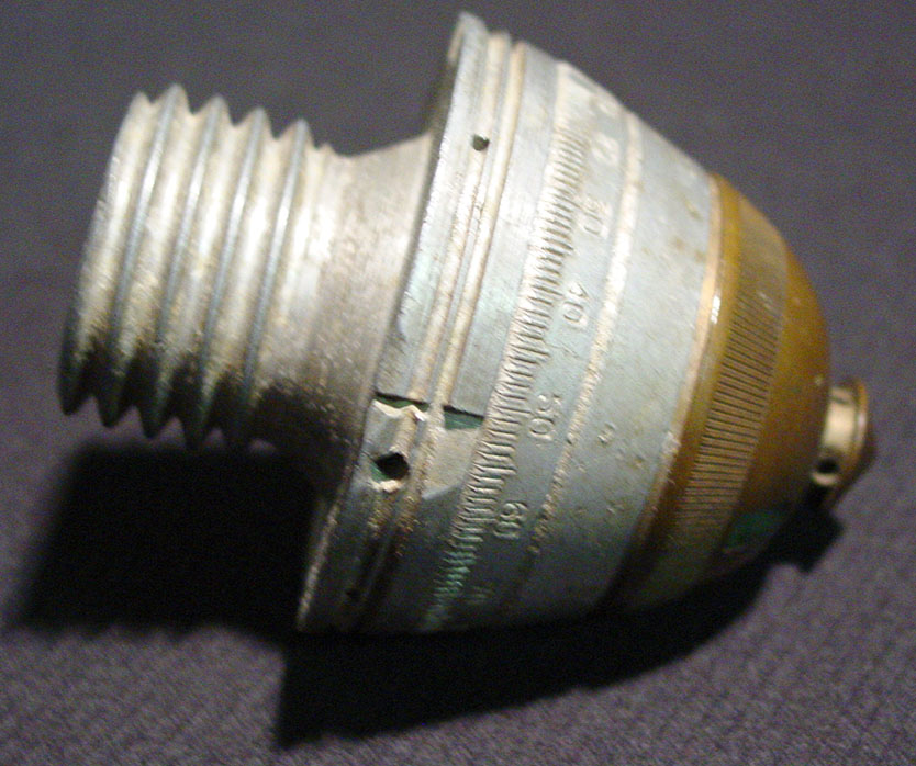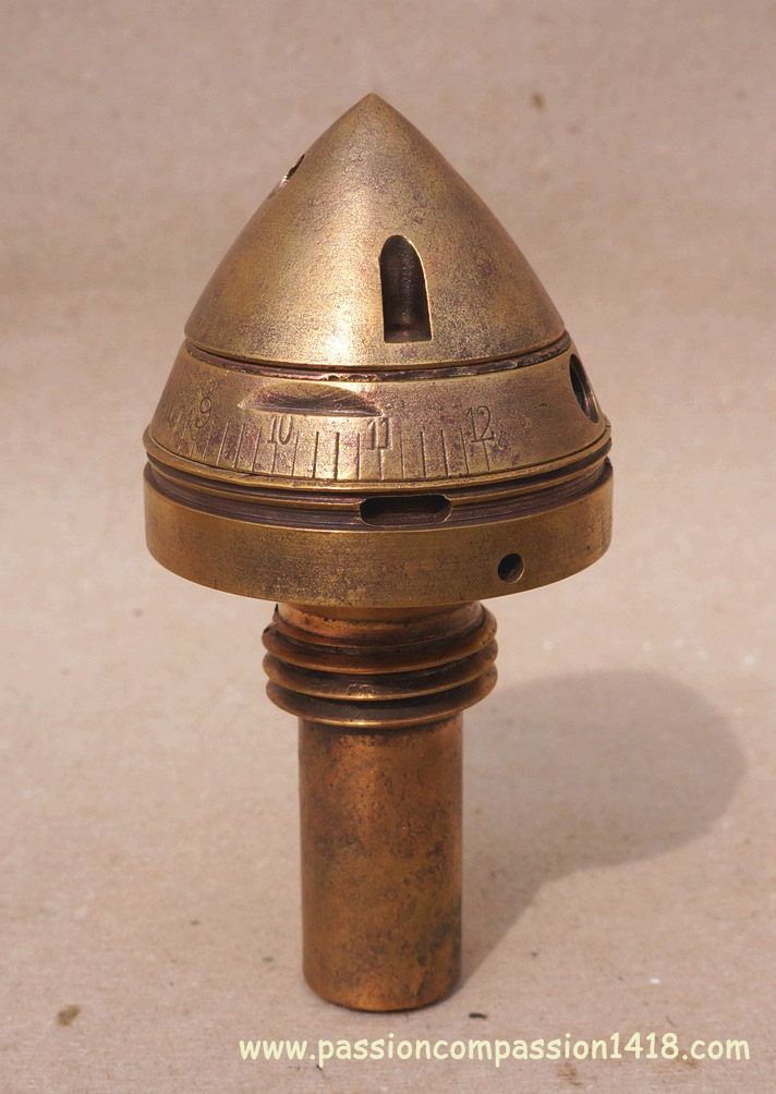 Sous le 'chapeau chinois' en tête de fusée était abrité le système inertiel concutant, très classiquement fait d'un bloc mobile porte-amorce et d'un rugueux fixe seulement séparés par un ressort de sécurité et une feuille de métal mou. Ce système permettait d'allumer la piste de poudre compressée du dispositif temporisé, au départ du coup. Les pistes circulaires étaient situées dans les deux disques, celui du haut étant fixe et celui du bas mobile. Le disque mobile était gradué de 0 à 140 unités de distance (valeur inconnue) par pas de 1 unité, mais il pouvait aussi être positionné sur une marque 'yD' pour un comportement purement percutant.
