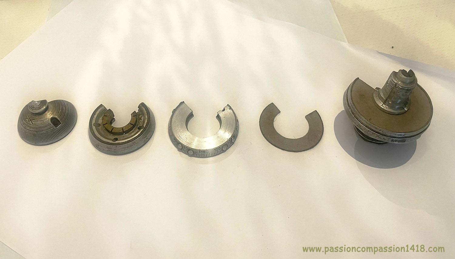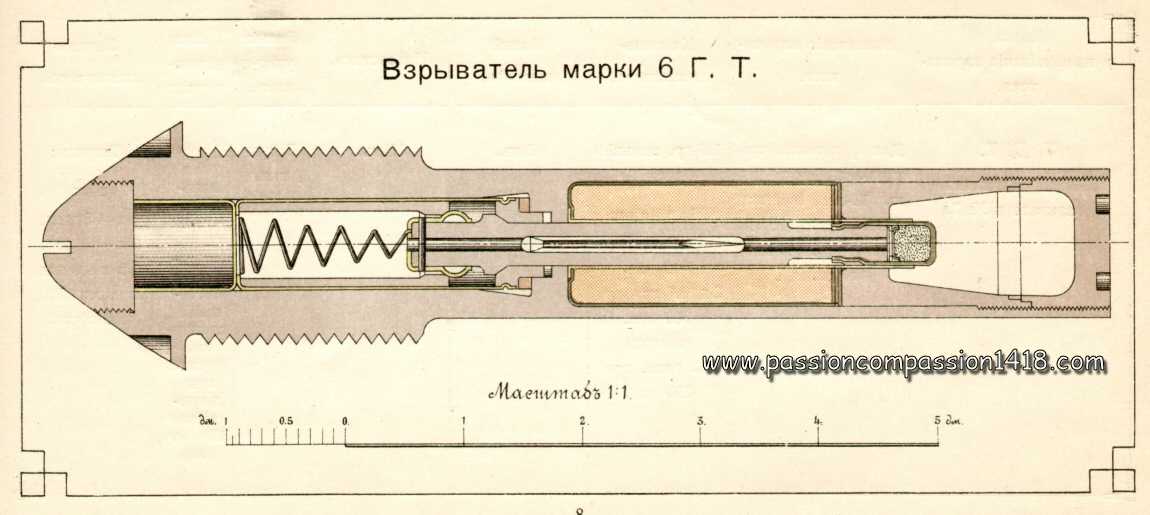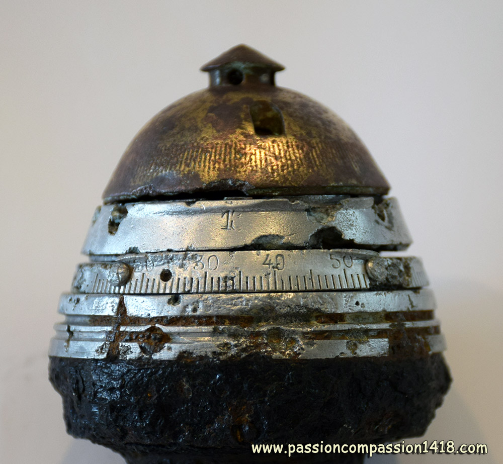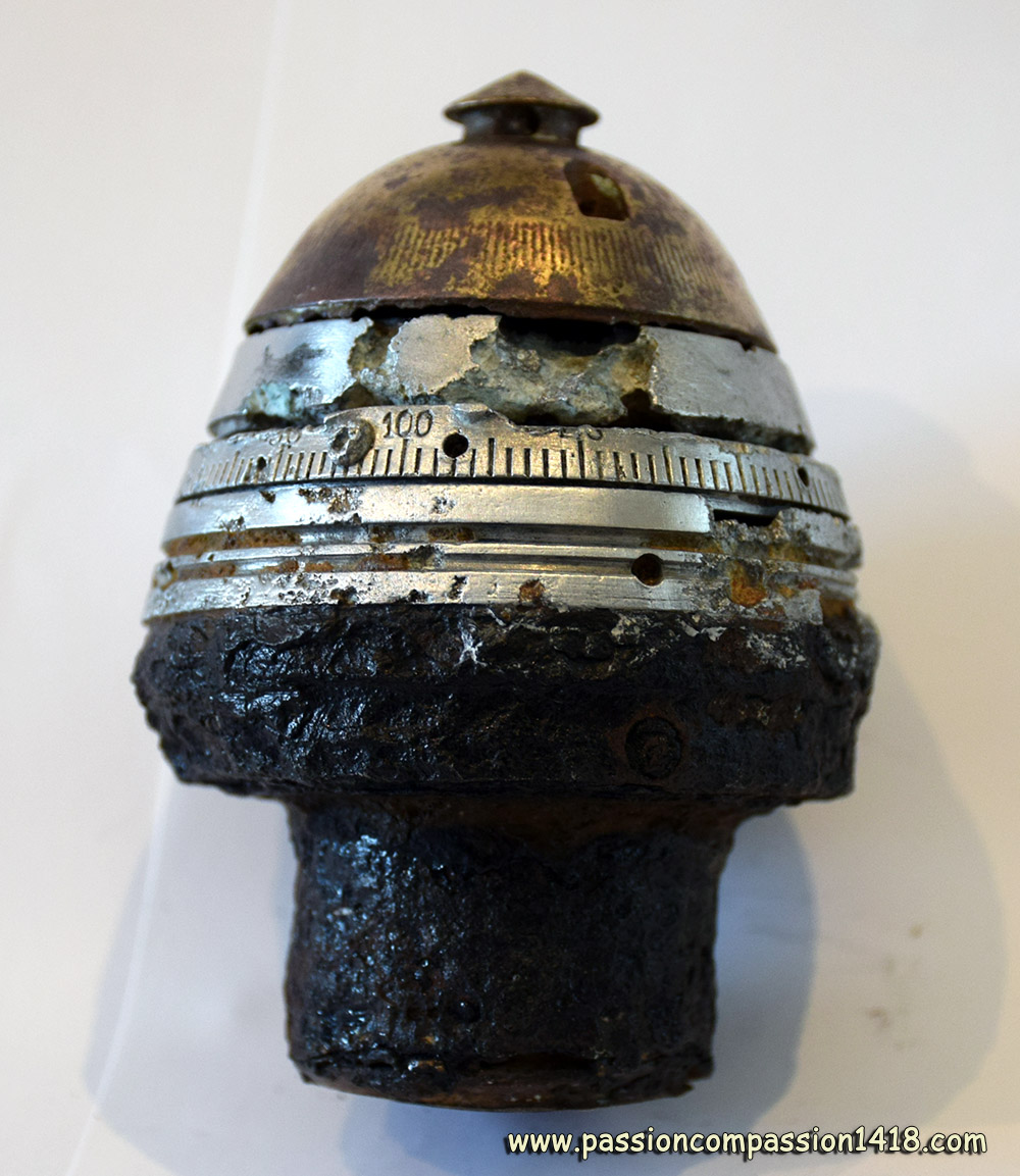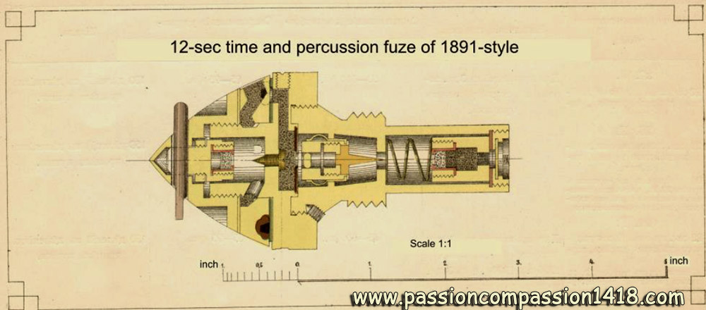 Sous le 'chapeau chinois' en tête de fusée était abrité le système inertiel concutant, très classiquement fait d'un bloc mobile porte-amorce et d'un rugueux fixe seulement séparés par un ressort de sécurité et une feuille de métal mou. Ce système permettait d'allumer la piste de poudre compressée du dispositif temporisé, au départ du coup. Les pistes circulaires étaient situées dans les deux disques, celui du haut étant fixe et celui du bas mobile. Le disque mobile était gradué de 0 à 140 unités de distance (valeur inconnue) par pas de 1 unité, mais il pouvait aussi être positionné sur une marque 'yD' pour un comportement purement percutant.