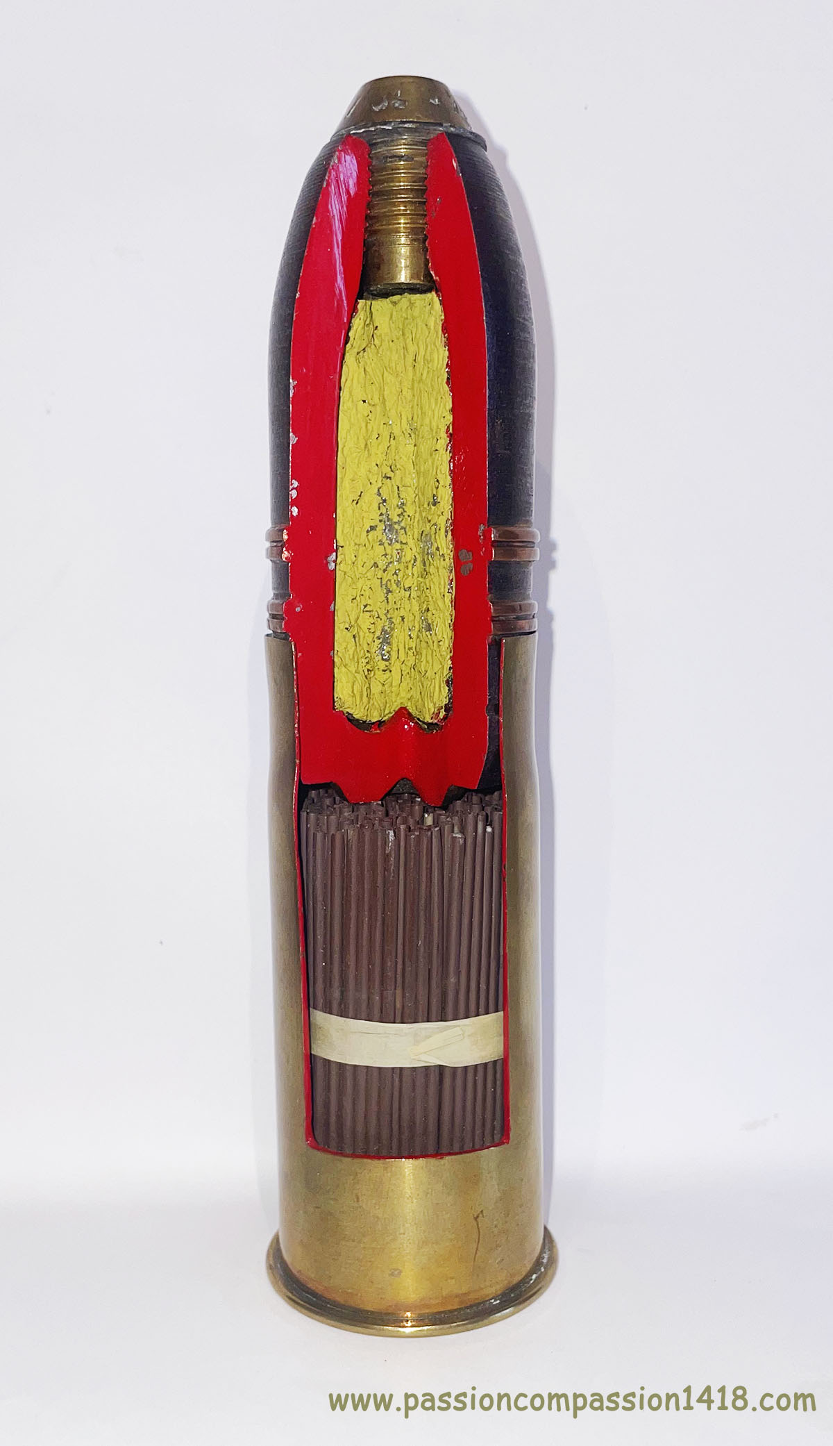 Les obus à balles constituaient en 1914 les munitions principales de l'artillerie de campagne. Destinés à exploser au-dessus des formations ennemies par l'usage d'un mécanisme de mise à feu spécifique (fusée à temps) , ils dispersaient une gerbe mortelle de fragments et de balles tout en produisant un nuage de fumée qui permettait aux artilleurs de régler leur tir.