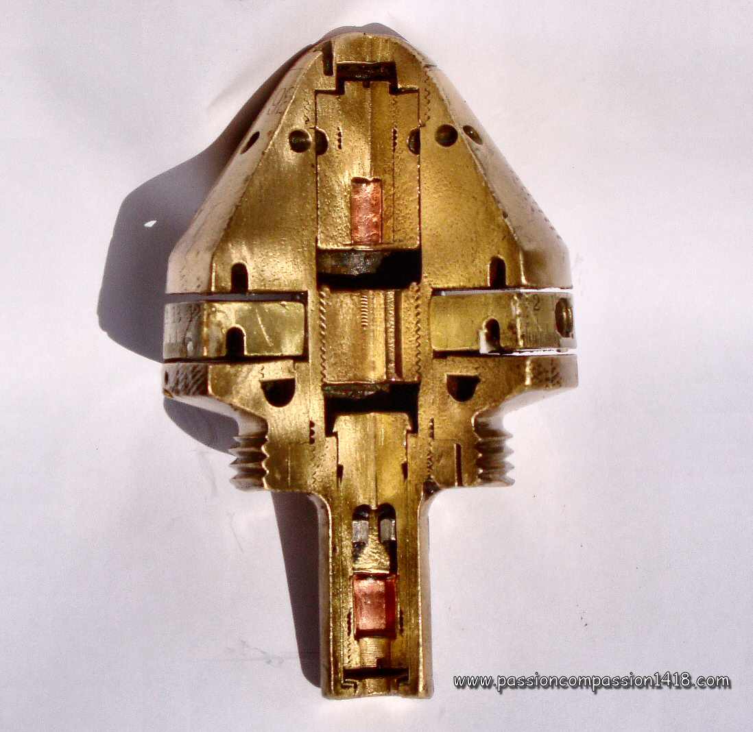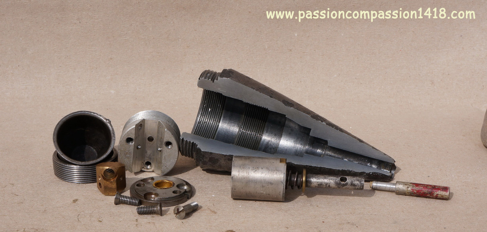 The wartime scheme at far left shows that fuze, using a Robin arming system for the percussion system in the tail and another kind of stirrup system in the top head mechanism ('Lejay' type) for an additional safety. The picture at left shows the remains of such a fuze that can be easily comparred with the scheme.