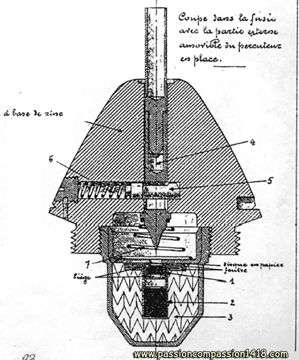 Percussion fuzes were designed to trigger the burst of the shell when hitting the ground, an obstacle or the aimed target. Originally dedicated to siege guns and projectiles, they became more and more used during the war with all guns including the fieldguns, with the progressive replacement of the classical shrapnell shell for anti-personnal missions by HE shells, inspired by the trench war experience.