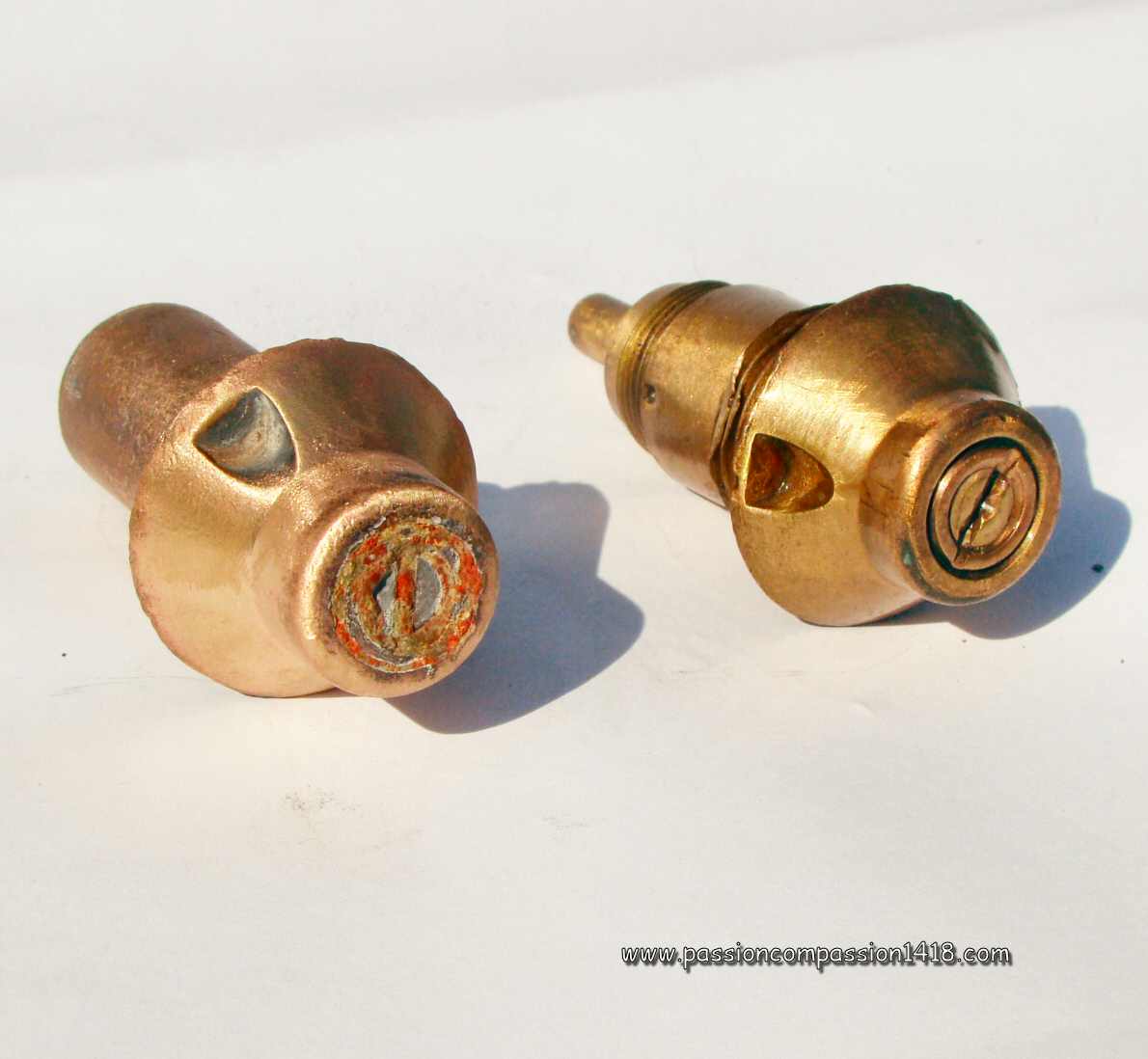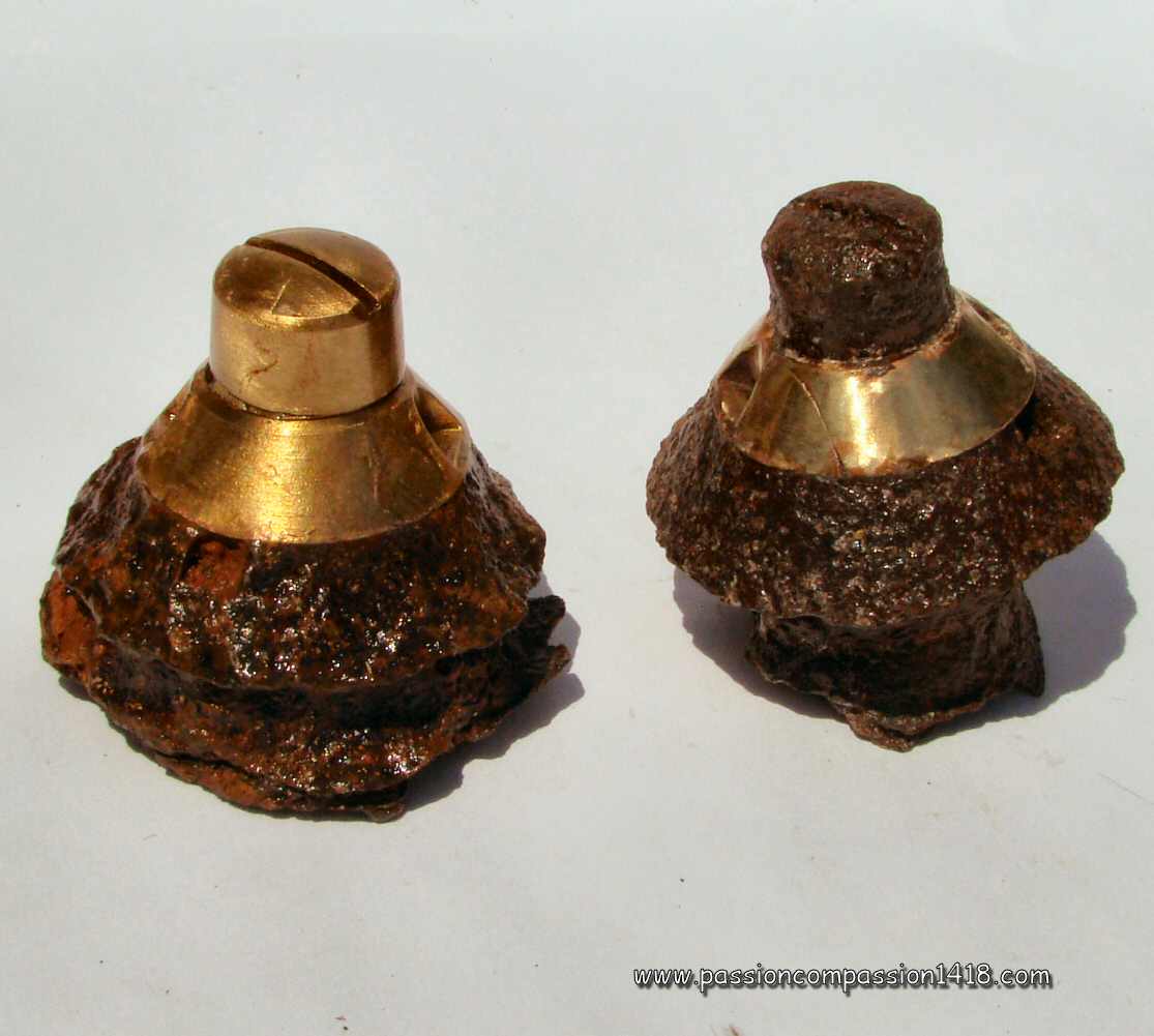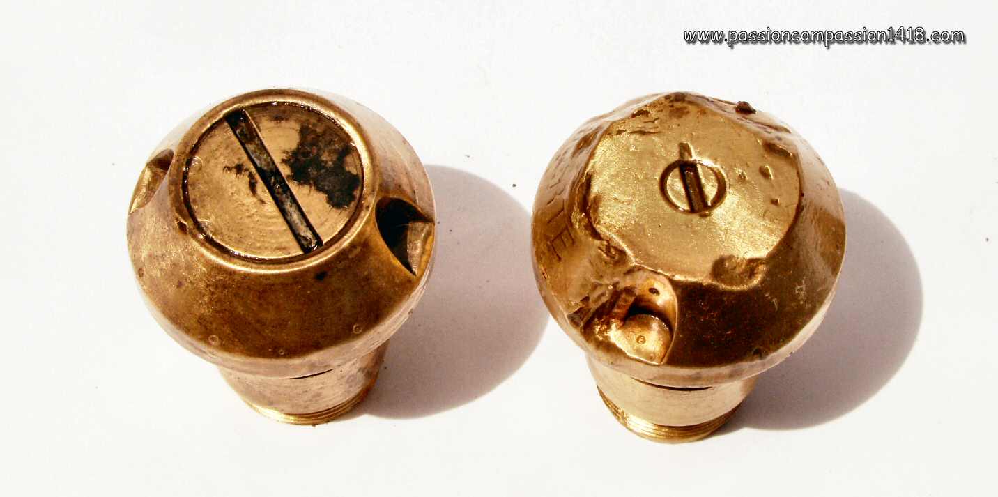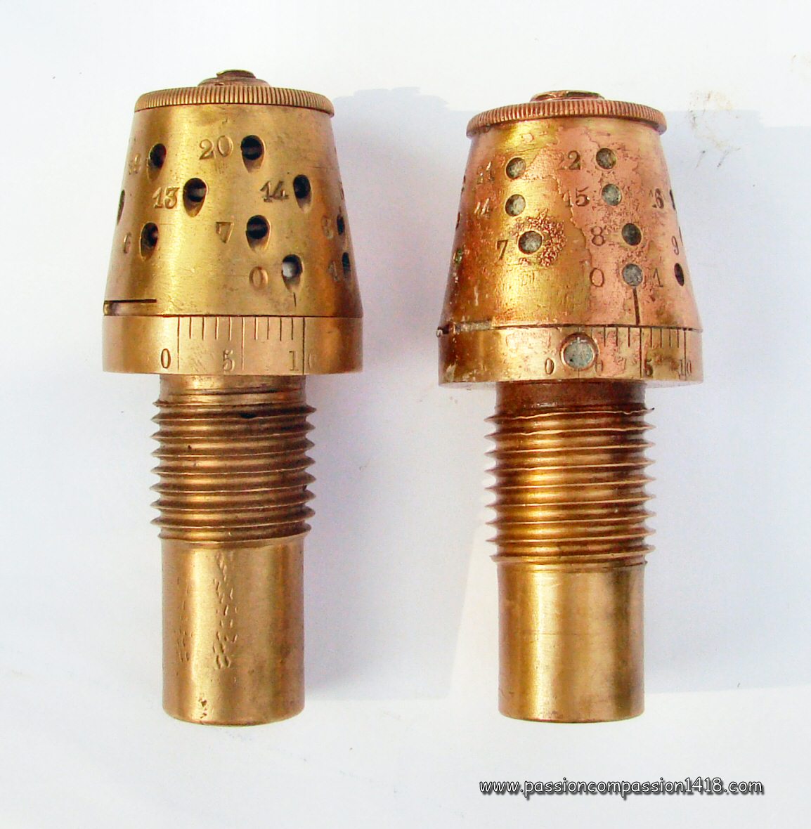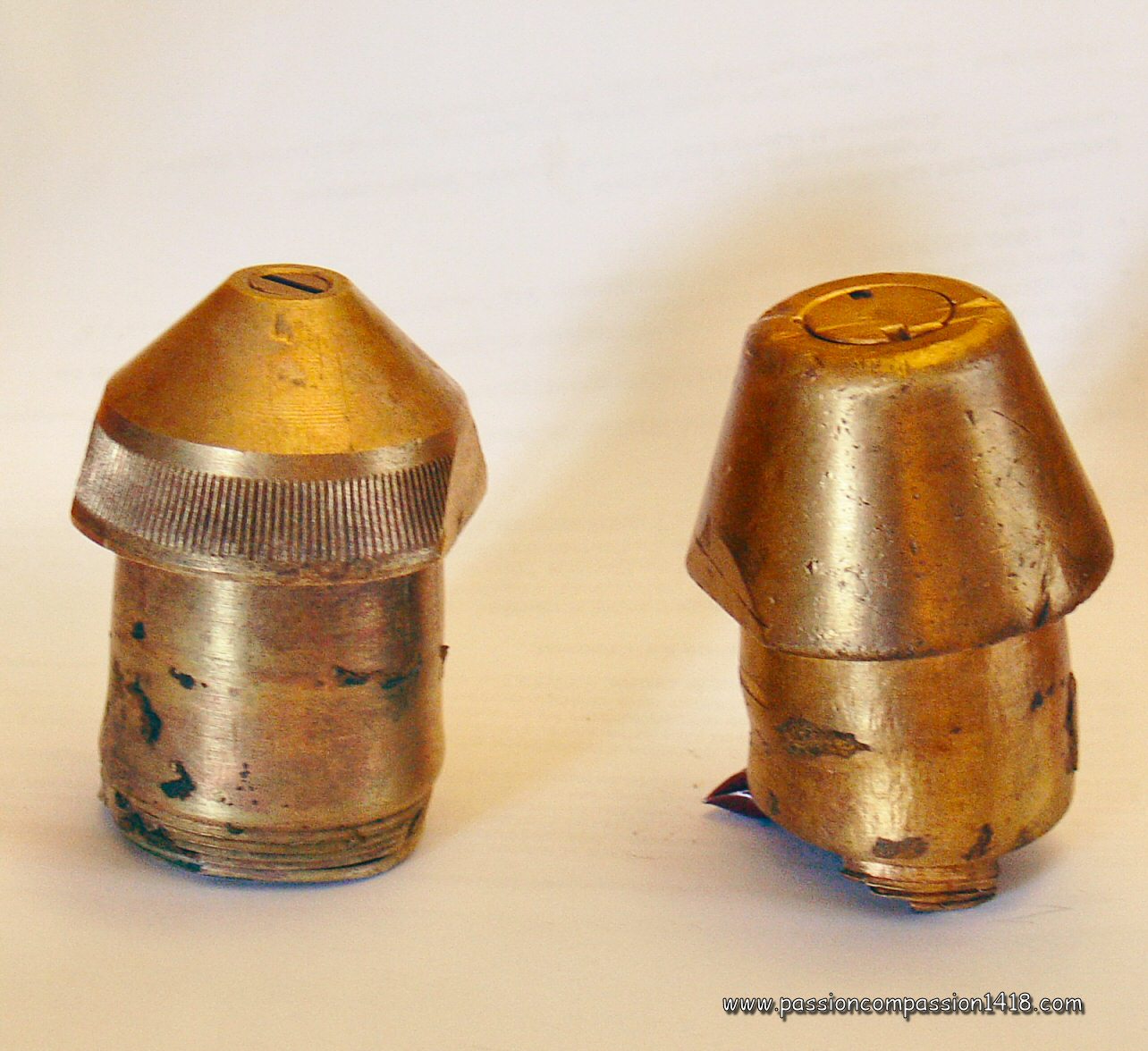 Fusée double effet 24/31 Mod 1916 ou fusante Mod 1915. Ces deux fusées identiques ne différent que par la présence, sur une d'entre elles d'un chapeau de protection en plomb étamé, à arracher avant le tir |