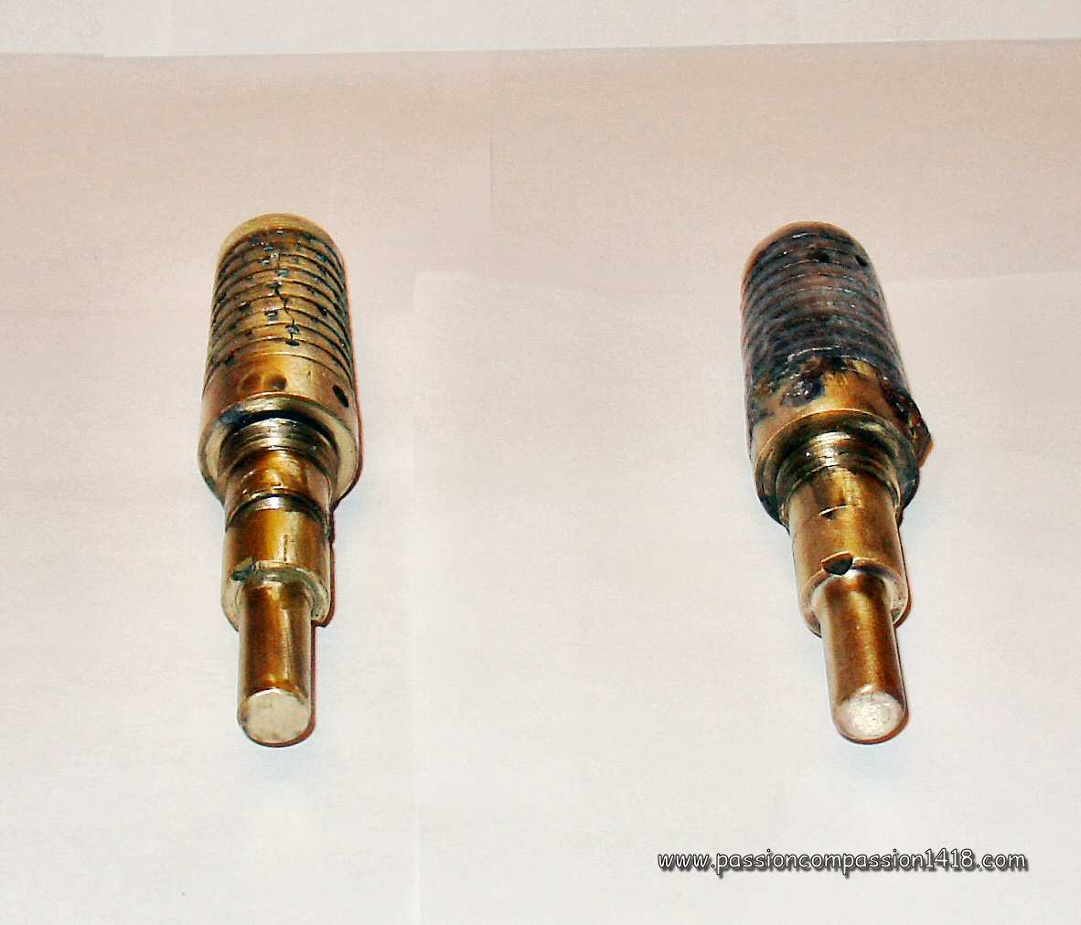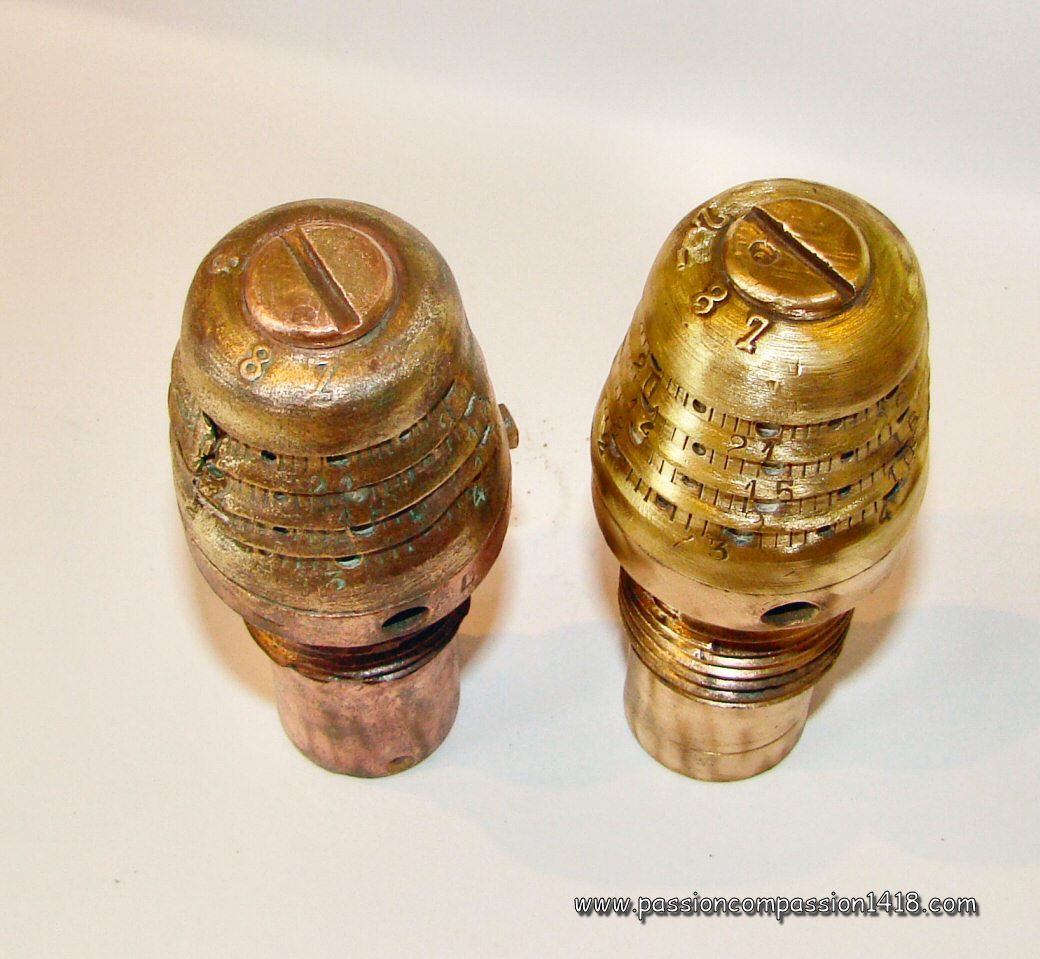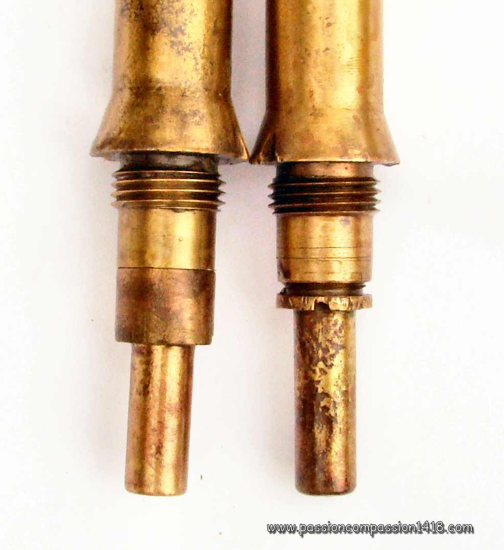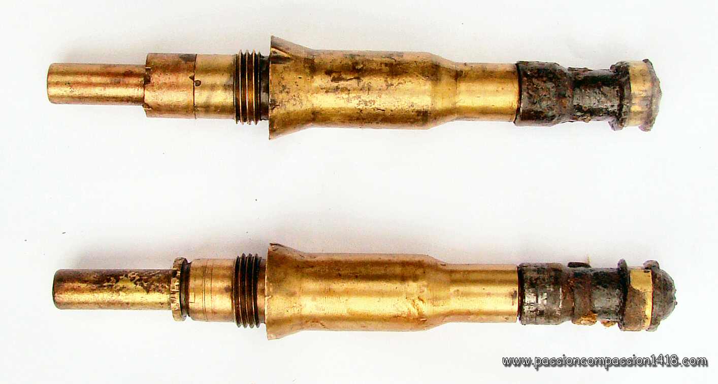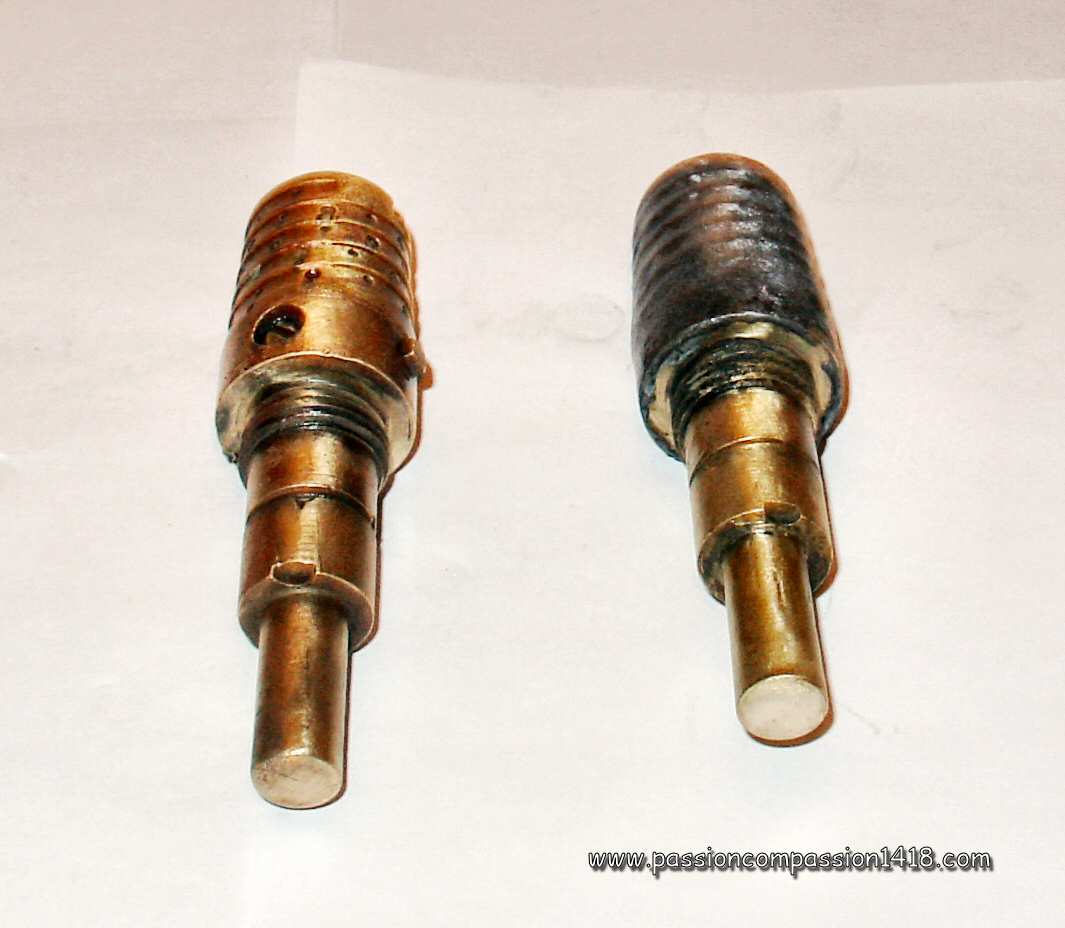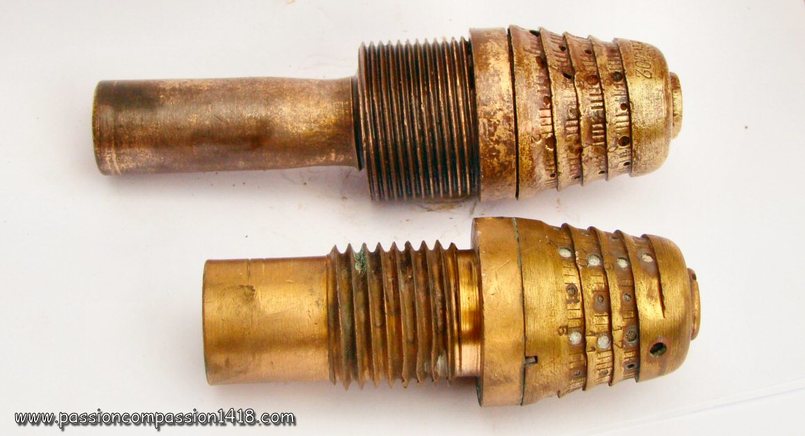 Fusée à double effet 30/38 Mod 1884 (T). A l'examen, deux différences notables apparaissent pour ces fusées. Celle de gauche possède un tenon et est donc une Mle 1884 T (alors que cette fusée est datée 1887 et que les tenons ne sont apparus qu'en 1902 - peut-être une fusée 1884 originale modifiée ?), celle de droite n'en possède pas et est donc une Mle 1884. De plus les longueurs des filetages sont sensiblement différentes |