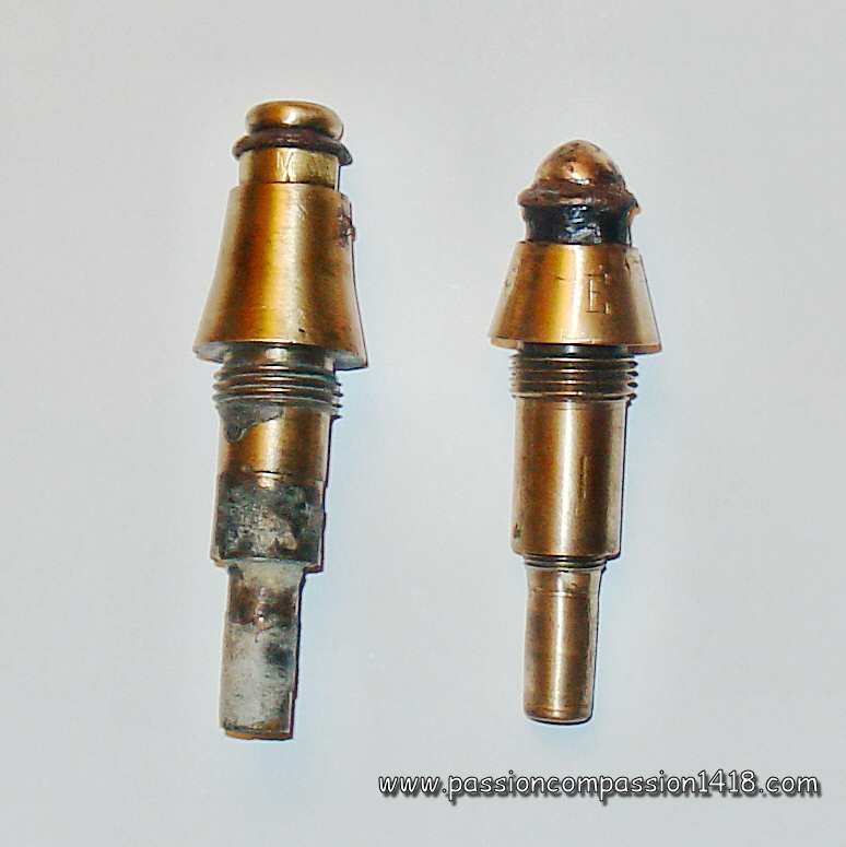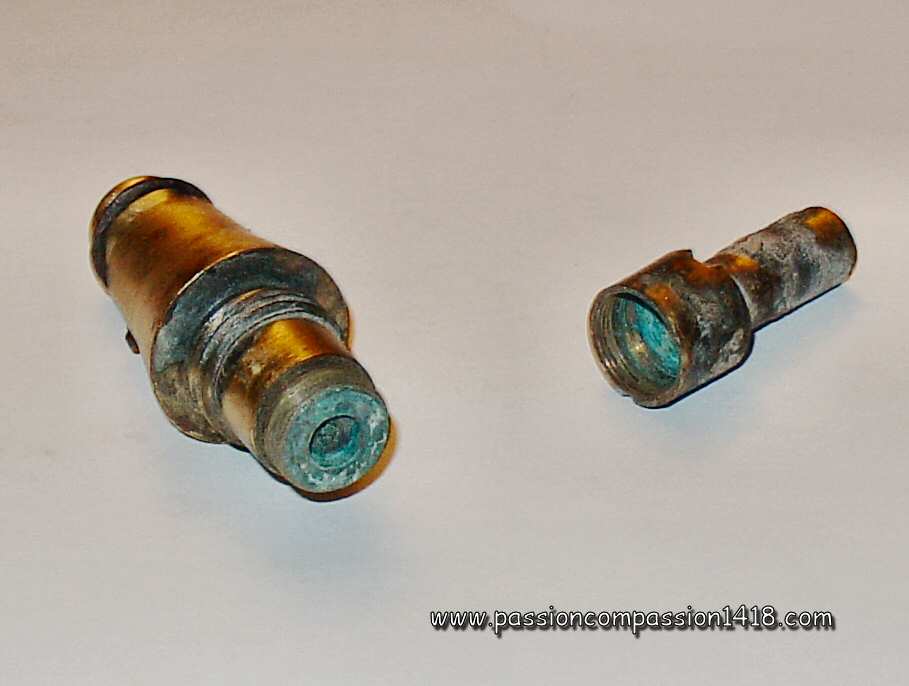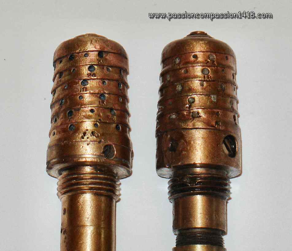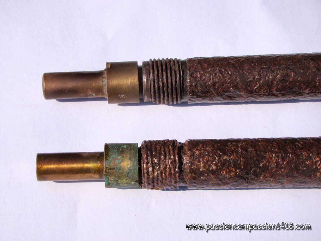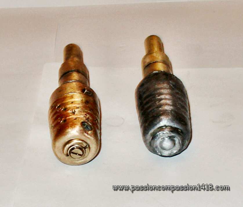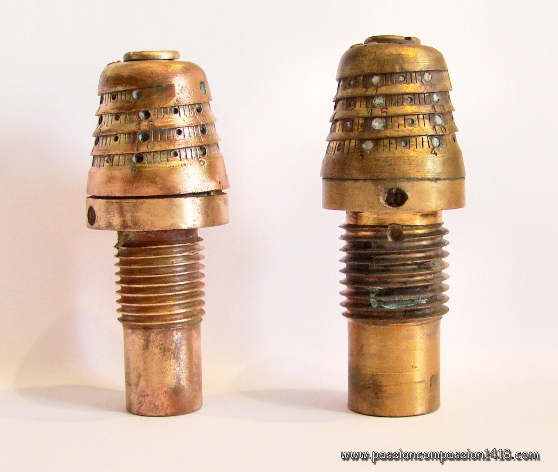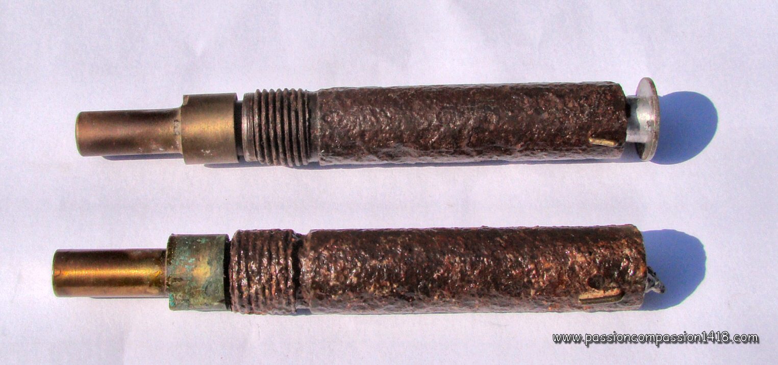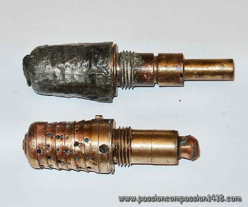 Fusée à double effet 30/38 Mod 1884 (T). A l'examen, deux différences notables apparaissent pour ces fusées. Celle de gauche possède un tenon et est donc une Mle 1884 T (alors que cette fusée est datée 1887 et que les tenons ne sont apparus qu'en 1902 - peut-être une fusée 1884 originale modifiée ?), celle de droite n'en possède pas et est donc une Mle 1884. De plus les longueurs des filetages sont sensiblement différentes |