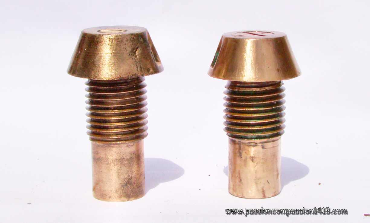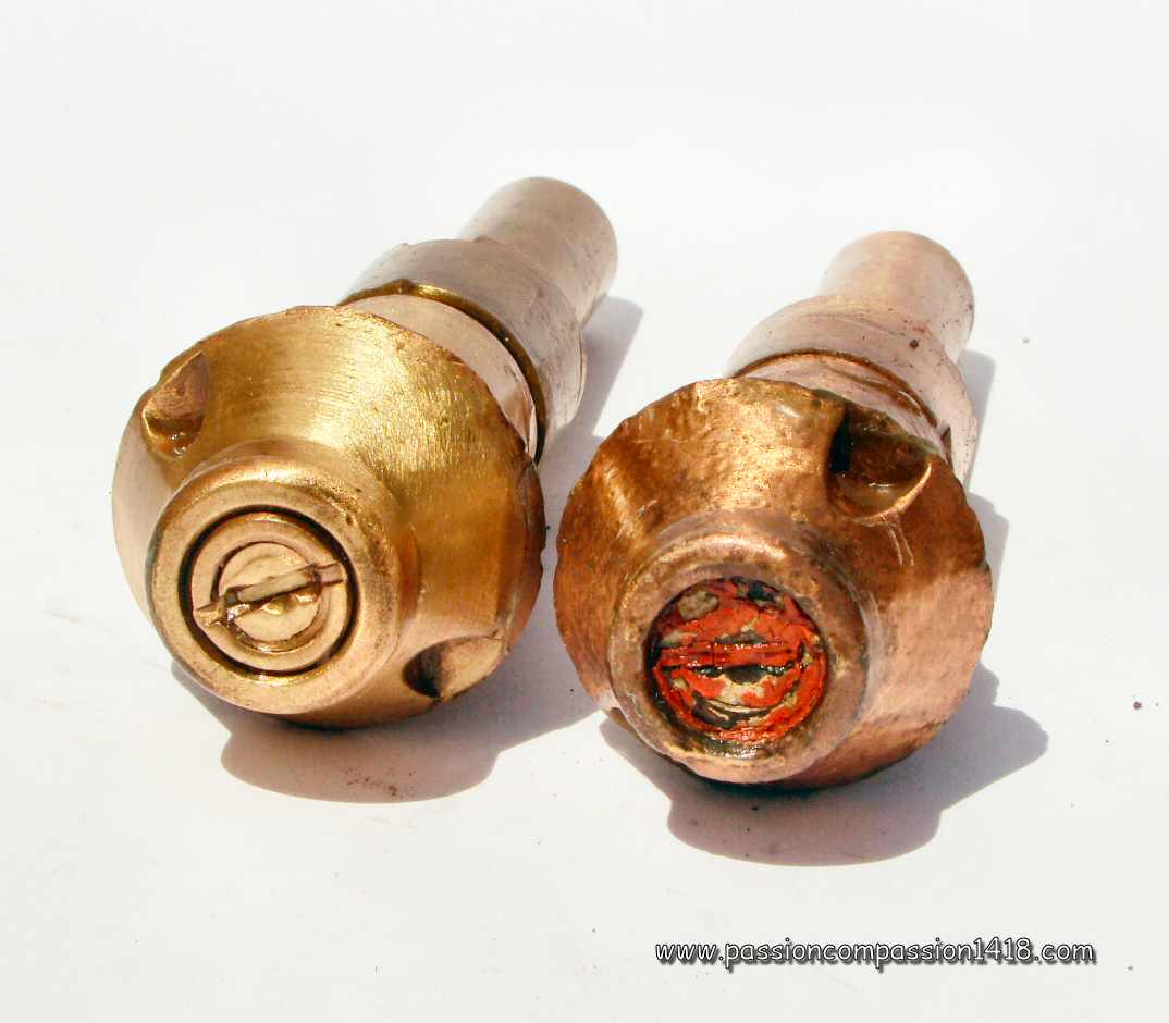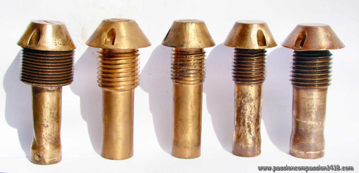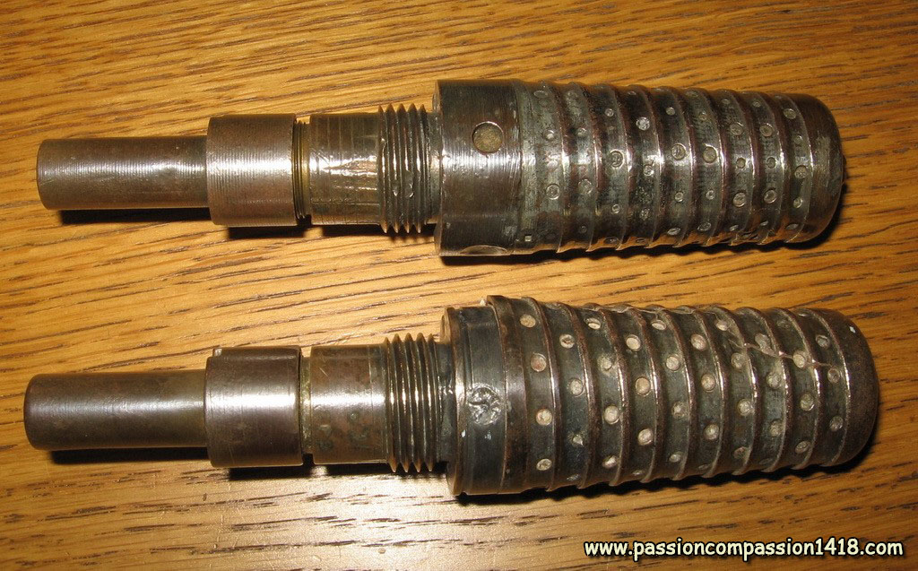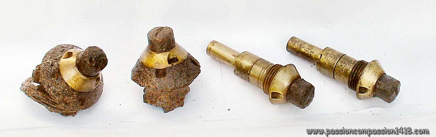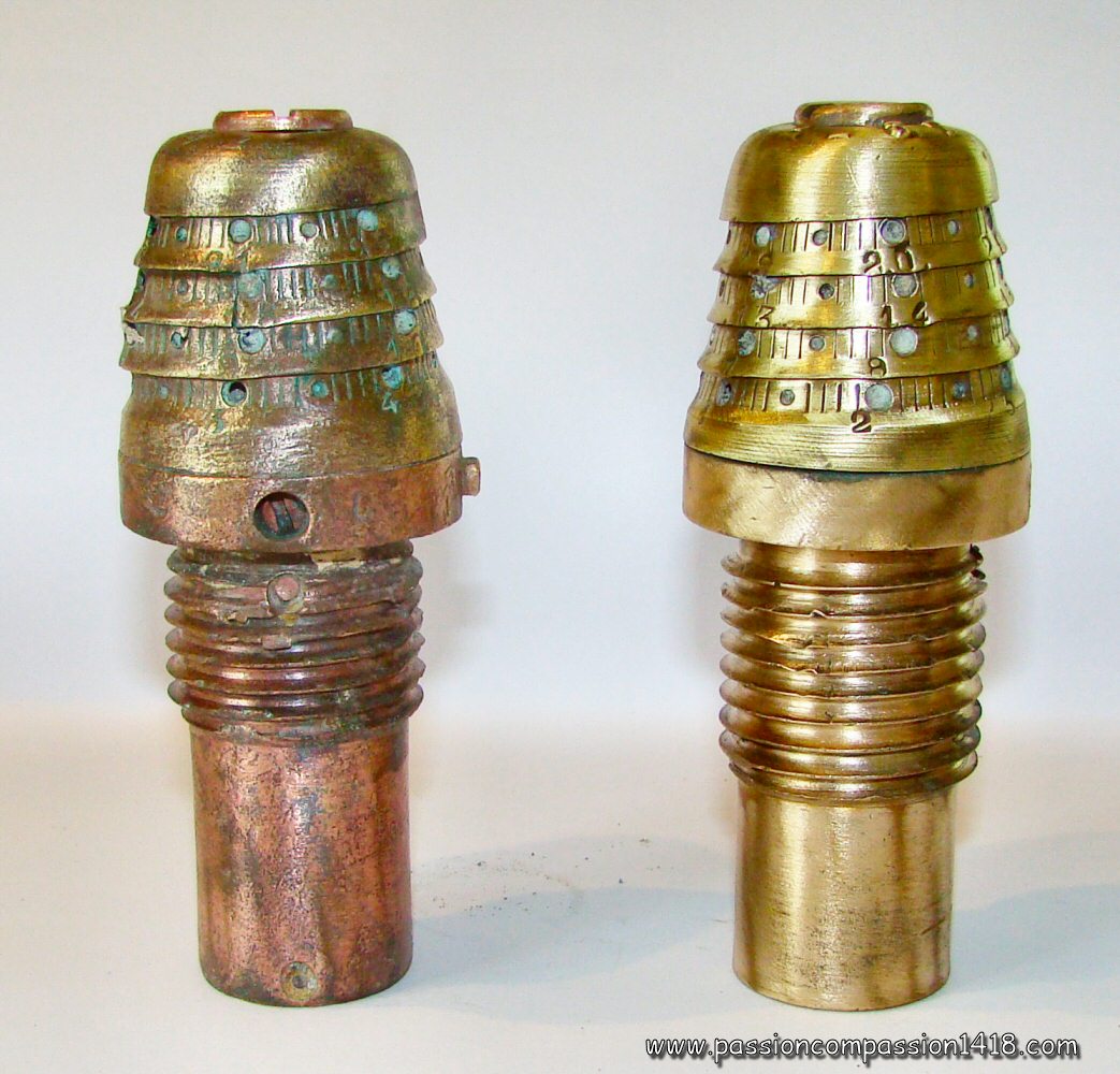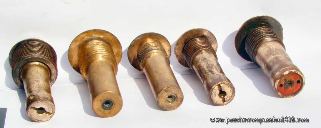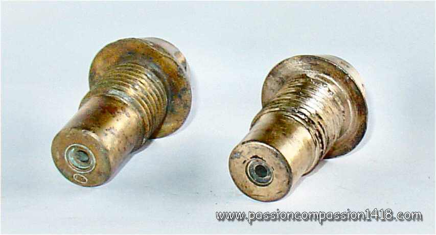 Fusée à double effet 30/38 Mod 1884 (T). A l'examen, deux différences notables apparaissent pour ces fusées. Celle de gauche possède un tenon et est donc une Mle 1884 T (alors que cette fusée est datée 1887 et que les tenons ne sont apparus qu'en 1902 - peut-être une fusée 1884 originale modifiée ?), celle de droite n'en possède pas et est donc une Mle 1884. De plus les longueurs des filetages sont sensiblement différentes |