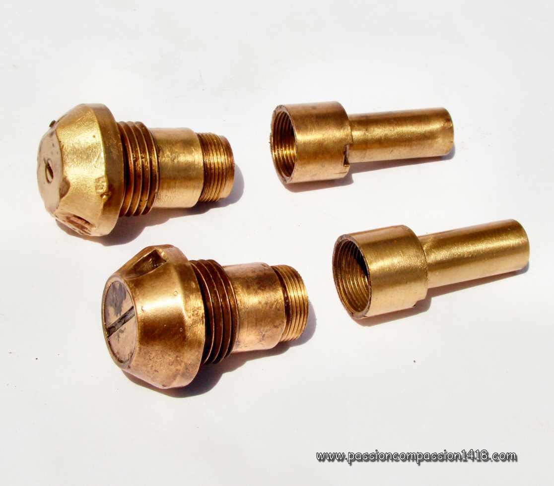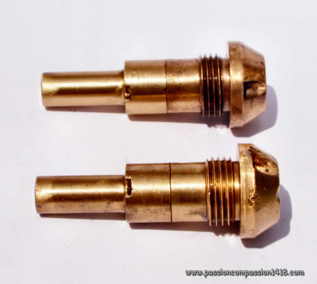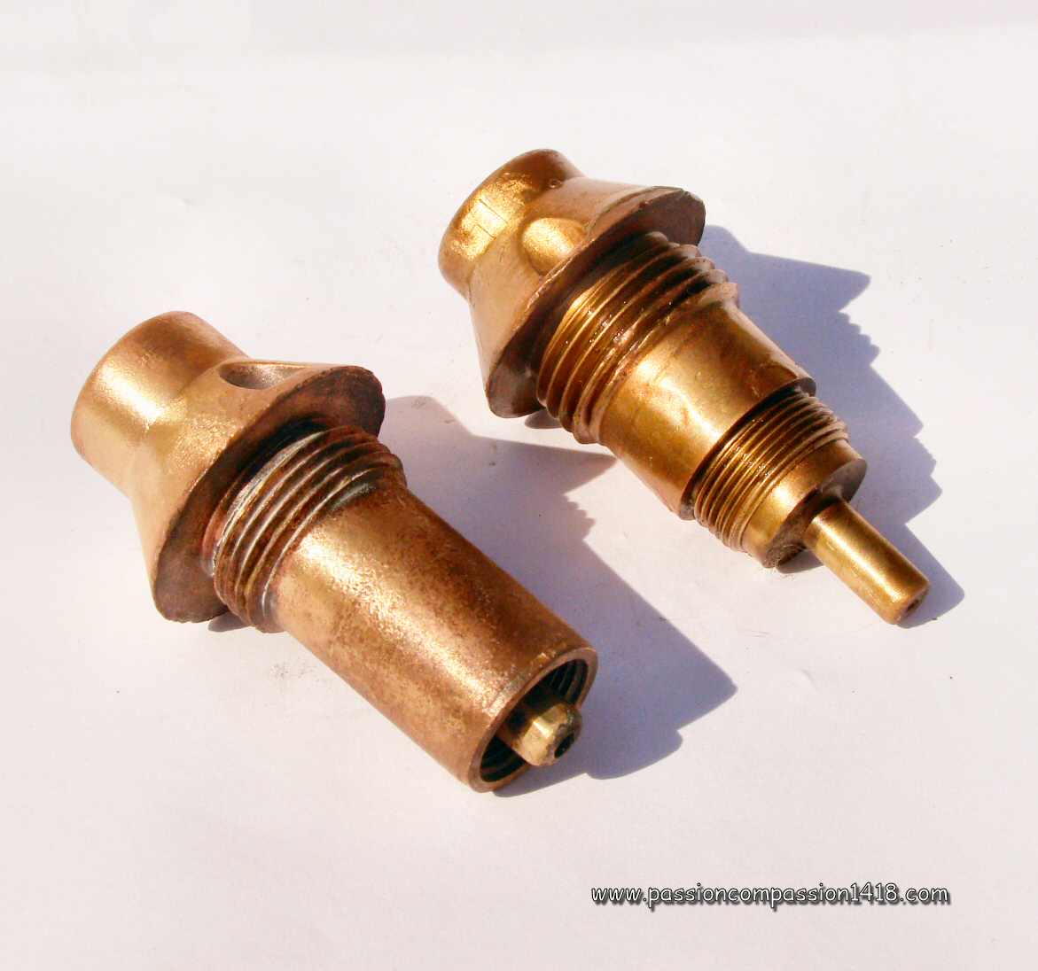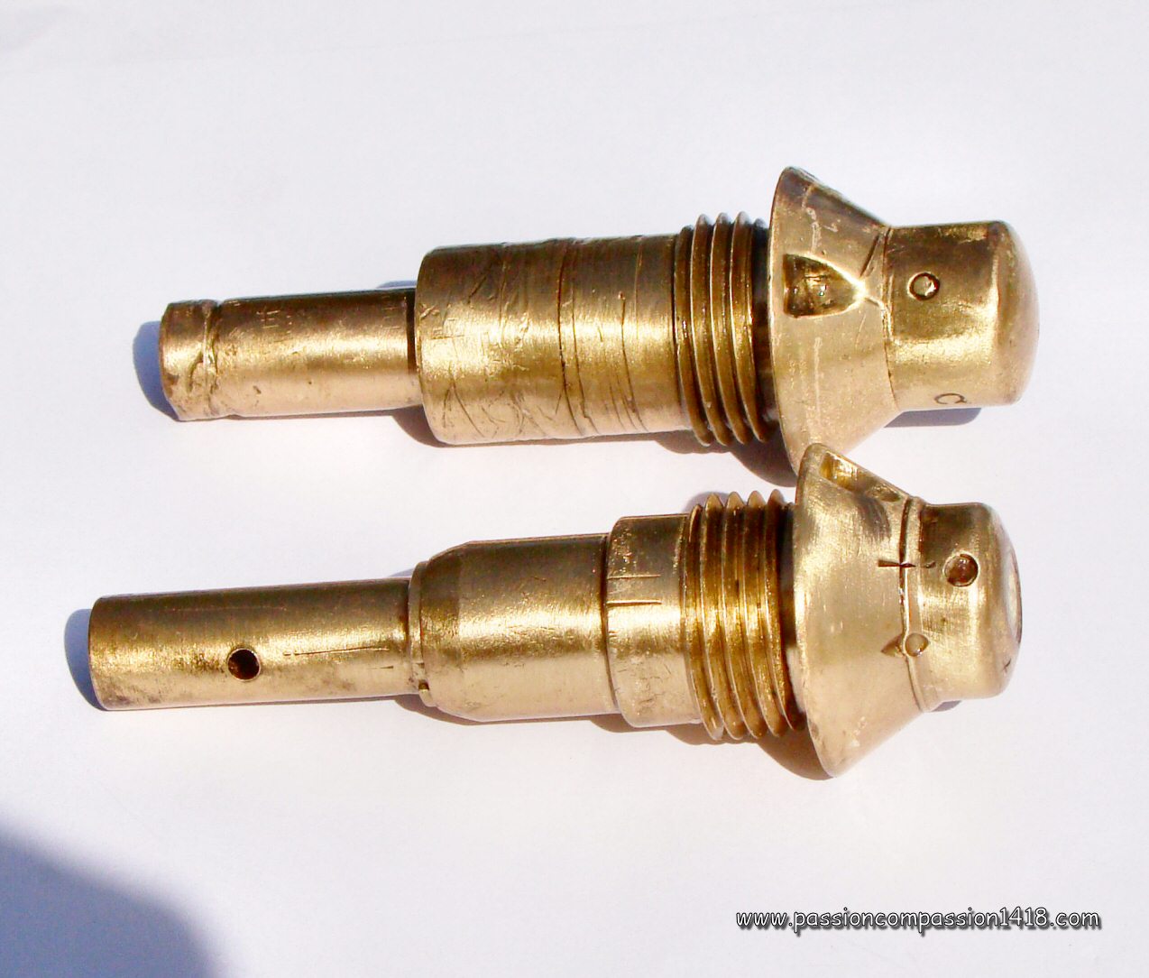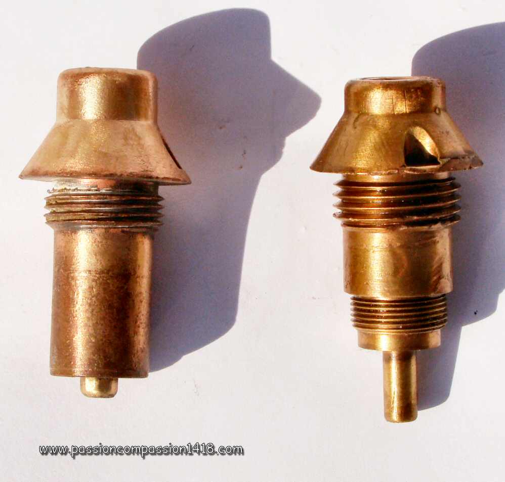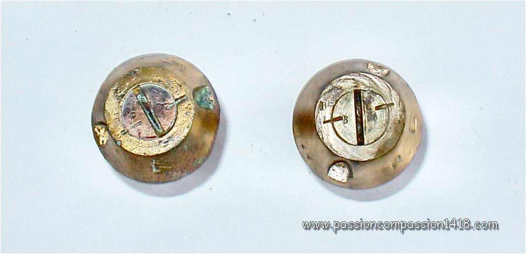 Fusée à double effet 30/38 Mod 1884 (T). A l'examen, deux différences notables apparaissent pour ces fusées. Celle de gauche possède un tenon et est donc une Mle 1884 T (alors que cette fusée est datée 1887 et que les tenons ne sont apparus qu'en 1902 - peut-être une fusée 1884 originale modifiée ?), celle de droite n'en possède pas et est donc une Mle 1884. De plus les longueurs des filetages sont sensiblement différentes |