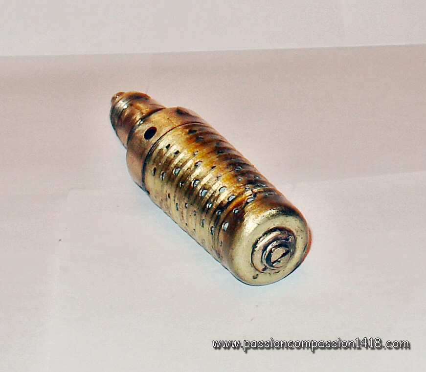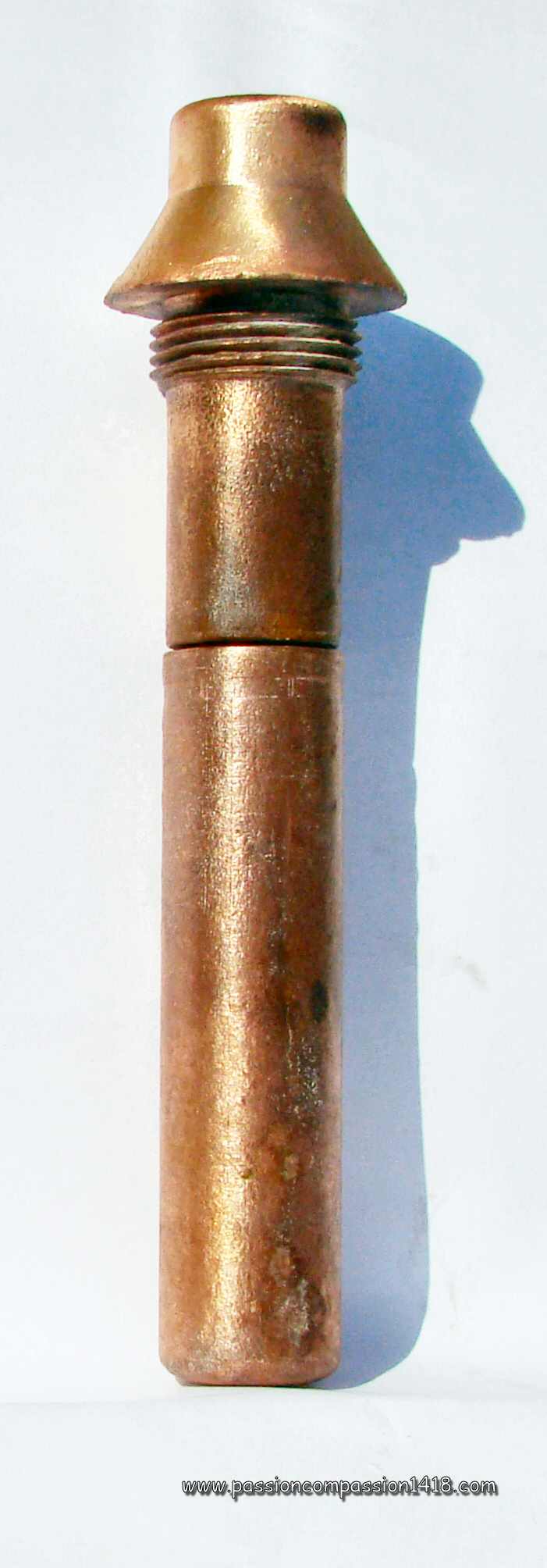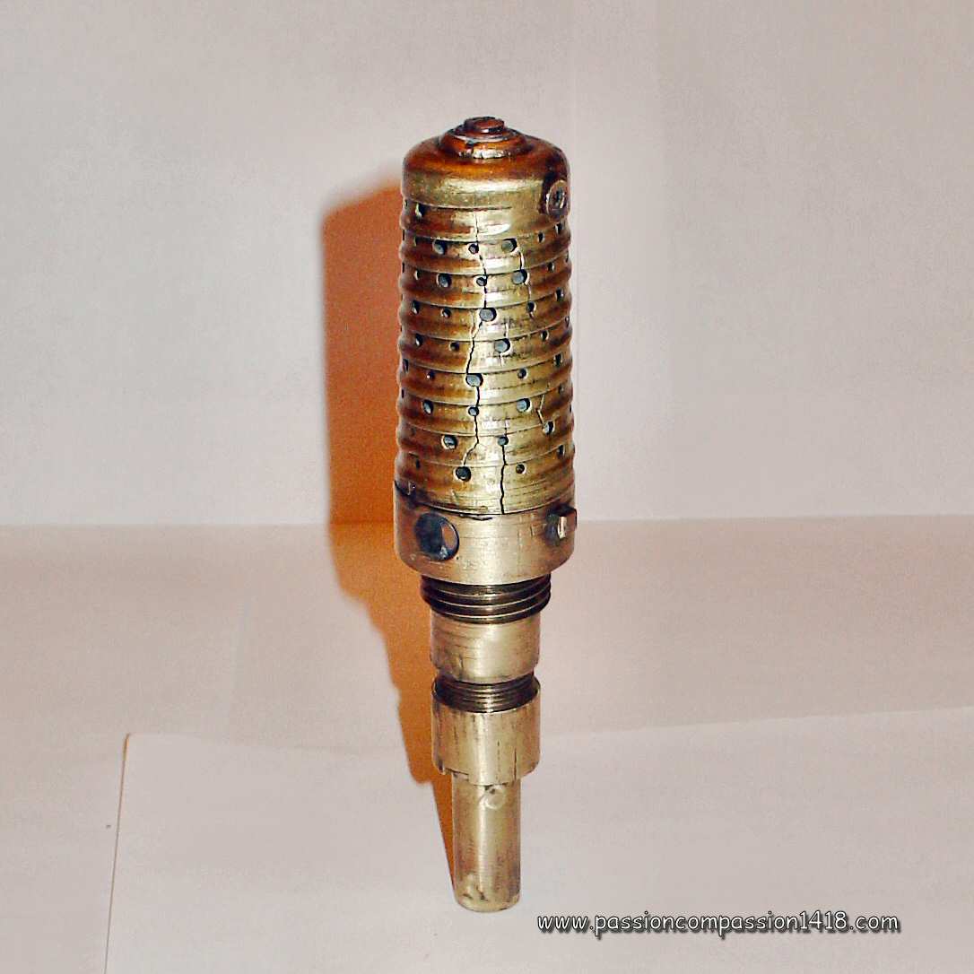 Fusée concutante de 22/24. Vue du dessus avec le bouchon vissé de tête donnant accès au porte rugueux mobile, et une des fenètres par lesquelles les flammes de la charge incendiaire pouvaient jaillir. |