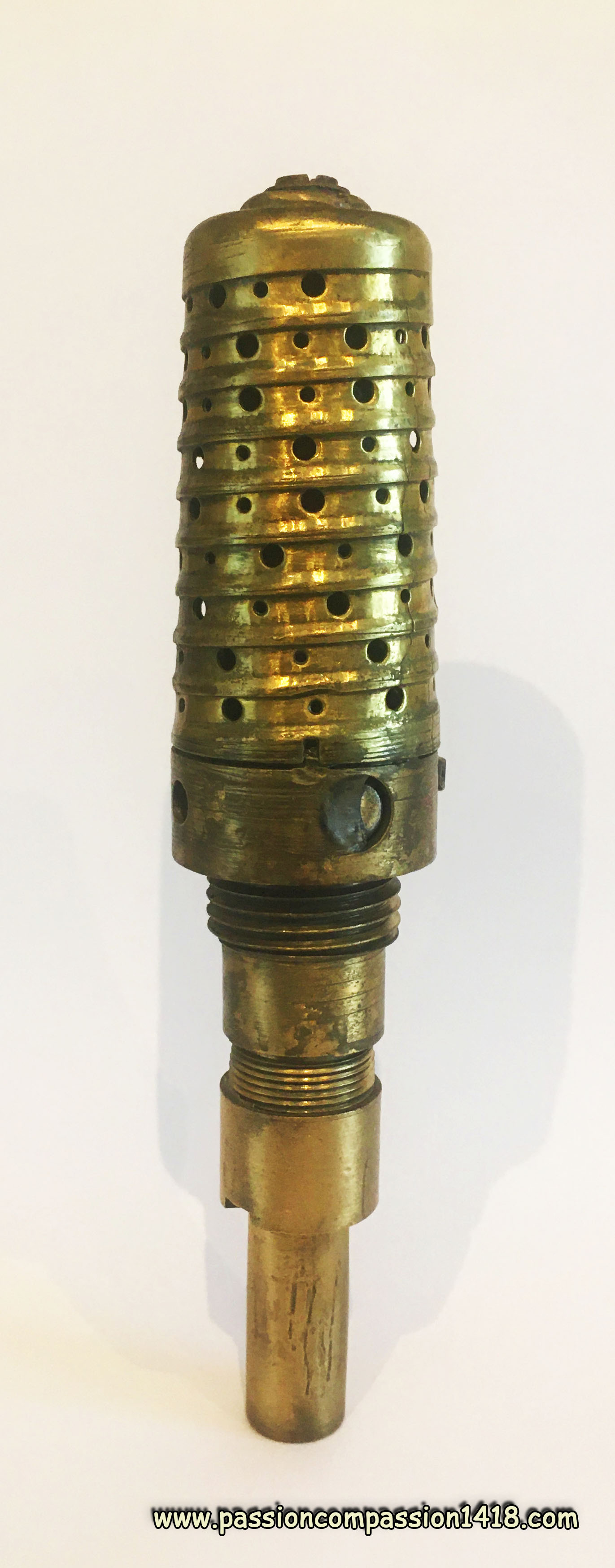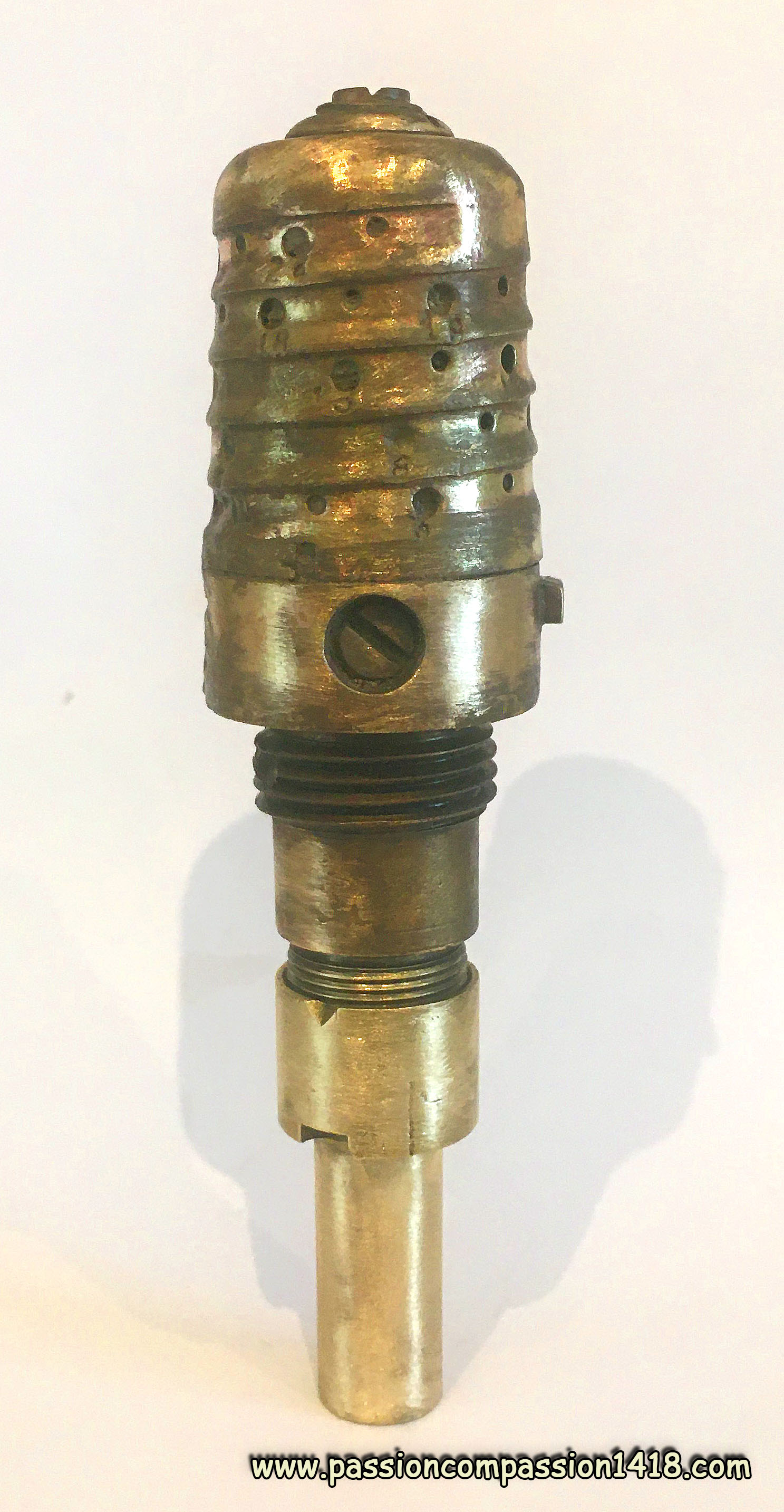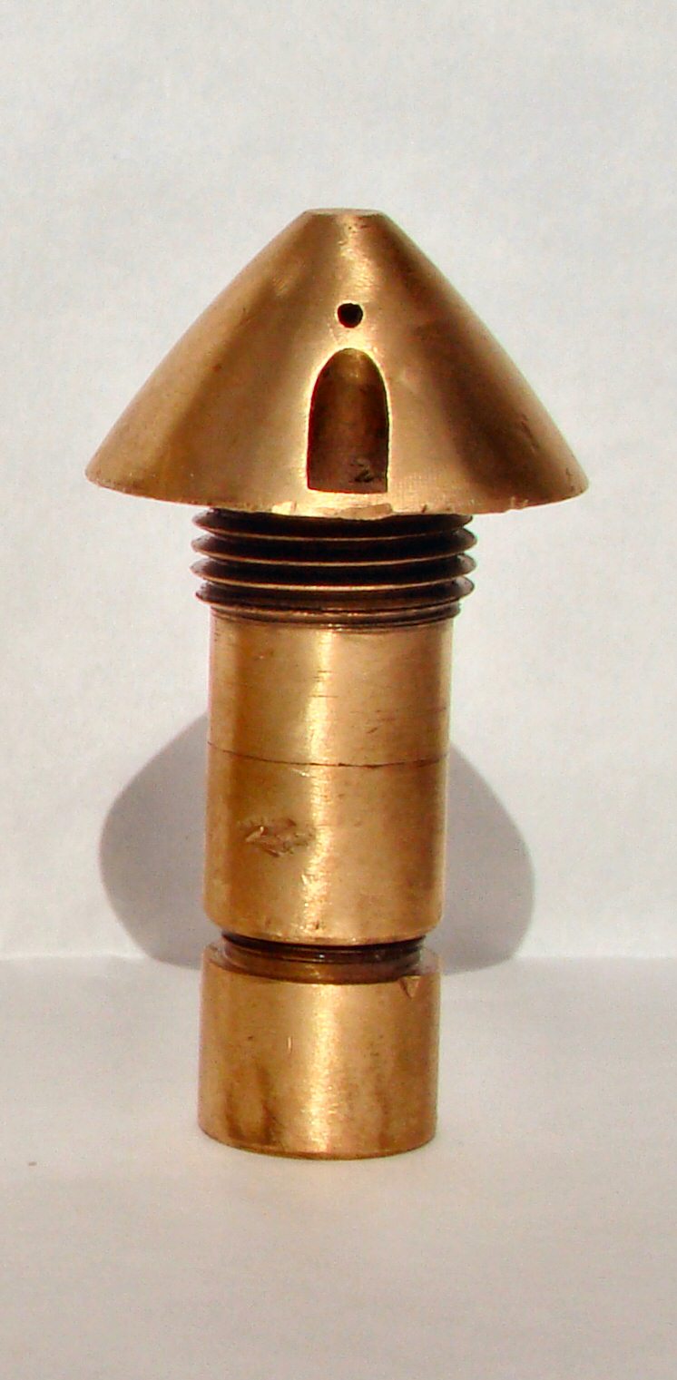 Fusée concutante de 22/24. Vue du dessus avec le bouchon vissé de tête donnant accès au porte rugueux mobile, et une des fenètres par lesquelles les flammes de la charge incendiaire pouvaient jaillir. |