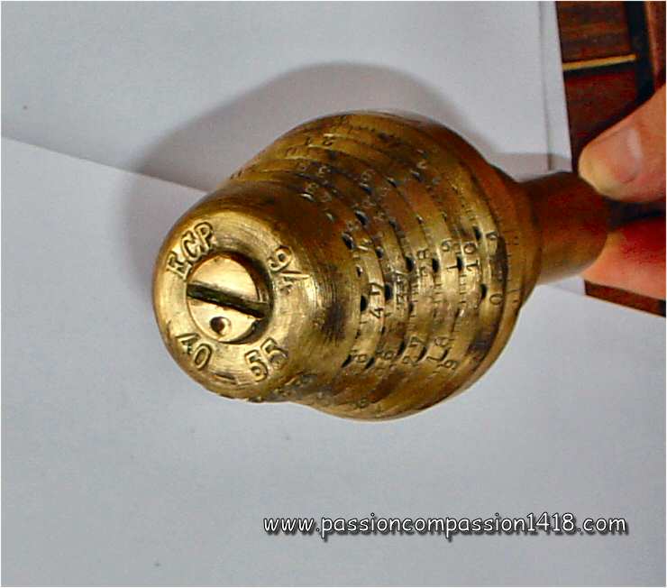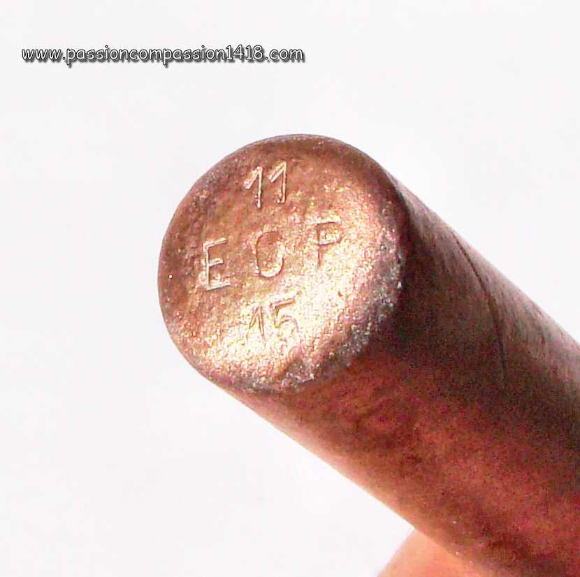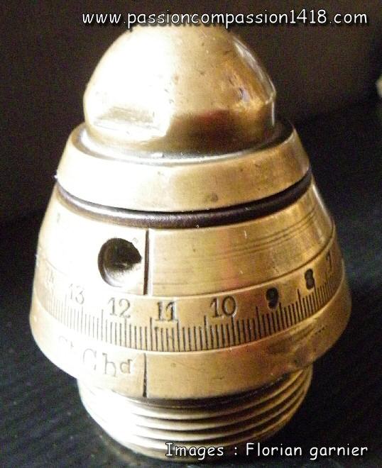 Fusée 22/31 Mod 1897. détail de dessus : inscriptions'ECP 10 05' - '22-31 Mle 97' |