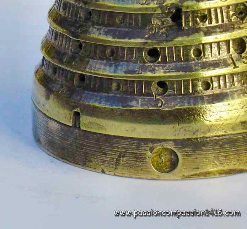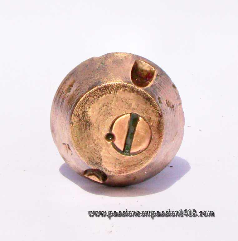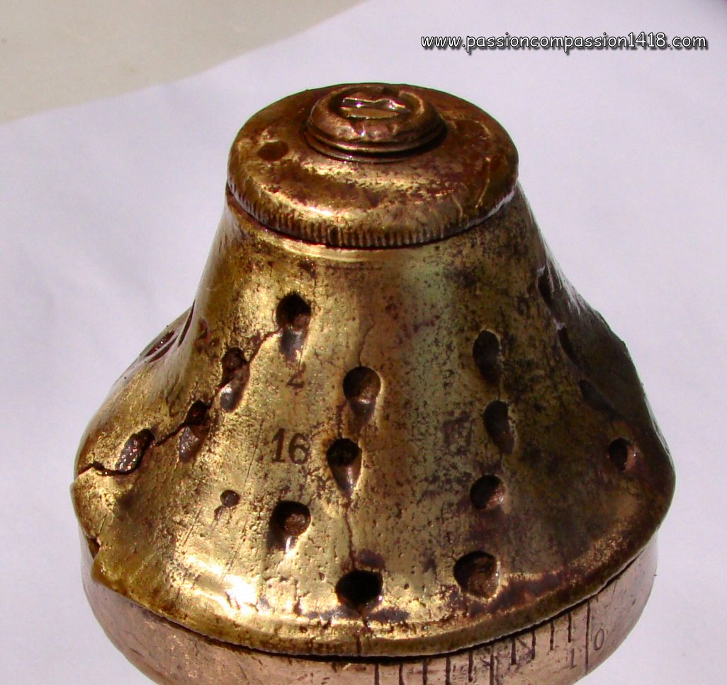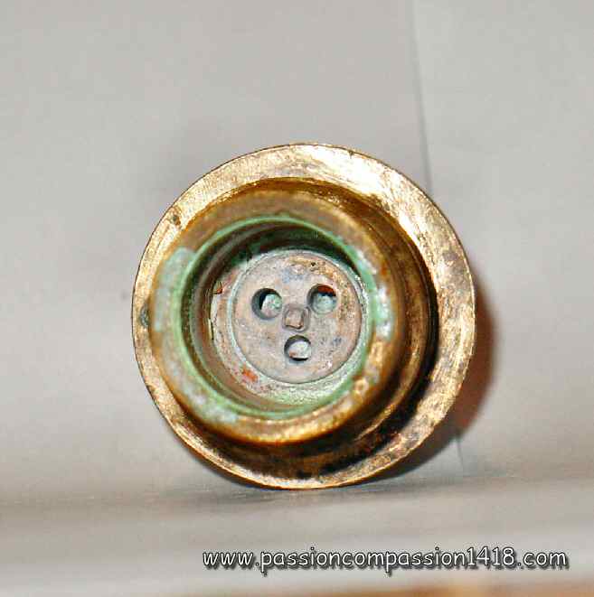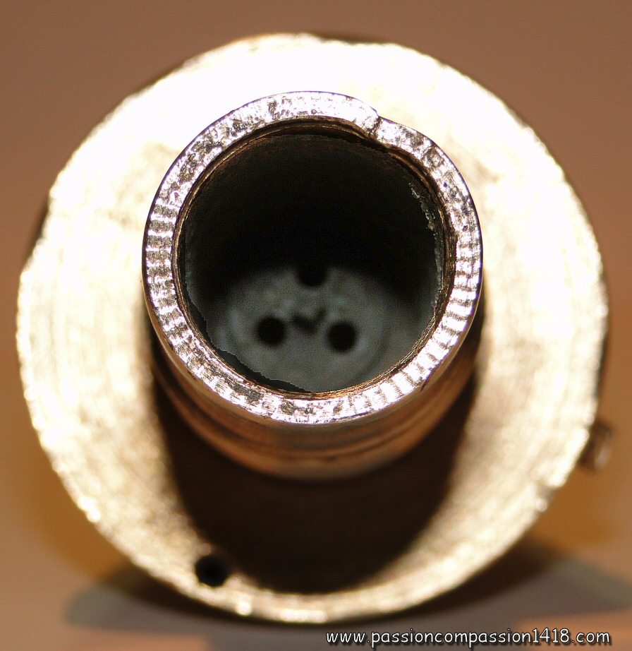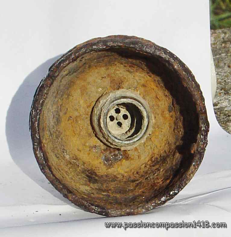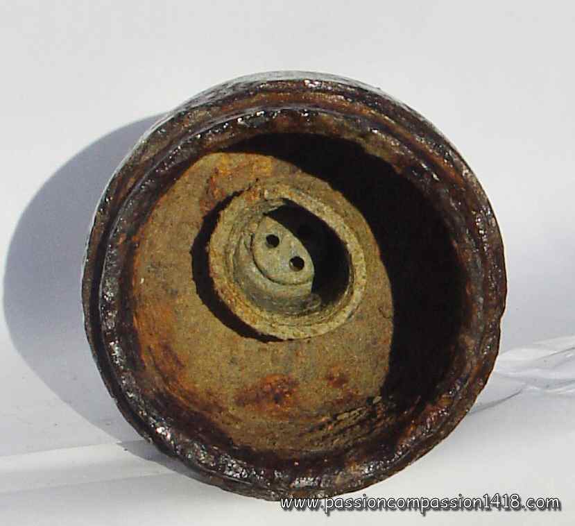 Fusée 30/55 Mod 1889 T. Vue du dessous montrant les orifices de mise à feu de la charge principale depuis le système fusant, et le rugueux de ce modèle à double effet. Photo Luc Malchair |