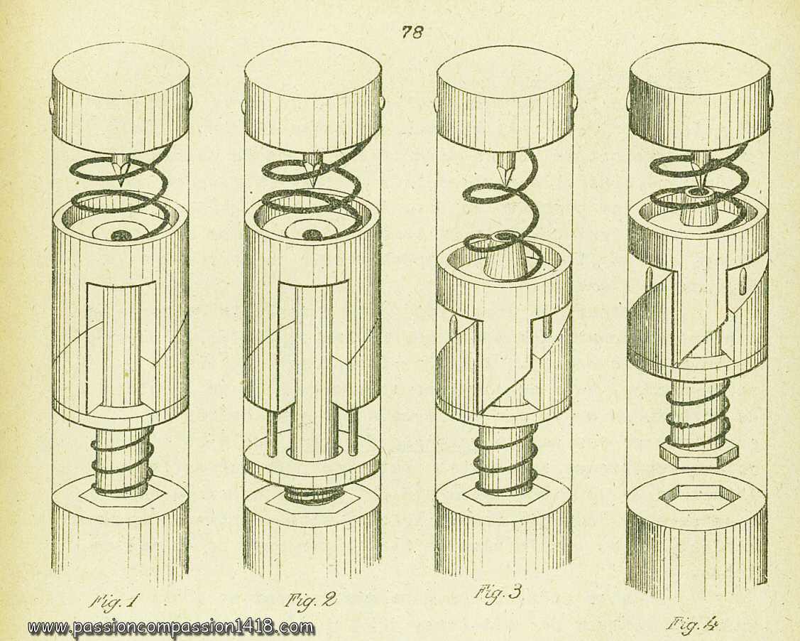 Fusée 25/38 Mod 74 Henriet. Schéma moderne montrant la séquence d'armement par agrafe et la percussion à l'arrivée. Remarquer la chambre à poudre parralèle au logement du mécanisme percutant, courte, et donc typique d'un modèle 74 original. |