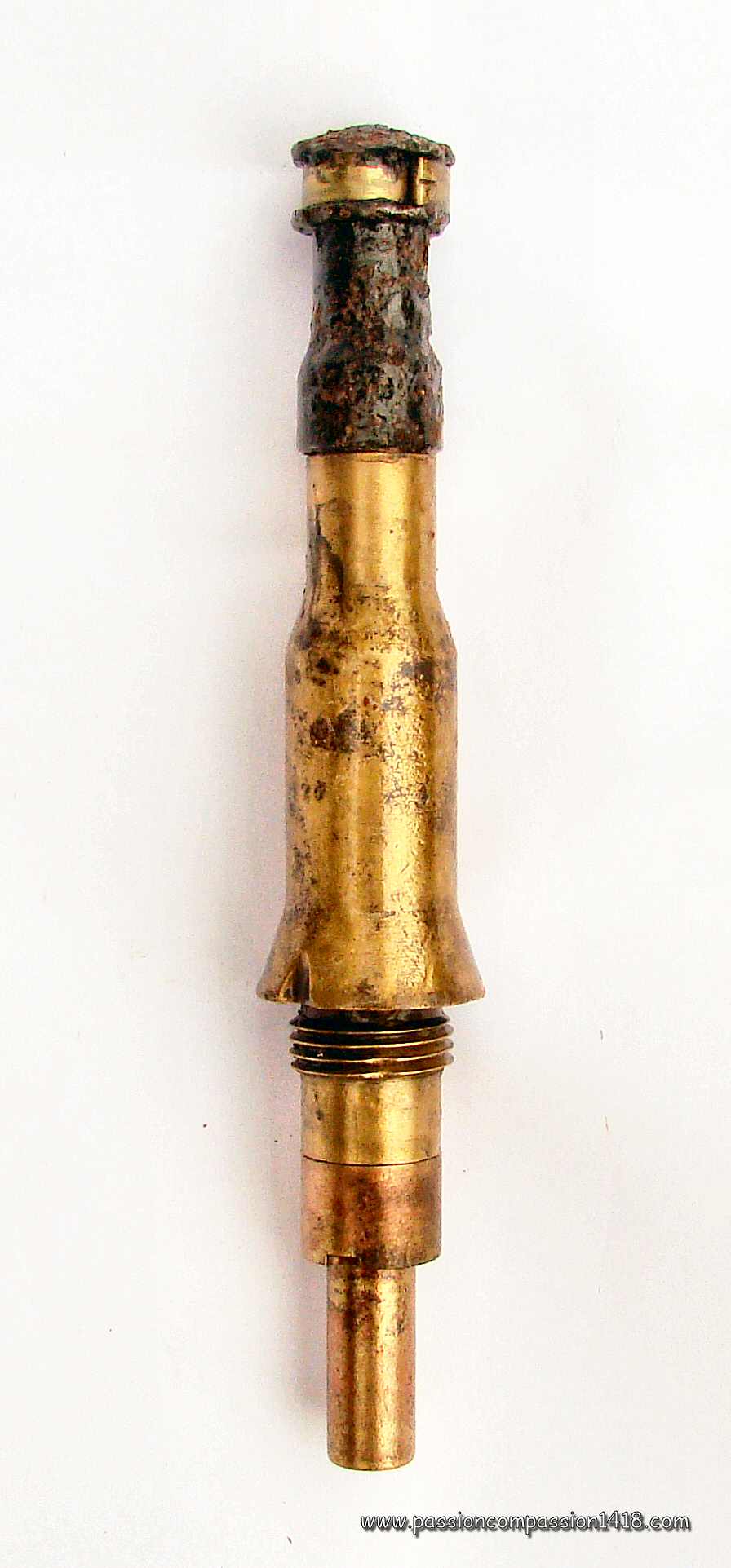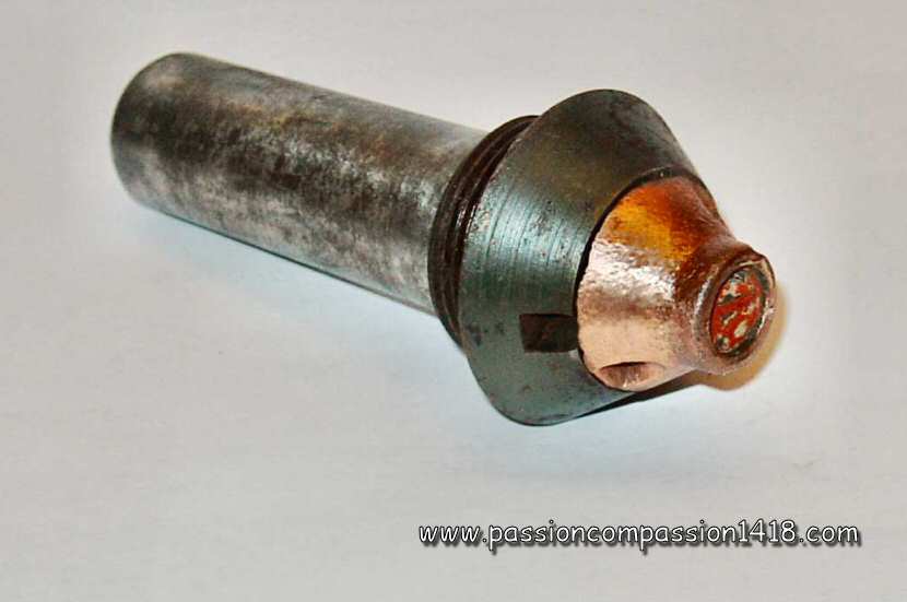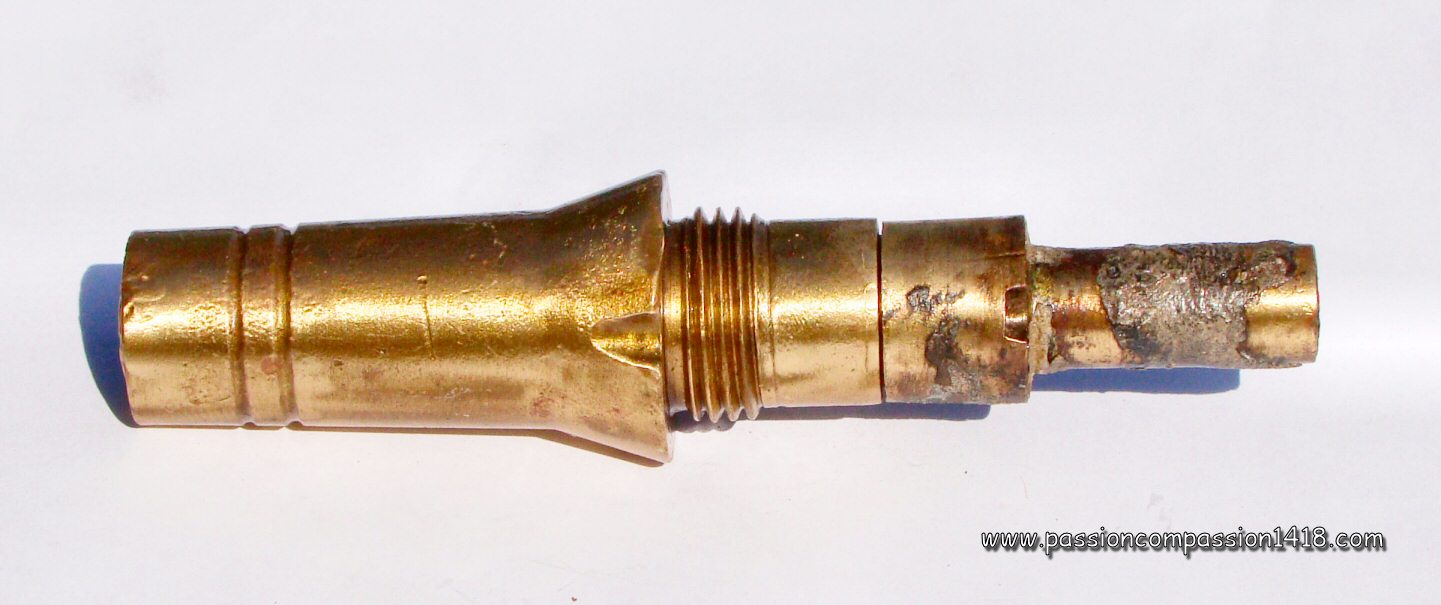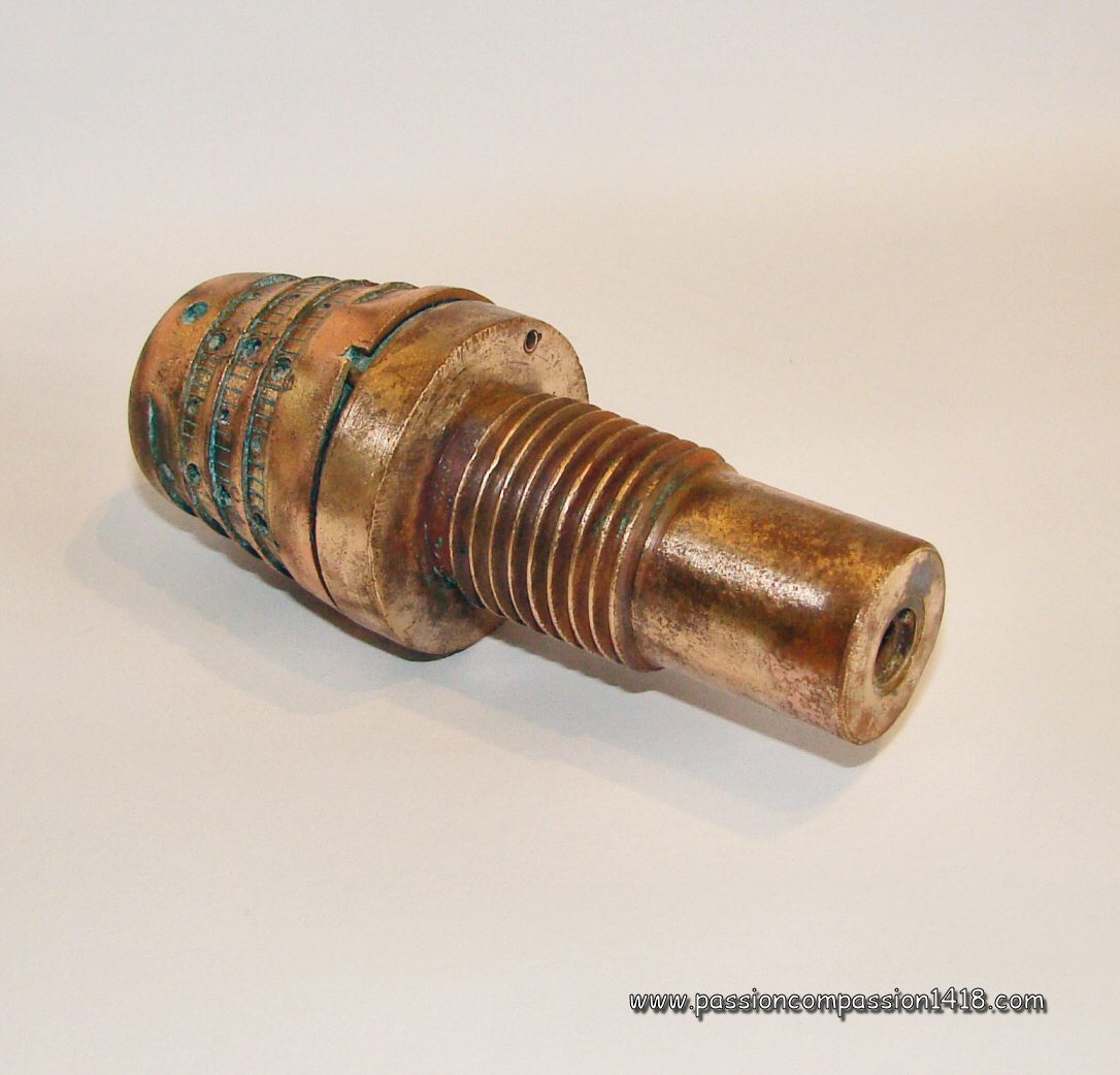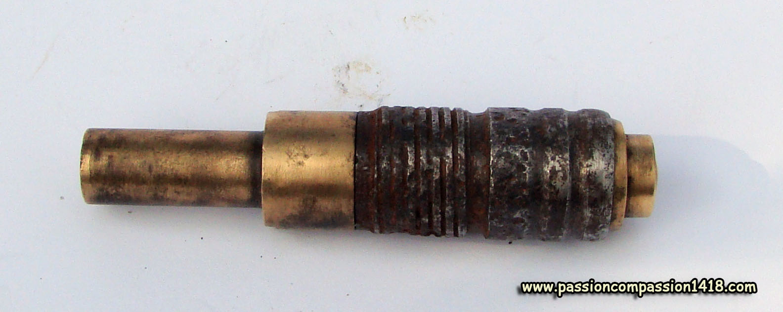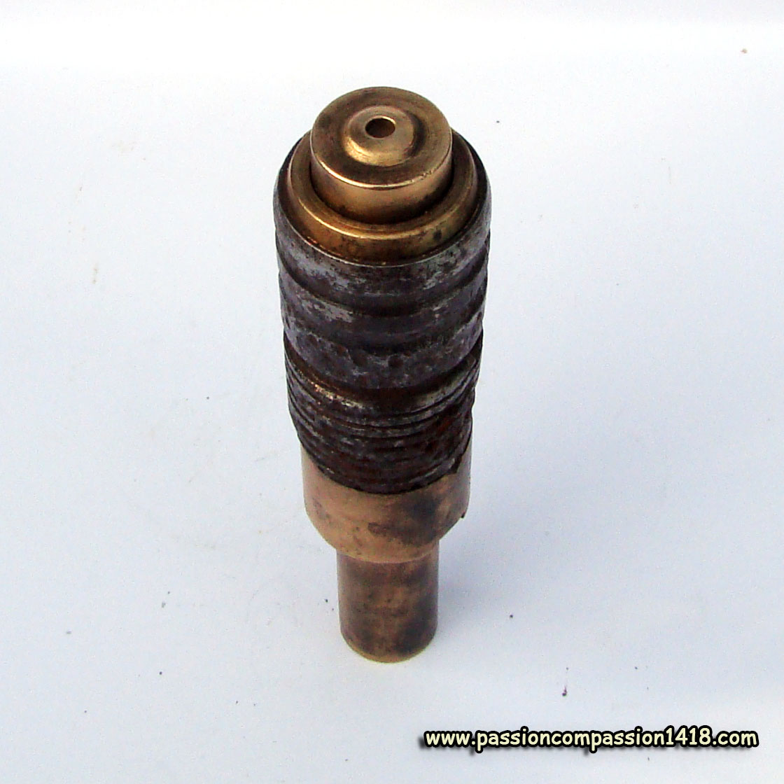 Fusée 25/38 Mod 74/75 Henriet. Remarquer le trou latéral dans le filetage, foré pour permettre la communication entre le haut de la chambre à poudre et le système percutant. Son positionnement permet d'identifier un modèle 74/75 doté d'une chambre allongée. |