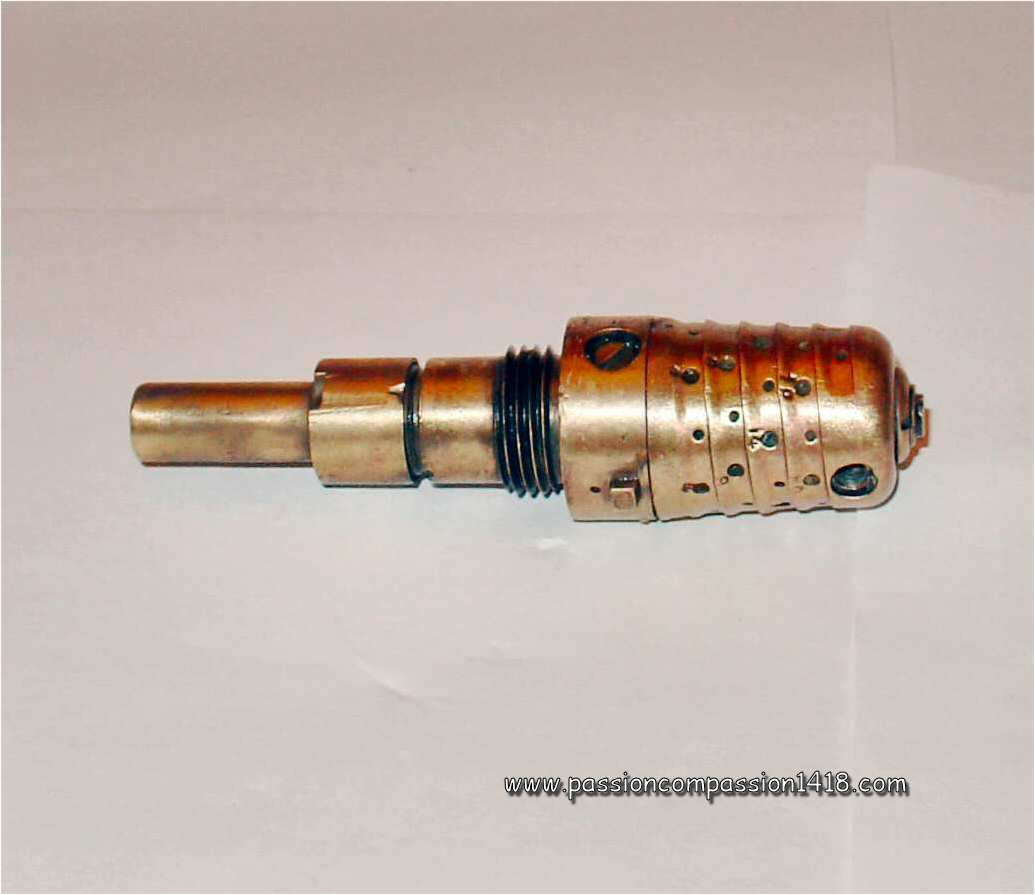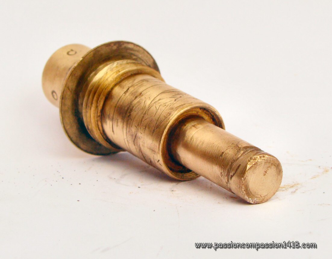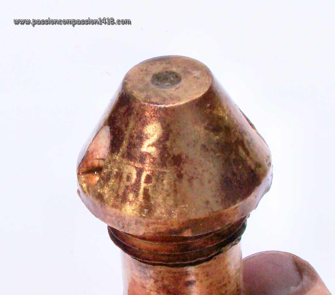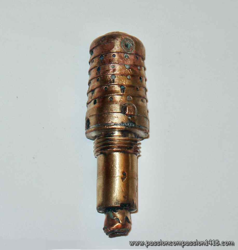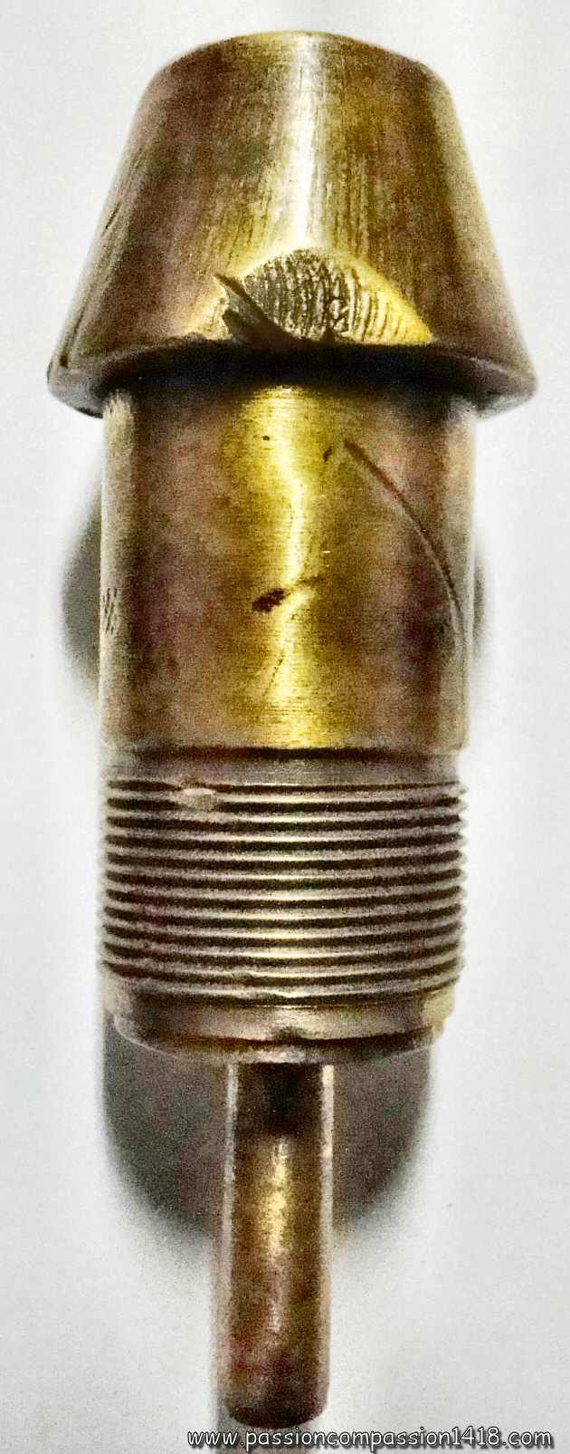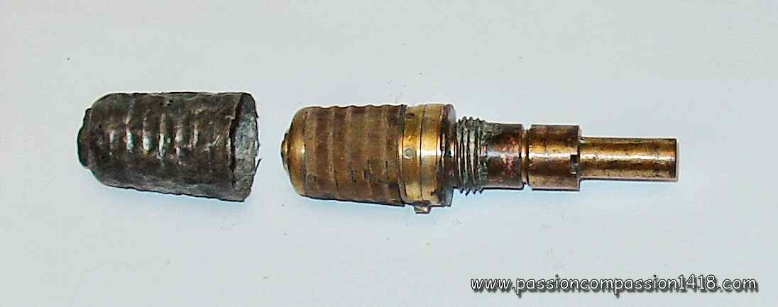 Fusée 25/38 Mod 74/75 Henriet. Remarquer le trou latéral dans le filetage, foré pour permettre la communication entre le haut de la chambre à poudre et le système percutant. Son positionnement permet d'identifier un modèle 74/75 doté d'une chambre allongée. |