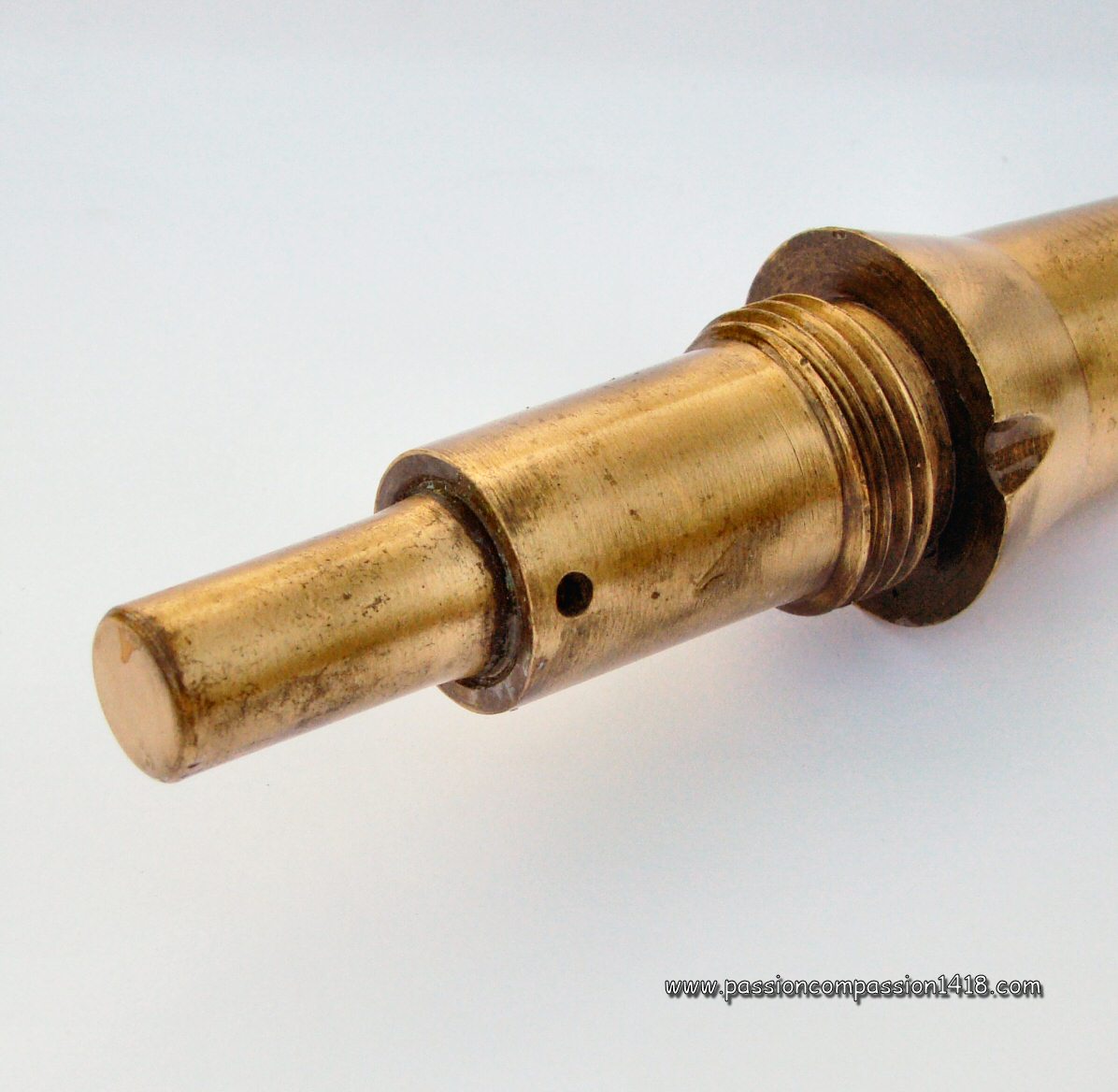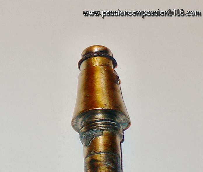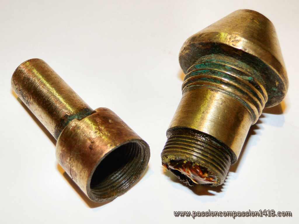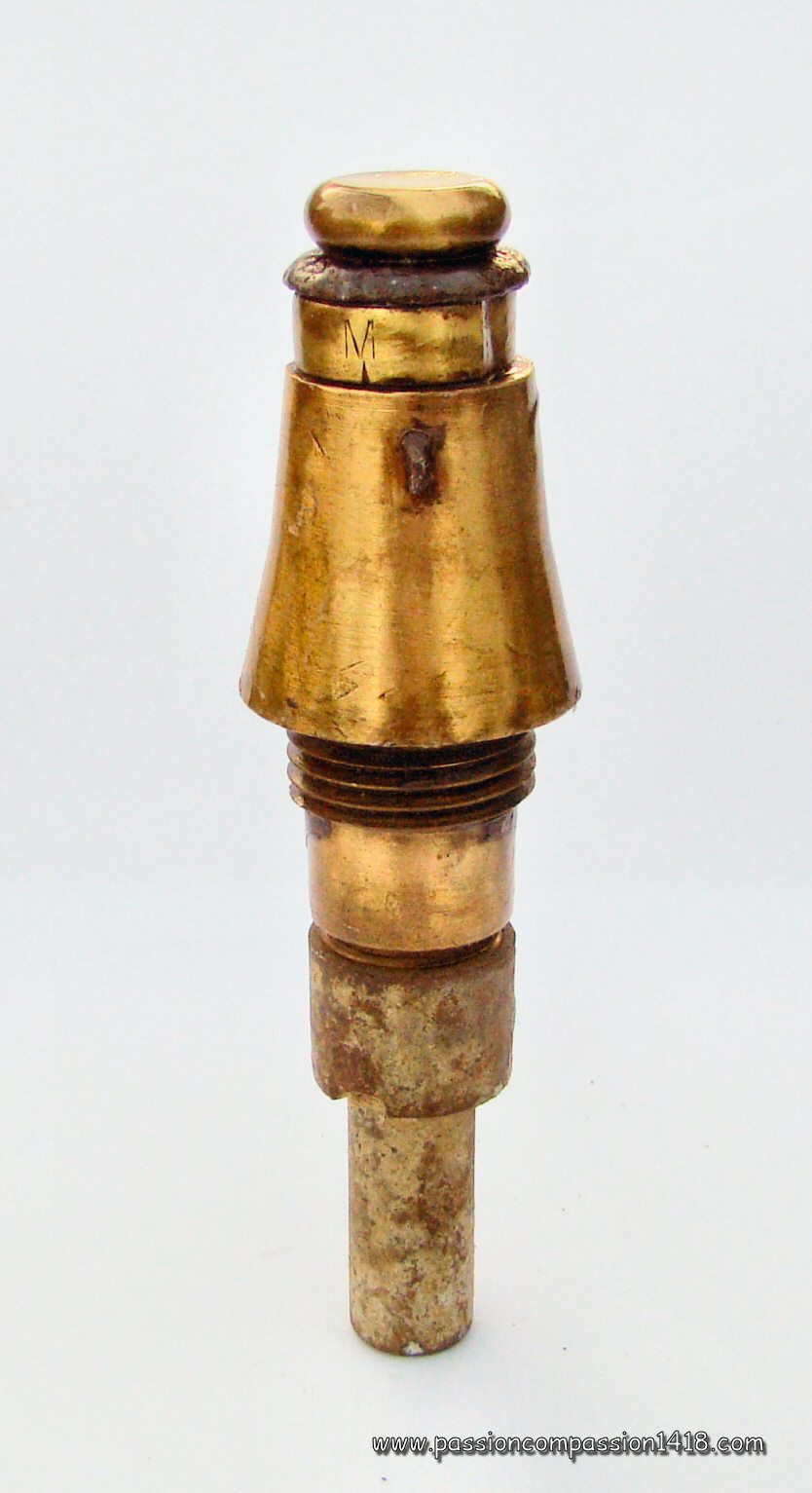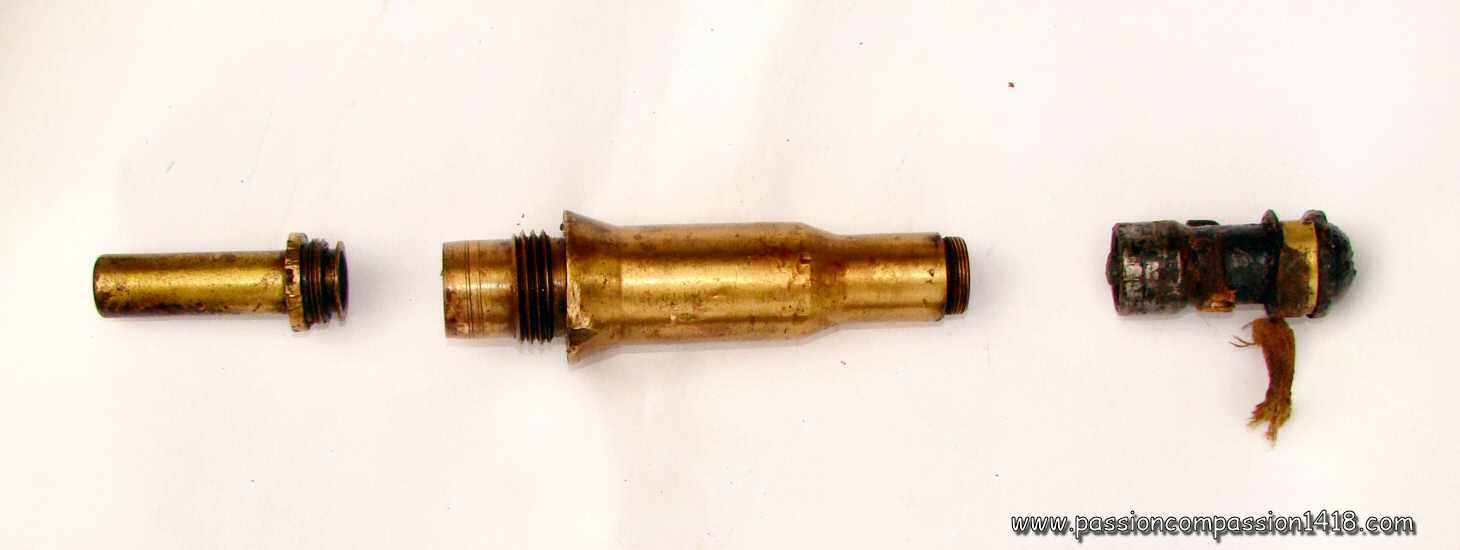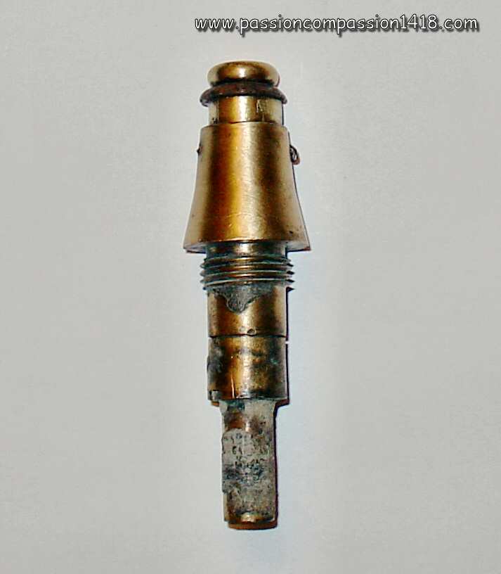 Fusée 25/38 Mod 74/75 Henriet. Remarquer le trou latéral dans le filetage, foré pour permettre la communication entre le haut de la chambre à poudre et le système percutant. Son positionnement permet d'identifier un modèle 74/75 doté d'une chambre allongée. |