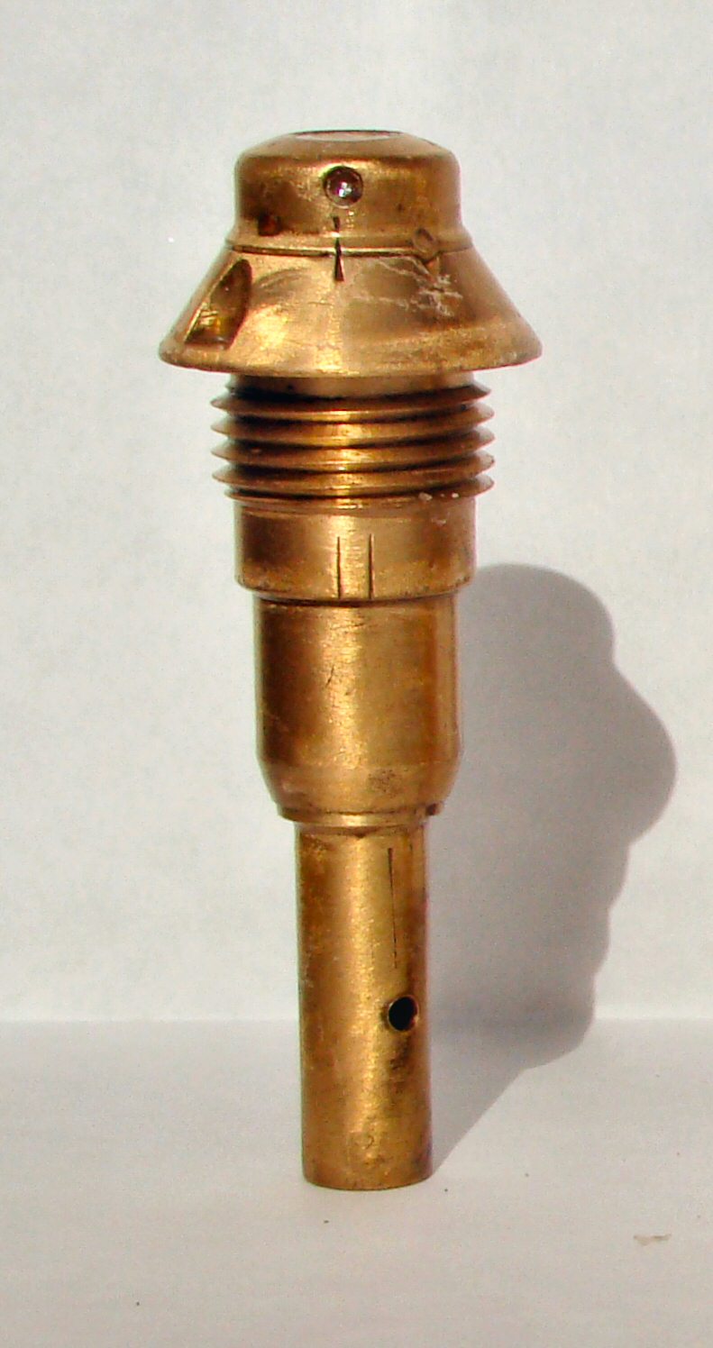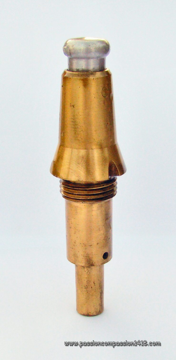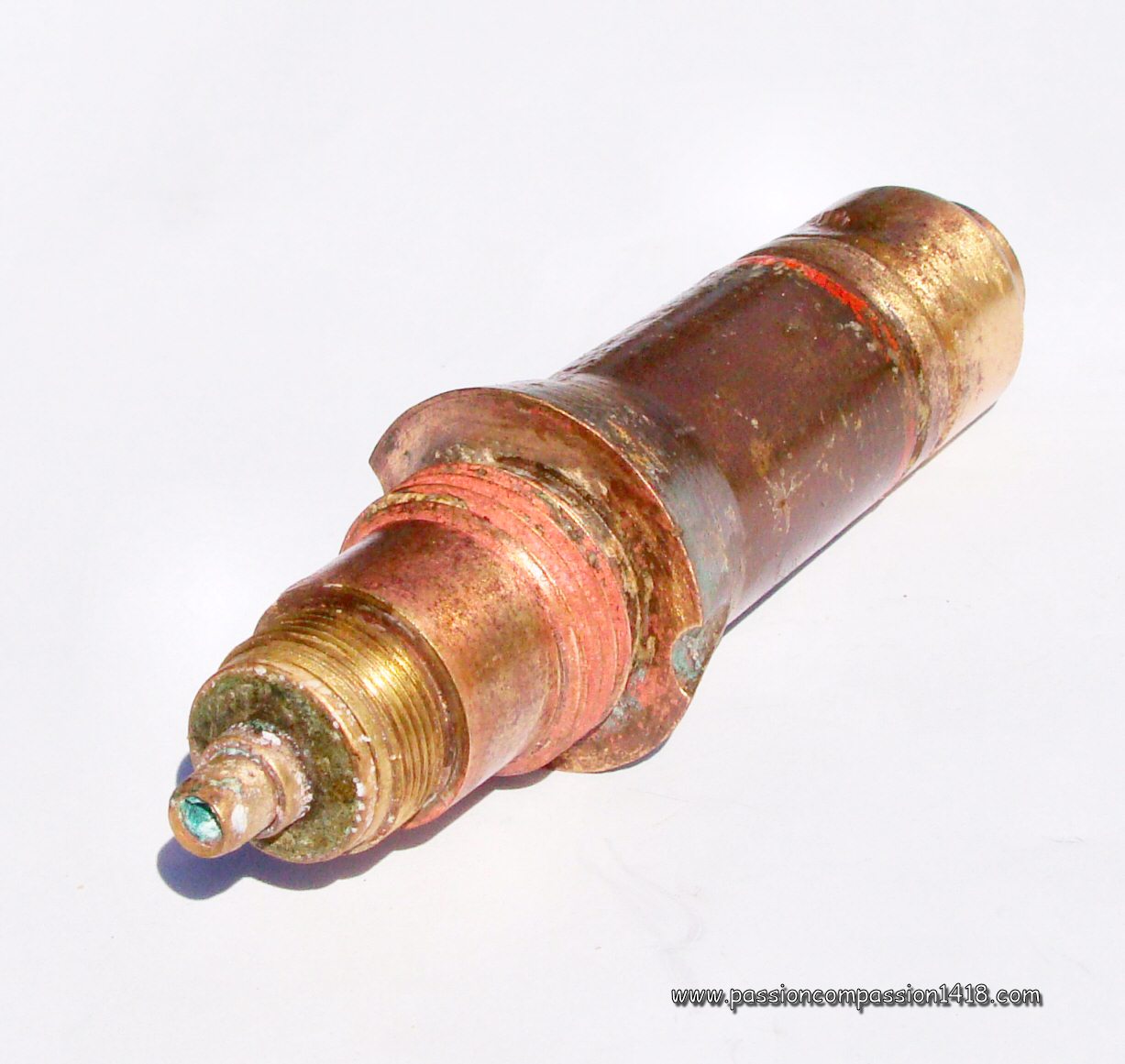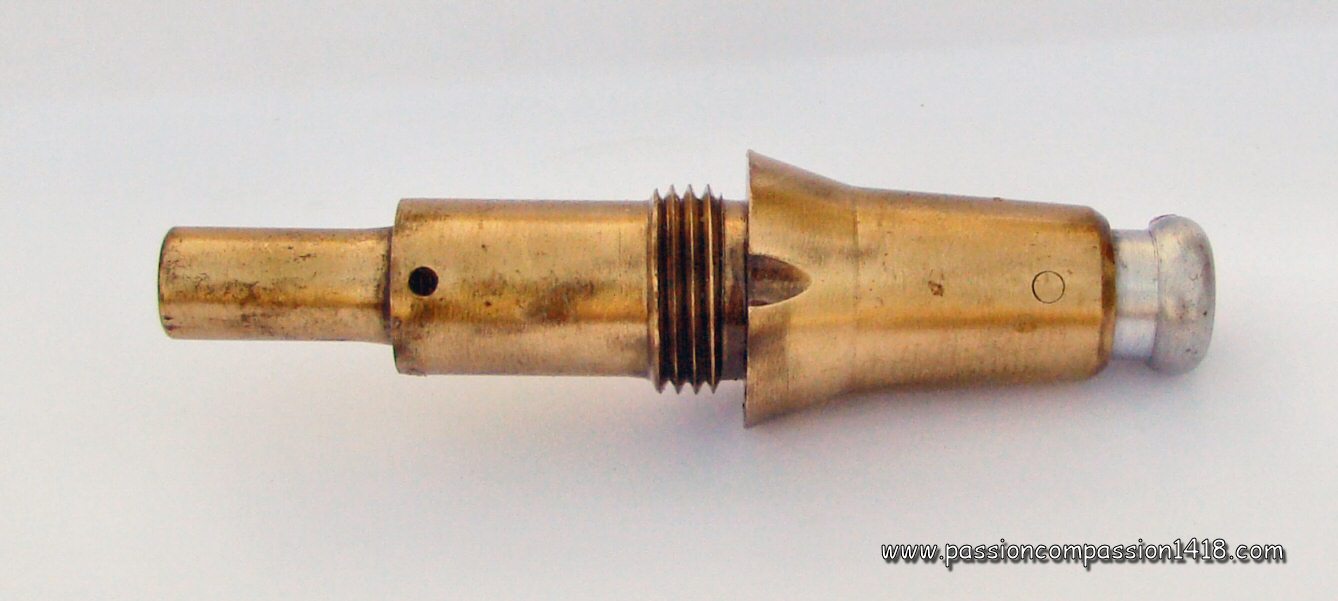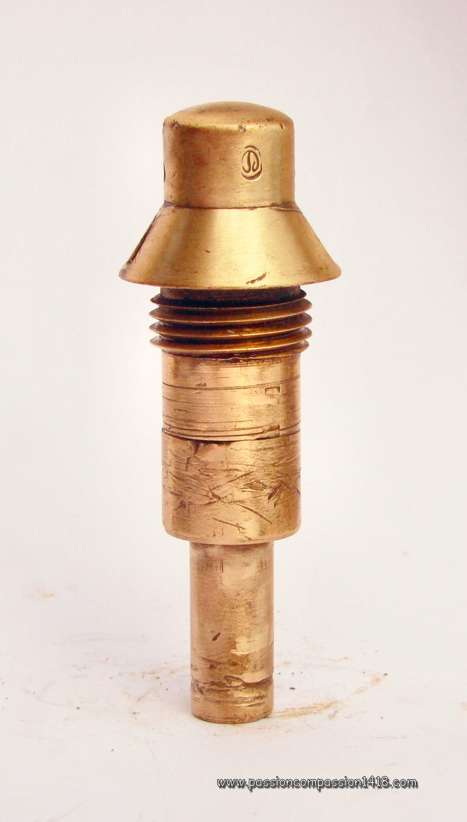 Fusée 25/38 Mod 74/75 Henriet. Remarquer le trou latéral dans le filetage, foré pour permettre la communication entre le haut de la chambre à poudre et le système percutant. Son positionnement permet d'identifier un modèle 74/75 doté d'une chambre allongée. |