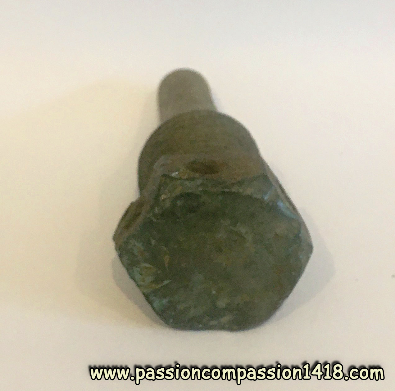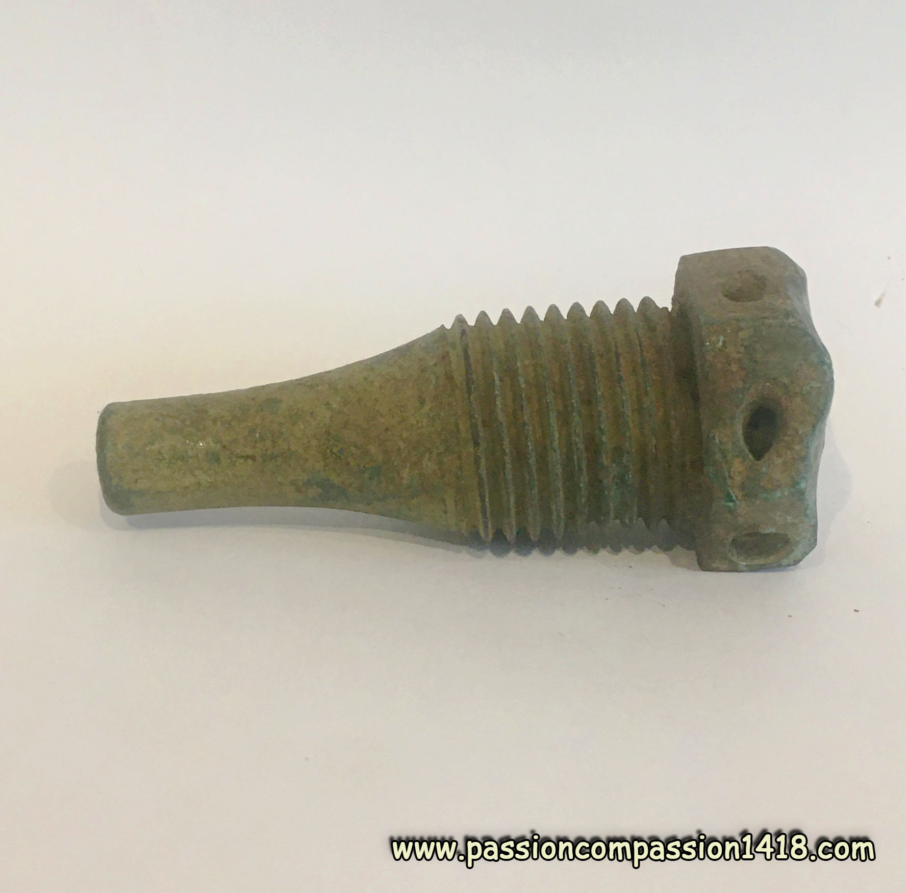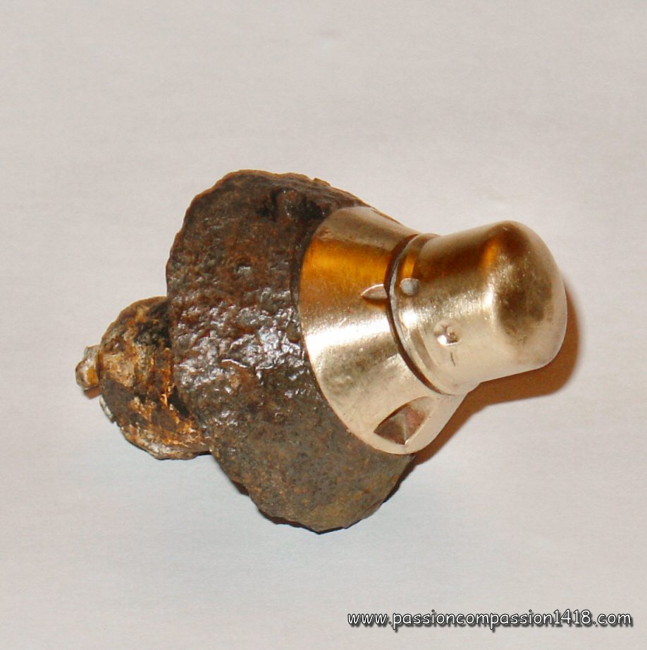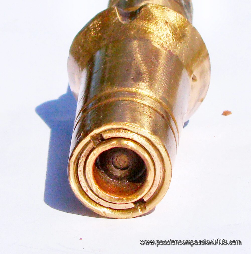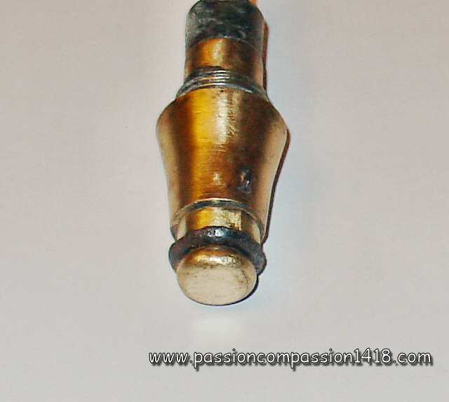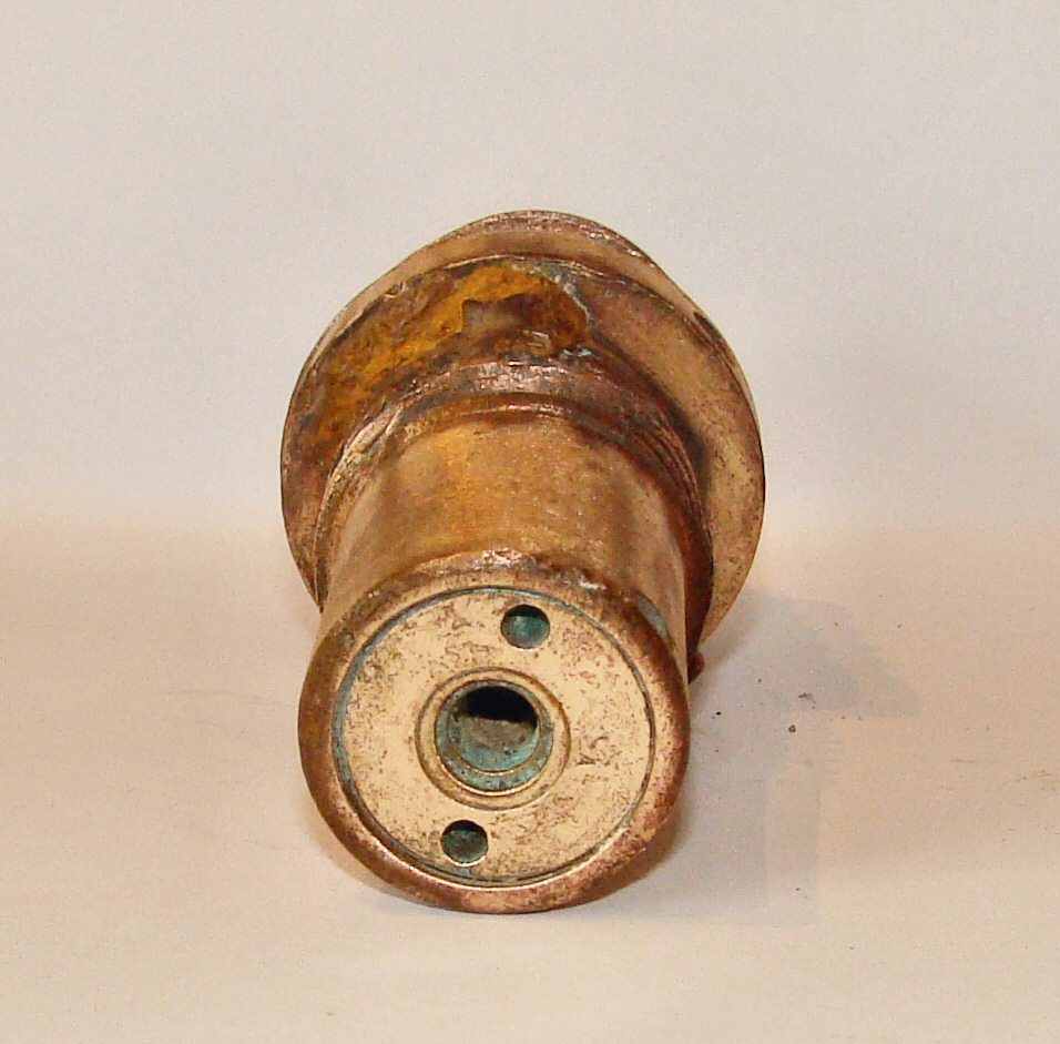 Fusée 25/38 Mod 74/75 Henriet. Remarquer le trou latéral dans le filetage, foré pour permettre la communication entre le haut de la chambre à poudre et le système percutant. Son positionnement permet d'identifier un modèle 74/75 doté d'une chambre allongée. |