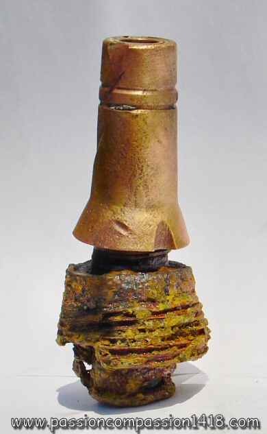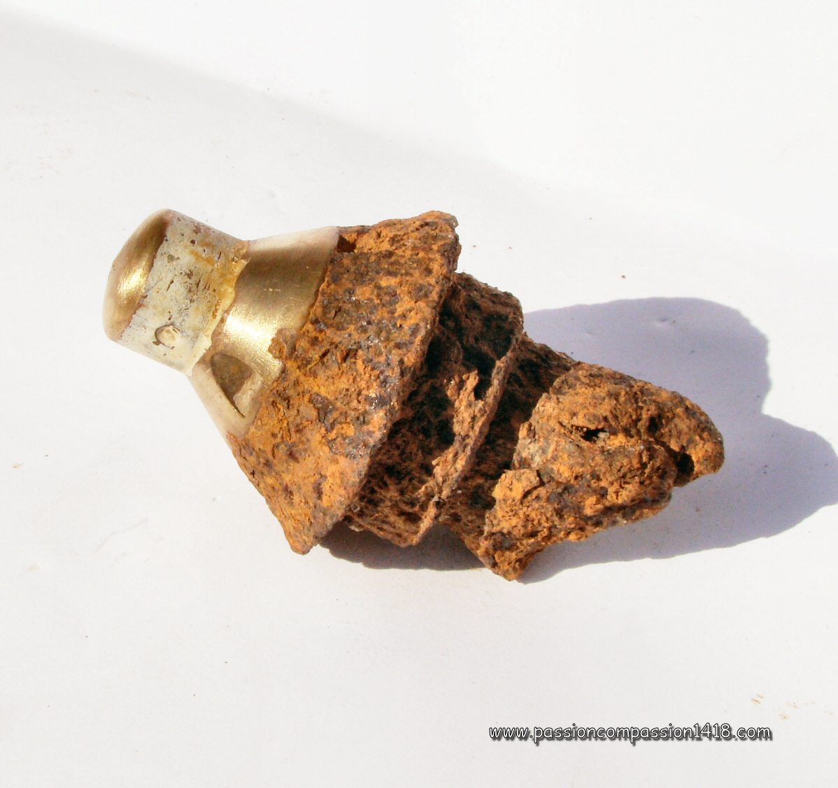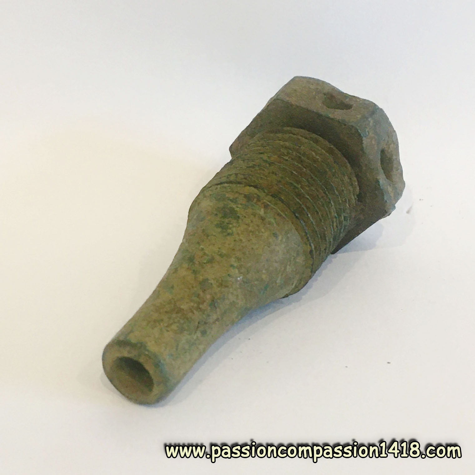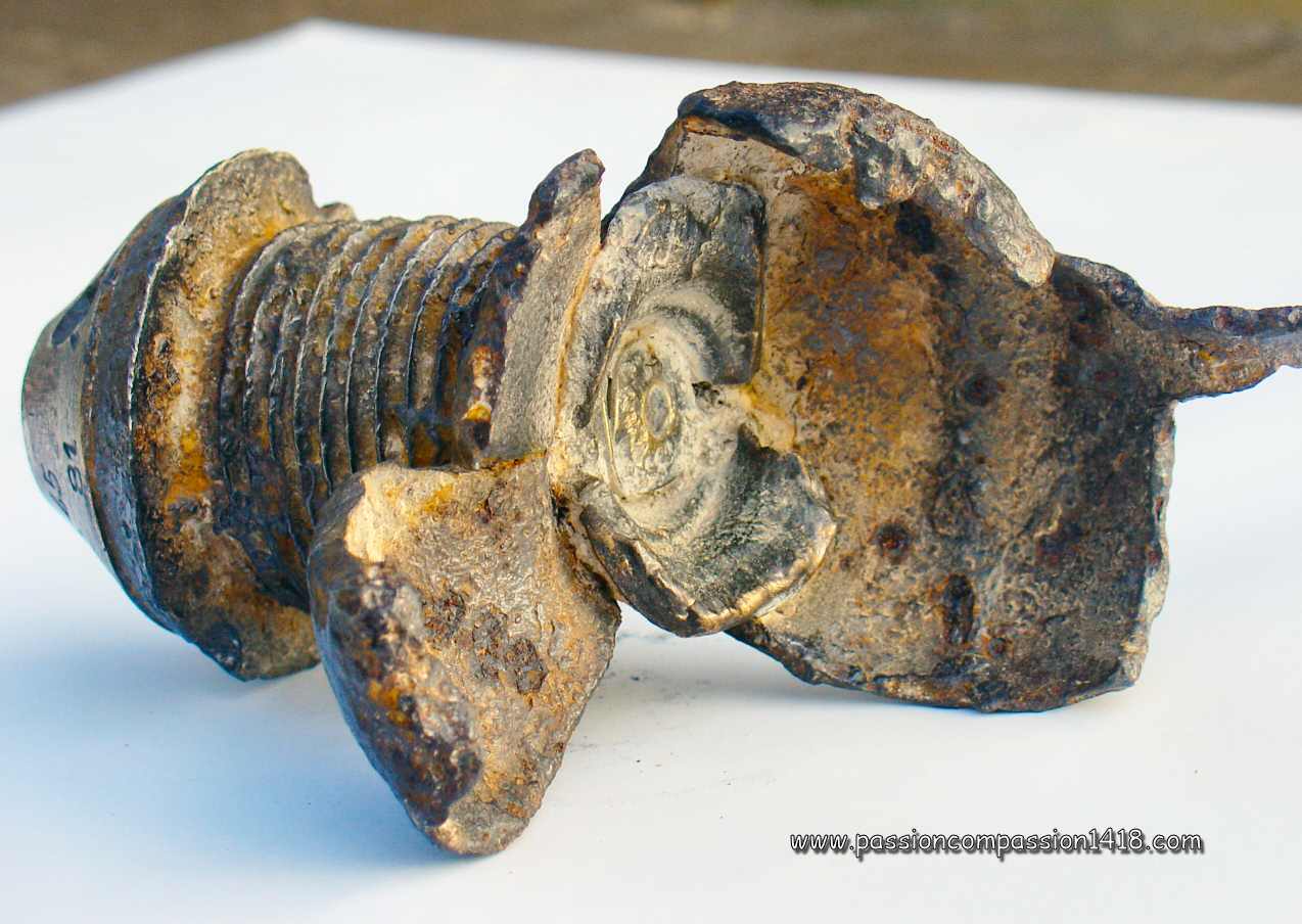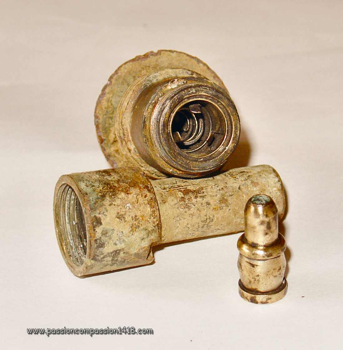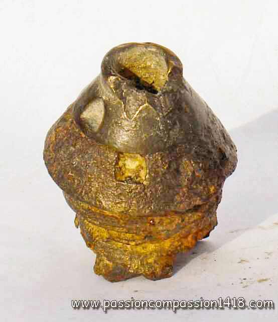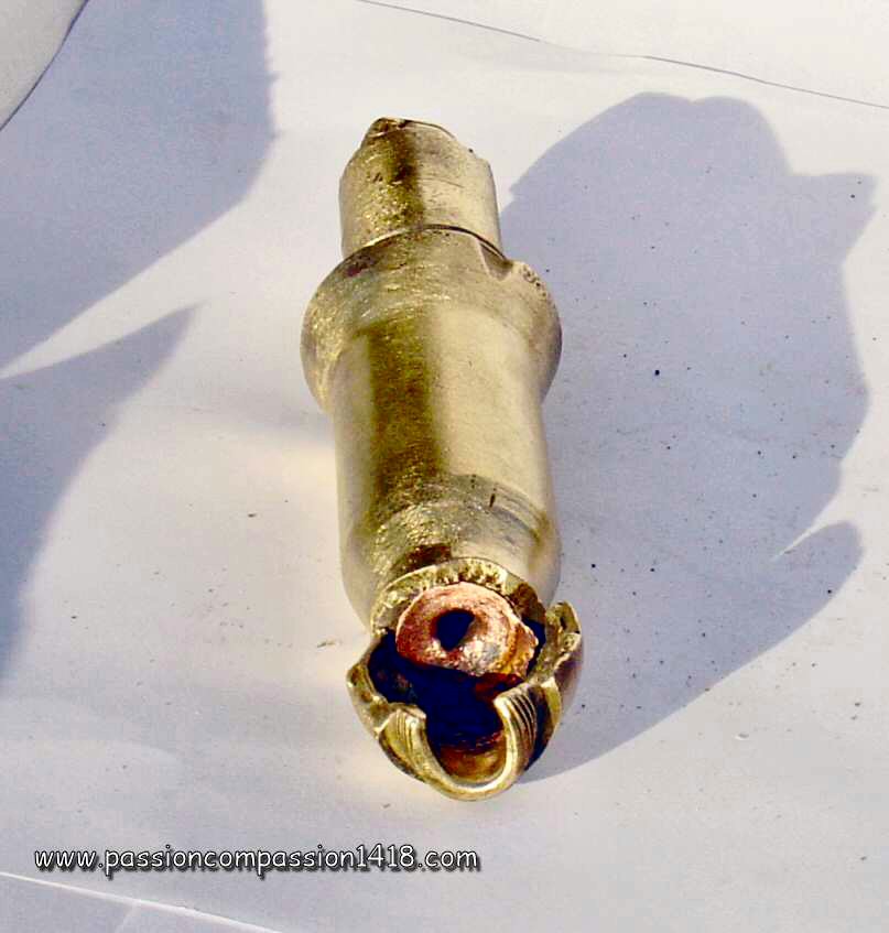 Fusée Schneider Mle 1915 pour moyen calibre. Un autre exemplaire observé en Champagne. Seule la partie haute a survécu : le filetage de 47,5 mm a été arraché |