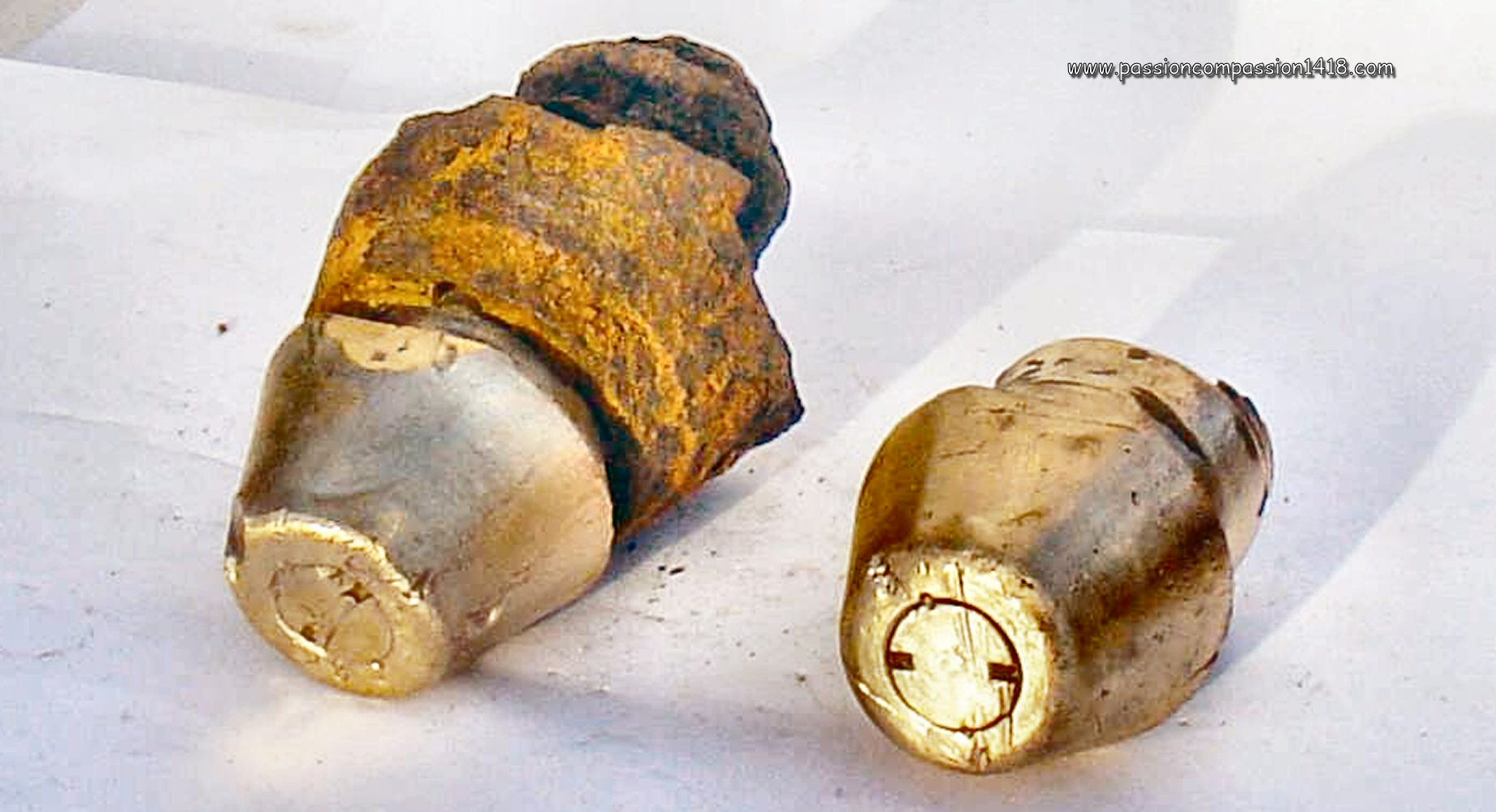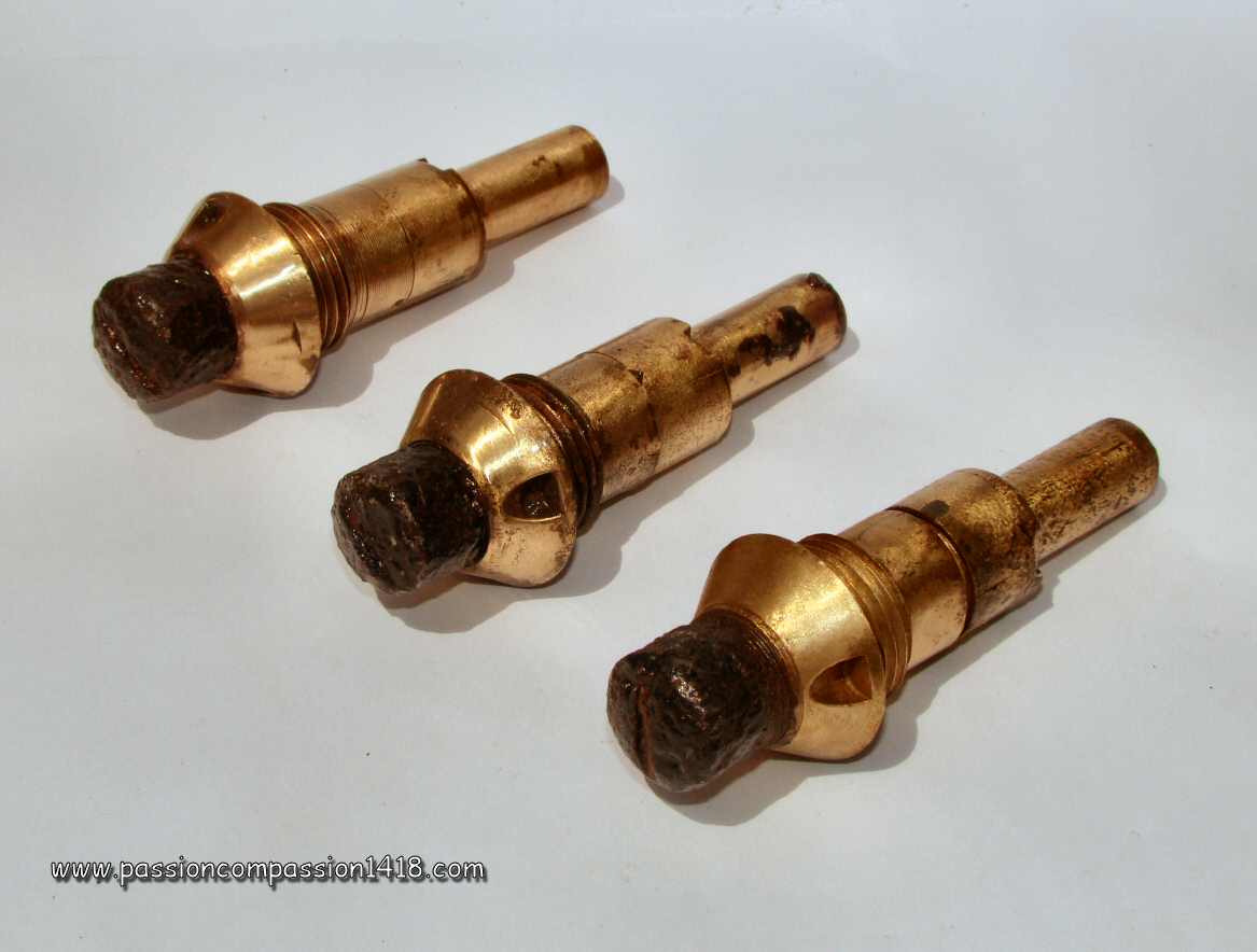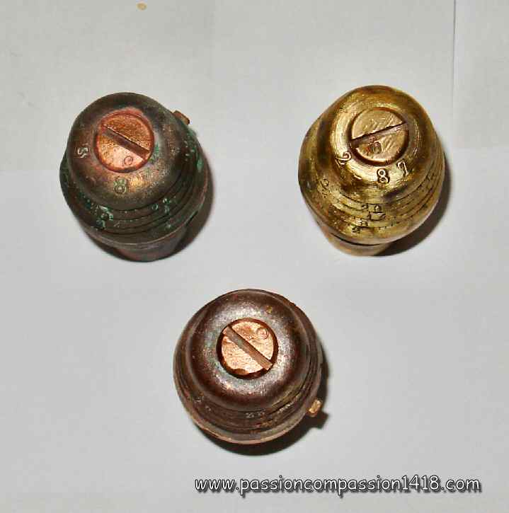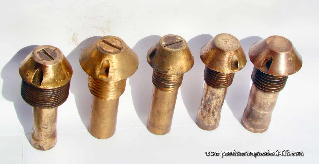Fusée 22/31 Mod 1897. Trois exemplaires observés en Champagne. Le premier a été débouché pour un fonctionnement à 12,2 secondes, le troisième à 17,3 secondes. Remarquer la déformation du second sous l'effet du choc d'arrivée |