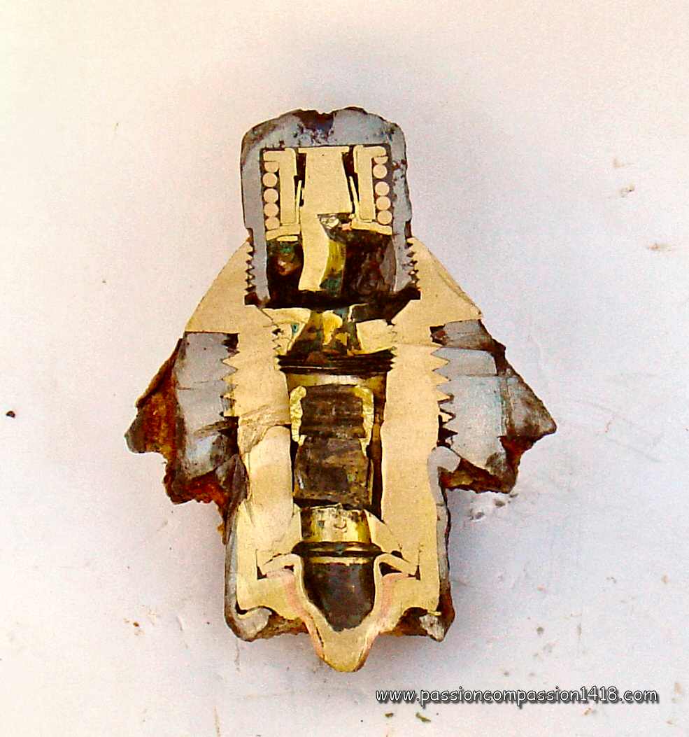 Fusée à double effet 30/38 Mod 1884 (T). Vue de l'intérieur de la queue. Le dispositif percutant a disparu, mais le rugueux est toujours en place, entouré des évents de mise à feu reliés au système fusant situé dans la tête |