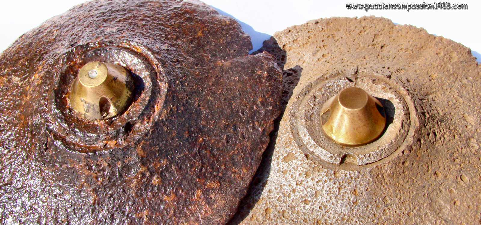 Fusée à double effet 30/38 Mod 1884 (T). Vue du dessous. Le système percutant de la fusée de gauche a disparu, éjecté par l'explosion |