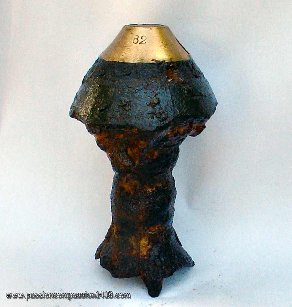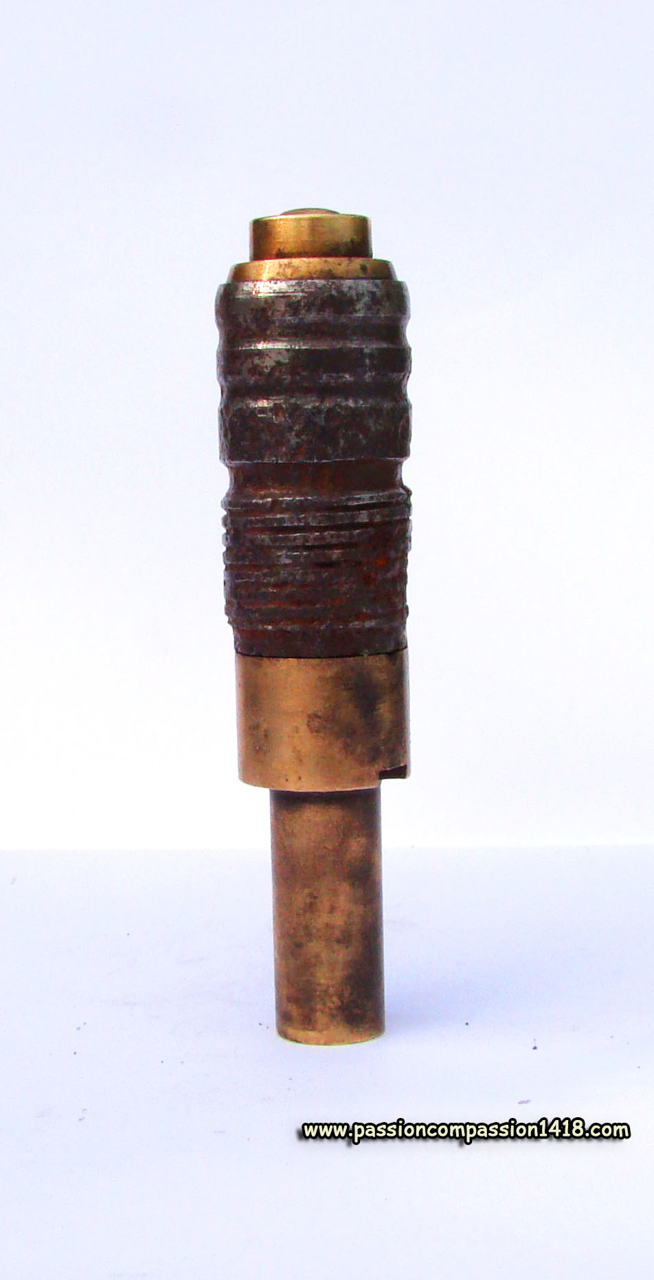 Fusée 24/31 Mod 99 ou 99-08. Remarquer les traces des inscriptions d'origine ainsi que le trait de vis sur la coiffe en acier, qui permettait d'accéder au système d'armement Lejay |