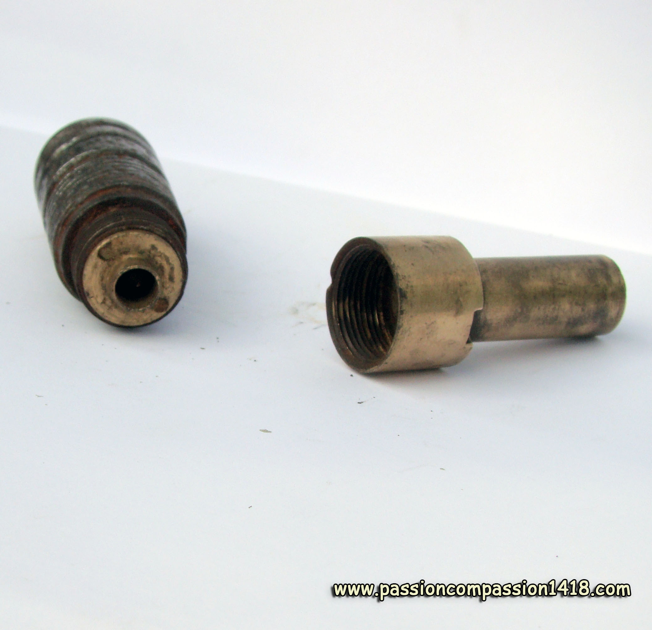 Fusée double effet LD 24/31 Mle 1917 ou fusante Mle 1918. Porte-amorce démonté pour montrer le filetage mâle de la queue |