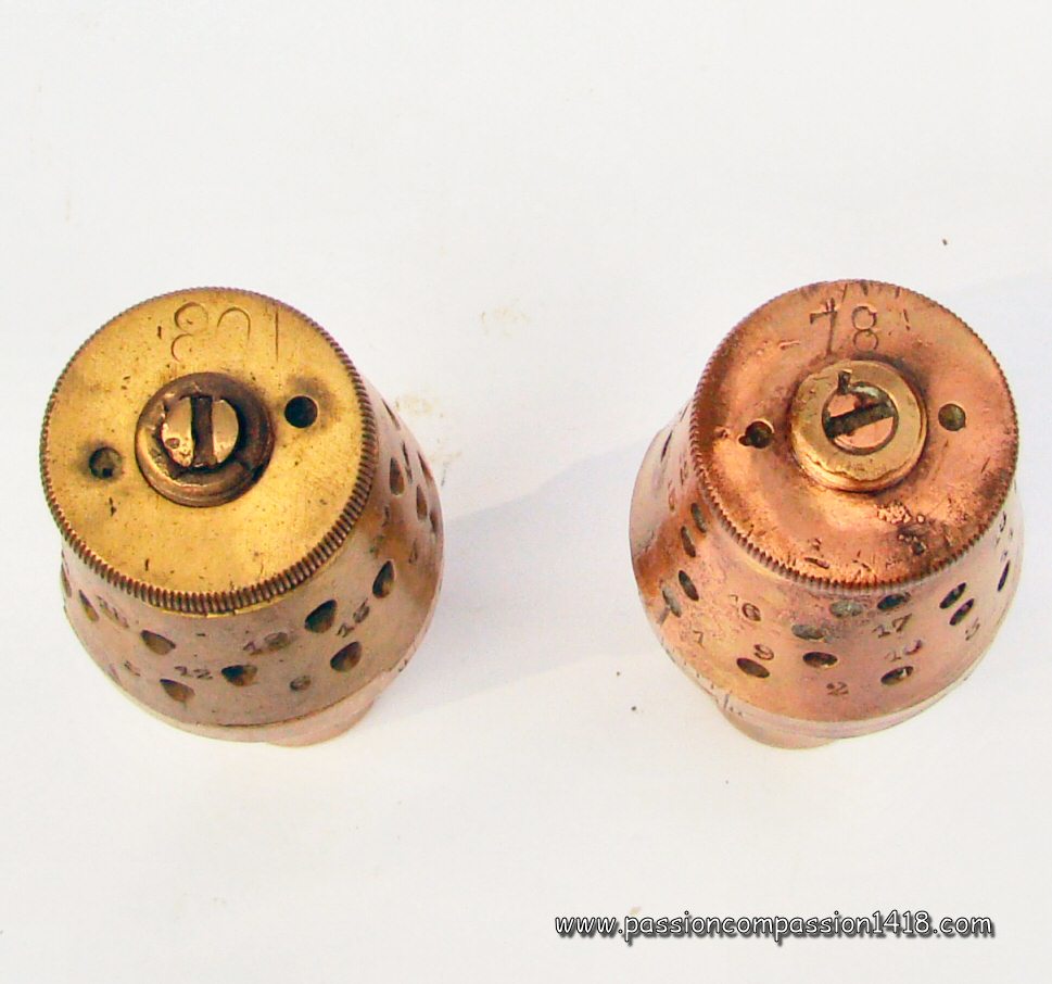 Fusée double effet ou fusante LDA 24/31 Mle 1918 à 10 spires (en bas), comparée à une fusée LD 24/31 Mle 1917 à 9 spires (en haut). Photo Patrice Colin |