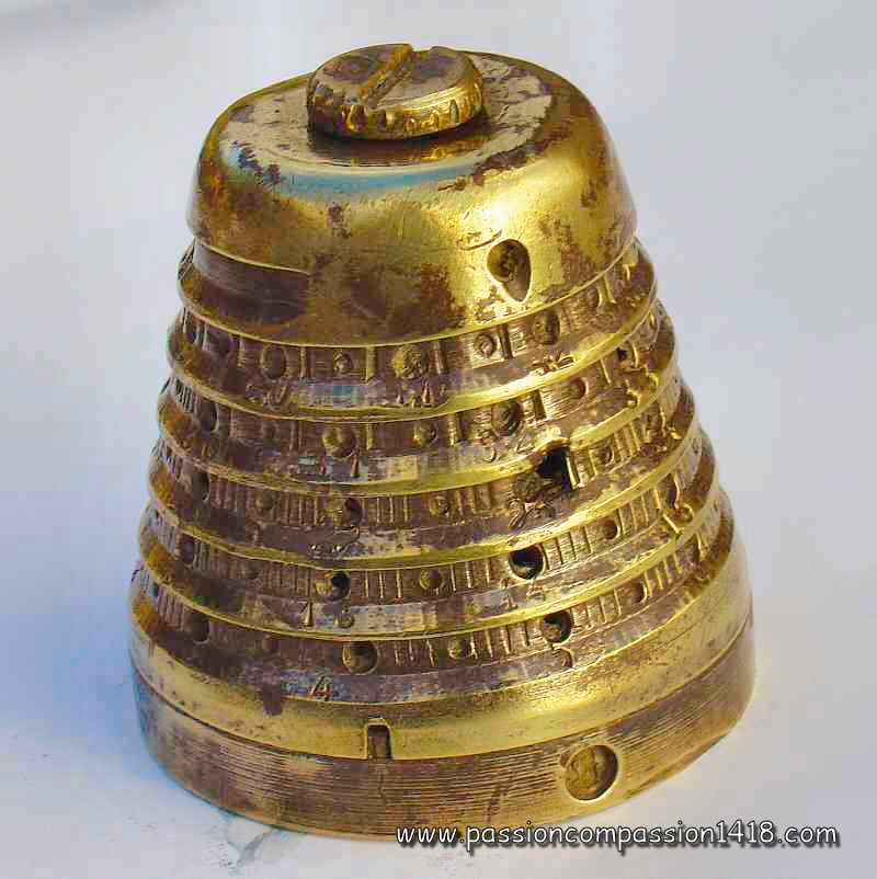 Fusée double effet LD 24/31 Mle 1917 ou fusante Mle 1918. Vue du dessus de la pièce munie de la coiffe protectrice |