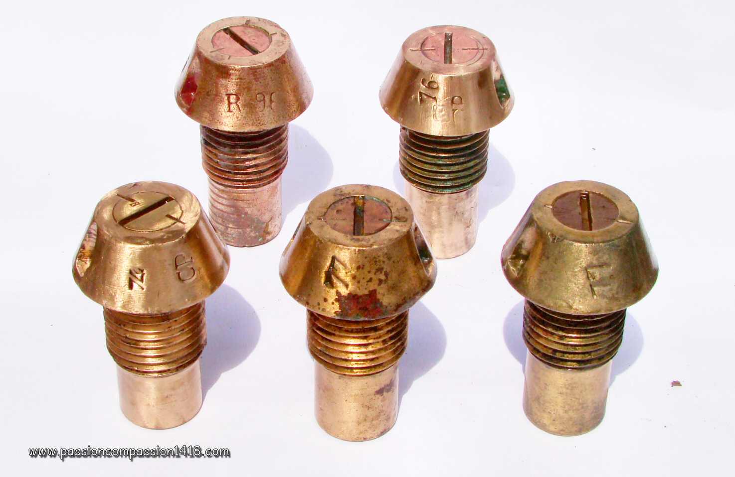 Fusée 25/38 Mod 75 Budin. Les marquages de ces 5 exemplaires donnent plusieurs dates de fabrication ('74', '75', '76' et '77'). |