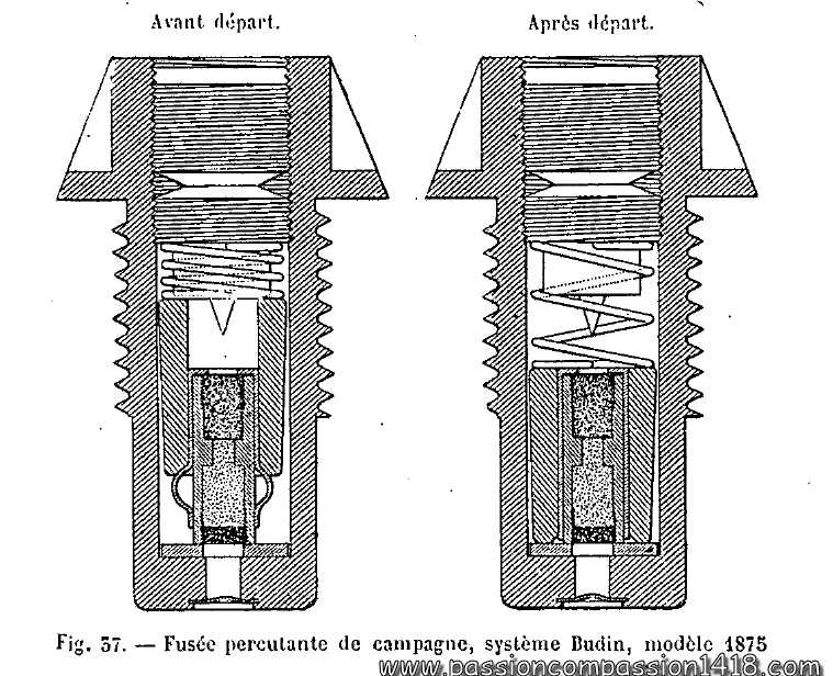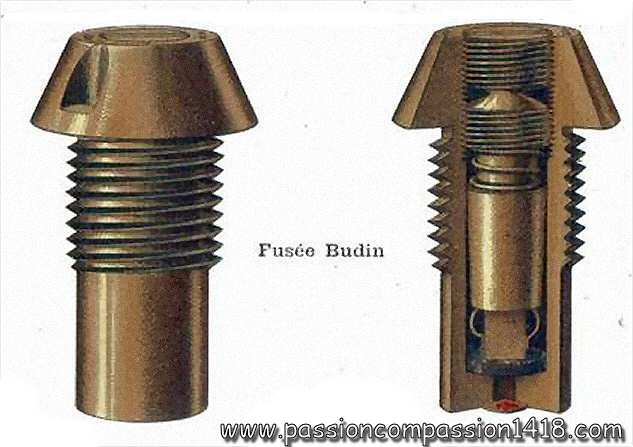 Au départ du coup, l'inertie projetait la masselotte vers le bas, les lames de laiton se comprimaient et laissaient le porte-amorce pénétrer complètement dans le logement central. Ainsi démasquée, l'amorce n'était plus séparée du rugueux que par le ressort de sûreté pendant le vol et l'obus était donc armé. Sous le choc d'arrivée, l'ensemble maintenant solidaire masselotte / porte-amorce était projeté vers l'avant, comprimait le ressort de sûreté, et venait heurter le rugueux, déclenchant l'explosion de l'obus sous l'effet de la flamme de la chambre à poudre sous l'amorce. Le bouchon de tête porte-rugueux était entaillé d'une gorge de rupture, au niveau de laquelle la tête pouvait éventuellement se sectionner à l'impact sans perturber le fonctionnement. Lorsque cette fusée était armée, une simple chute de 50 cm suffisait à la faire fonctionner. Deux modifications (1879 pour la Marine et 1881 pour l'armée de Terre) sont connues et notées sur la fusée par une marque 'M'. La fusée Budin armait les vieux obus explosifs de 5 et de 7, mais aussi ceux de 80, 90 et 95 mm de campagne, ainsi que ceux de 138 mm de Siège. Elle était interchangeable avec la 'Fusée Henriet Mle 1874 et 1874/75 ', et il est vraisemblable que ces fusées obsolètes furent utilisées avec de vieux stocks d'obus tirés par de vieilles bouches à feu rappelées des arsenaux au cours des premiers mois de la Grande Guerre. |