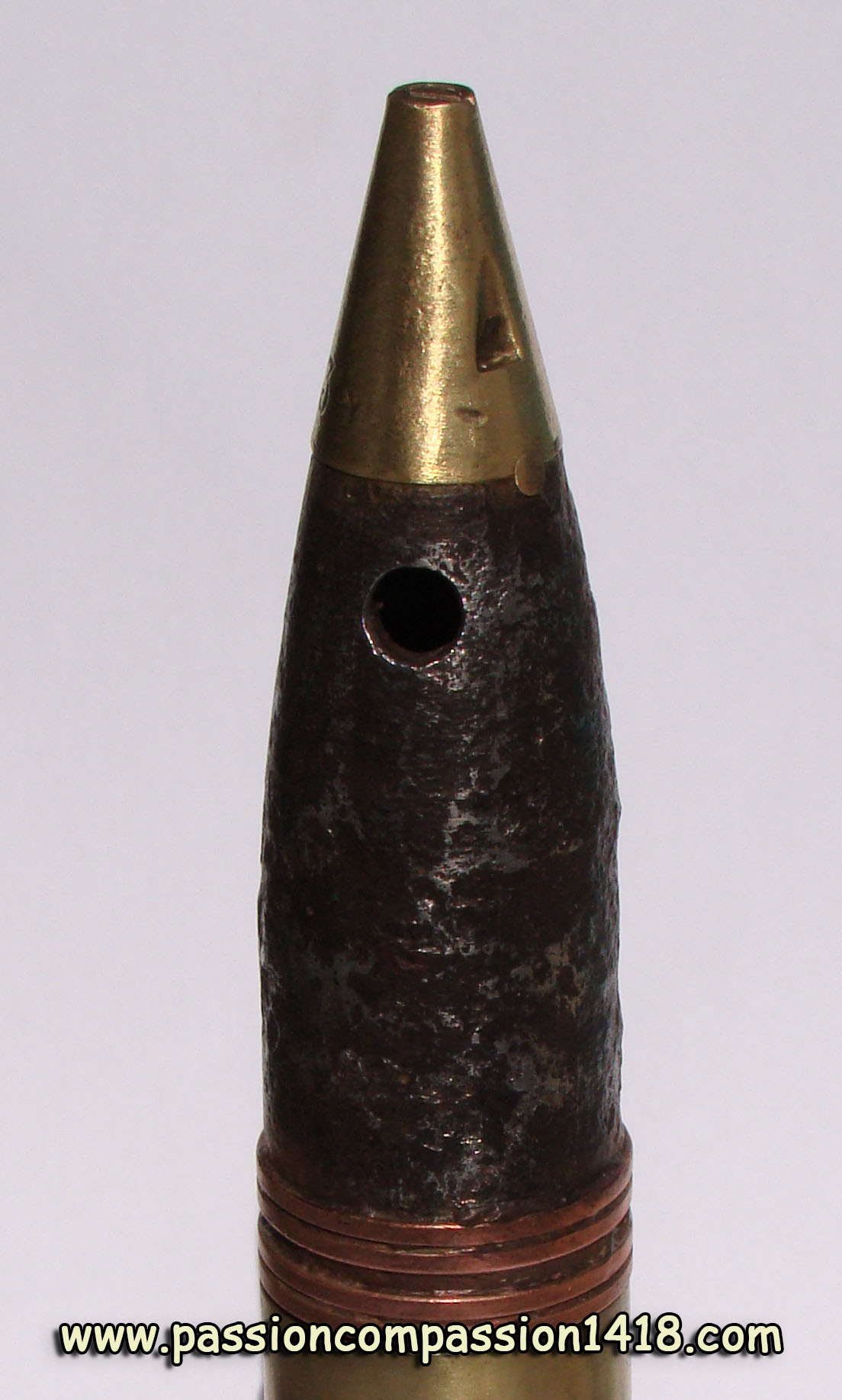 Fusée concutante de 22/24. La fusée montée sur son obus incendiaire de 37 mm qui a été désassemblé de la douille contenant la charge propulsive. |