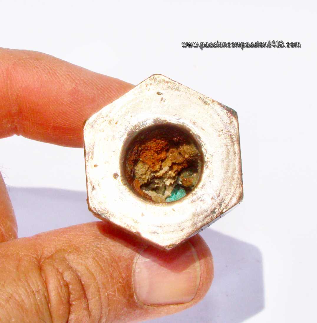 Fusée 25/38 Mod 74/75 Henriet. Vue arrière avec le trou presque central de l'arrière su système percutant, et le trou plus latéral de la chambre à poudre |