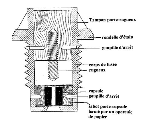 Fusée 30/45 Mod 78-81. Schéma d'époque. La gorge de rupture pratiquée dans le bouchon de tête est bien visible. Elle avait été introduite initialement dans les fusées Budin et était destinée à conserver intacte la partie basse du bouchon et donc le rugueux, si l'énergie du choc d'impact fracturait la tête. |
