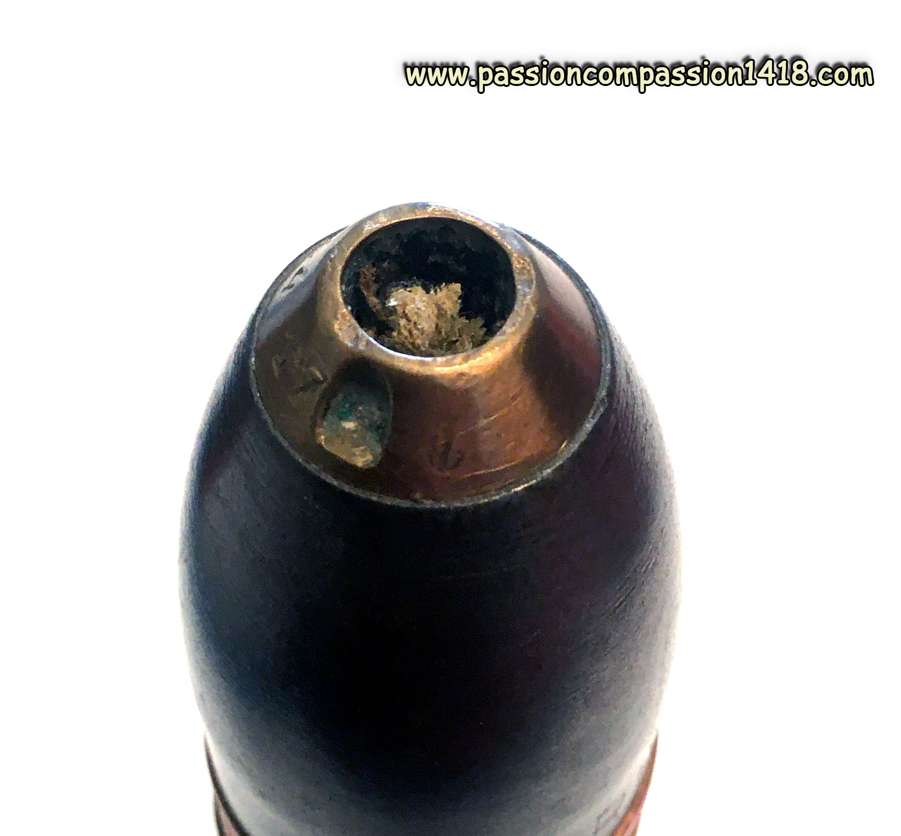 Fusée Mle 77 Desmarest. Vue sur un exemplaire encore sur son obus de 37. La protection du bouchon a disparu, et on peut voir des restes de la pièce on bois |
