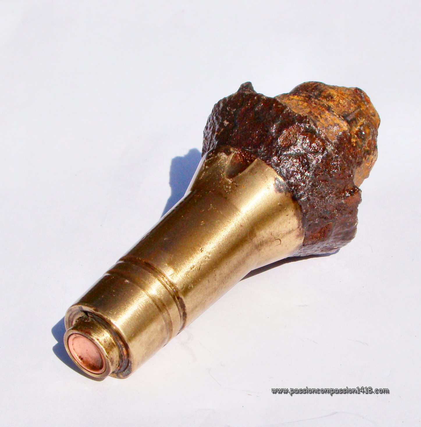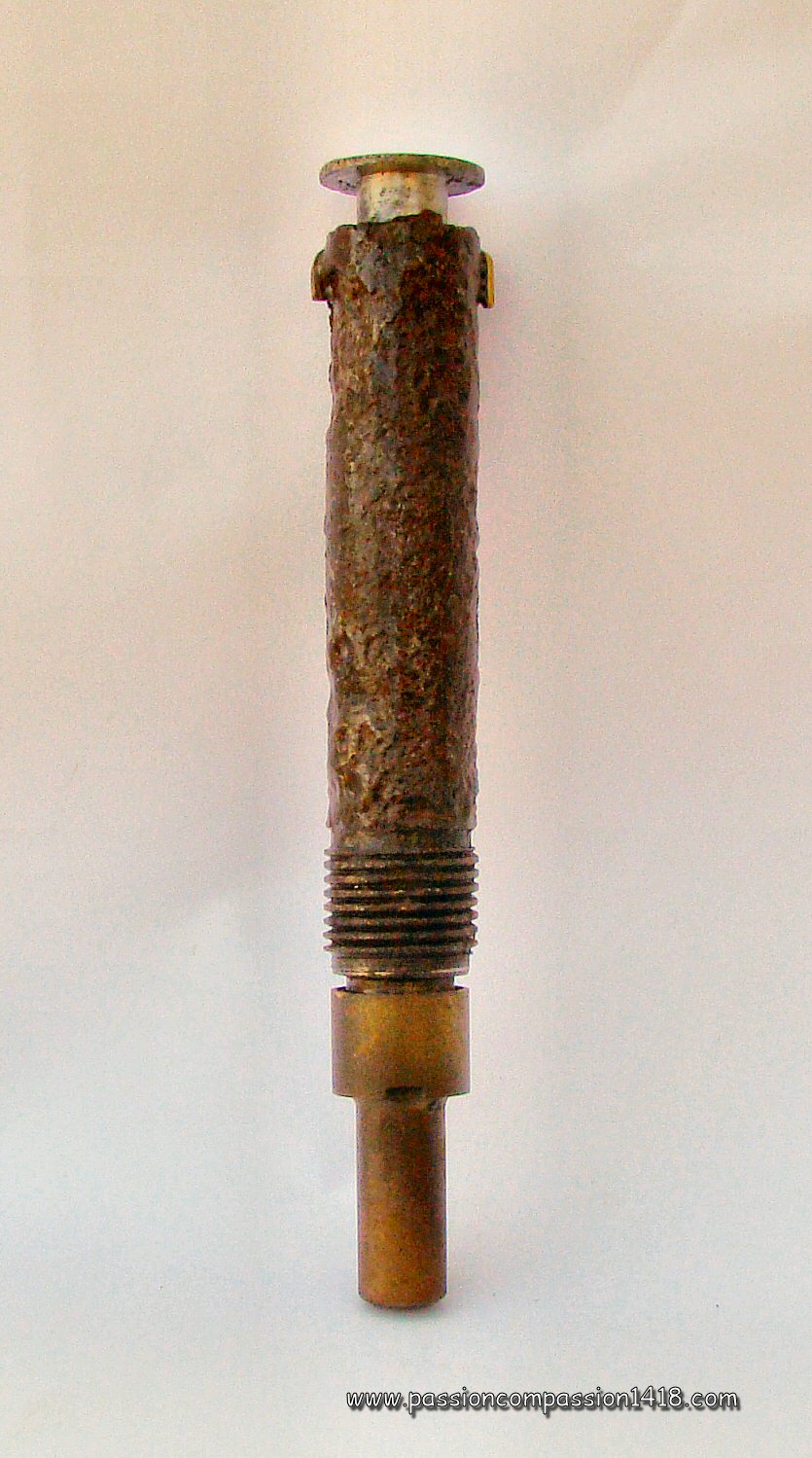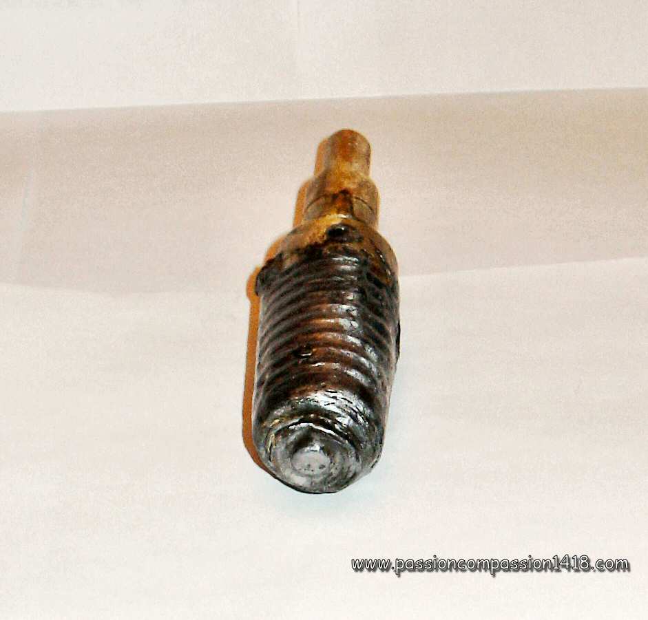 Fusée 40/55 Mod 1880 m93. Cet exemplaire étrange a du servir à l'instruction, et est planté sur un clou en acier. Le filetage de 40mm est remplacé par une section lisse en laiton, mais la longue queue typique des systèmes percutants Siège et Montagne subsiste. |
