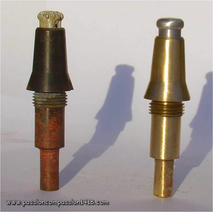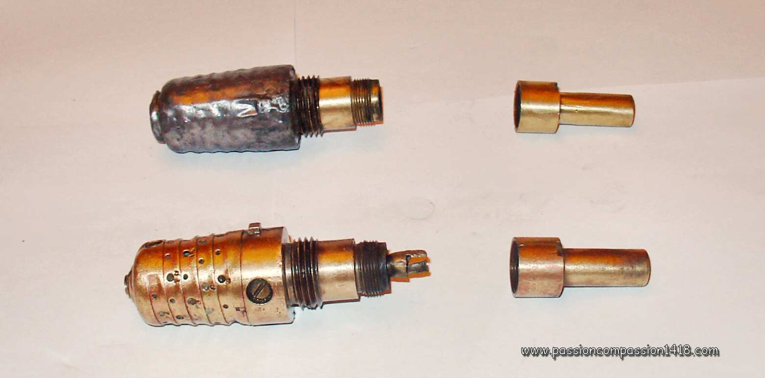 Fusée Schneider Mle 1915 pour moyen calibre. modèle original (à droite) à côté de sa variante (à gauche) non identifiée et observée en Champagne. |