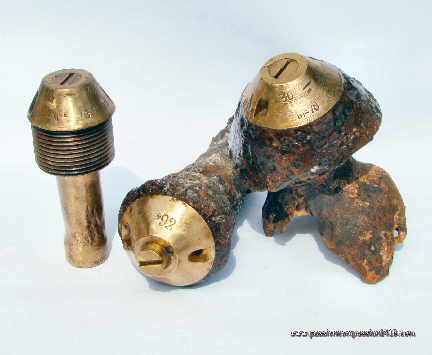 Fusée 30/45 Mod 78-81. Divers exemplaires dont un est encore accompagné de restes de l'obus |