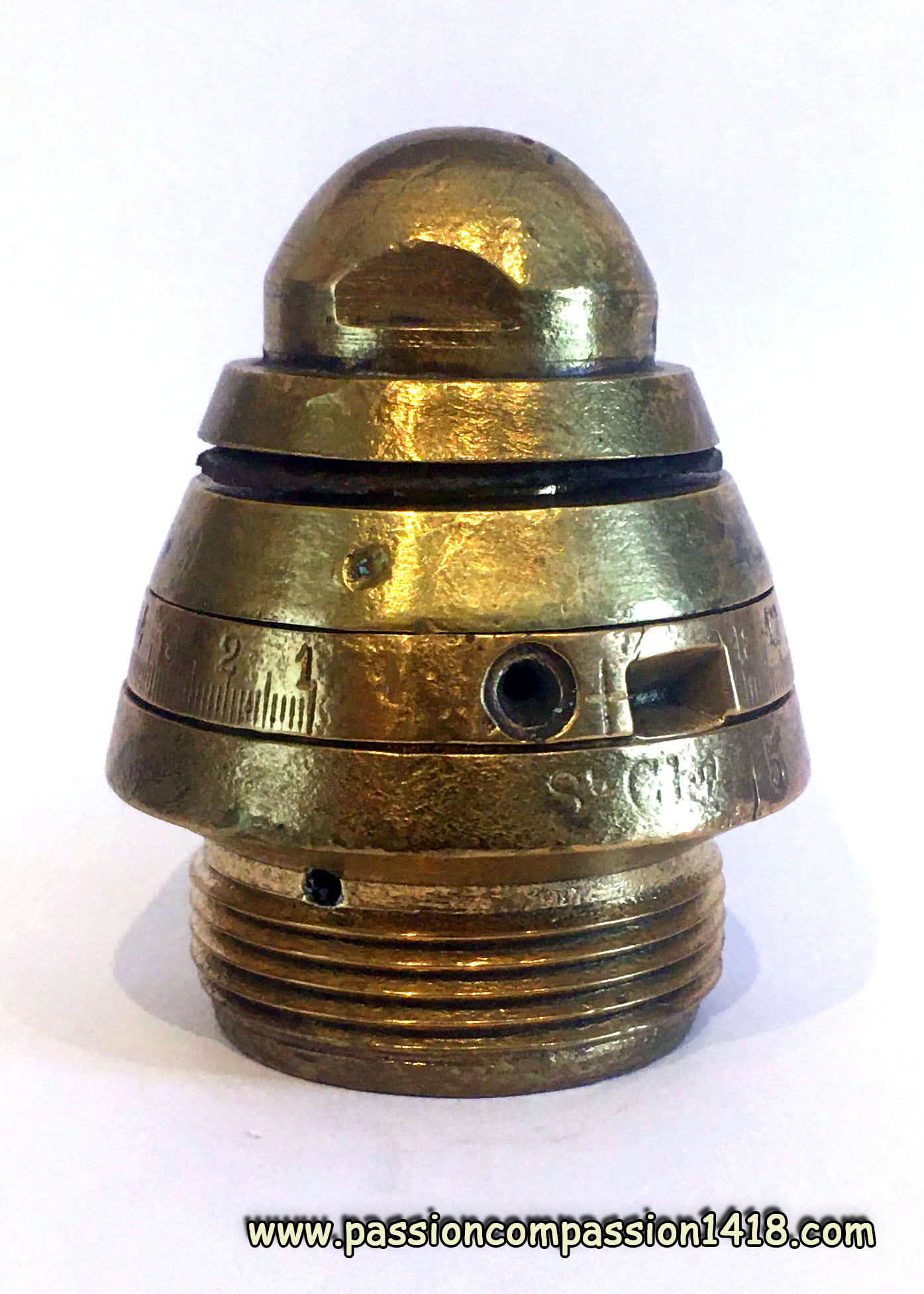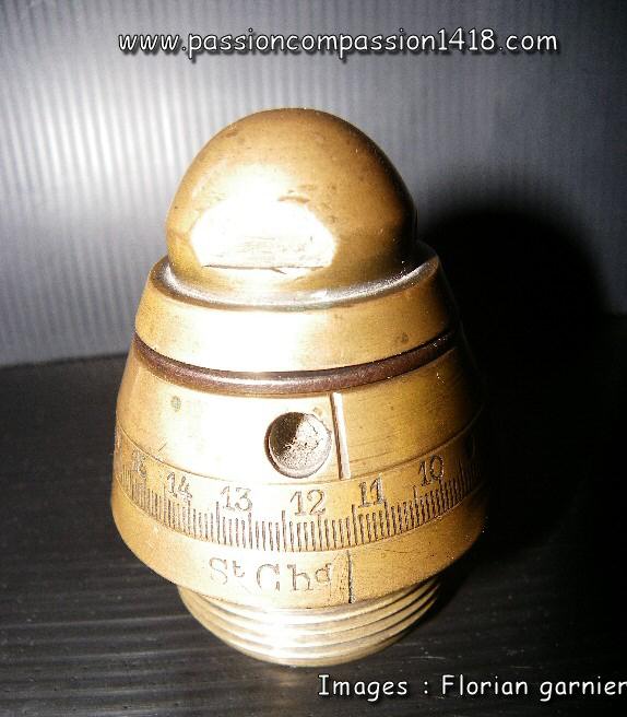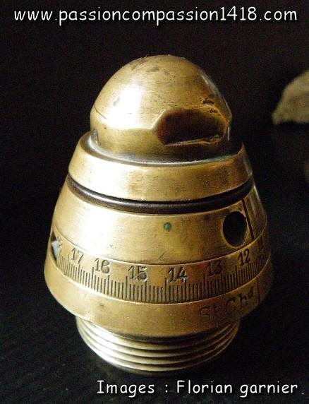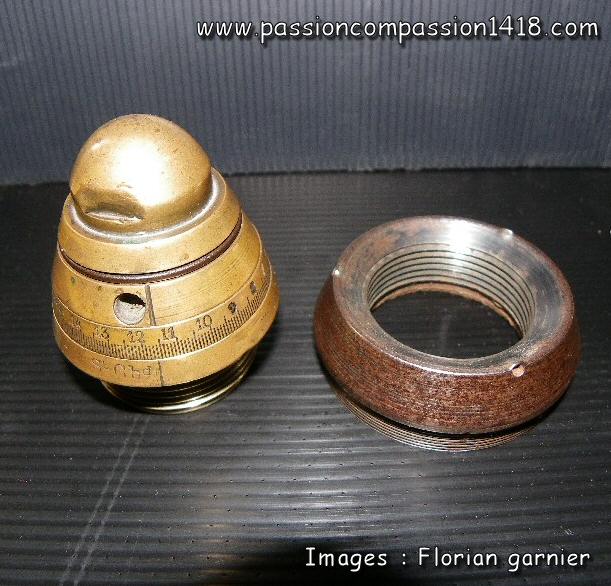 Fusée Schneider Mle 1915 pour moyen calibre. Associée à l'amorce de détonateur spécifique, de conception Schneider également. (Photo Luc Malchair) |